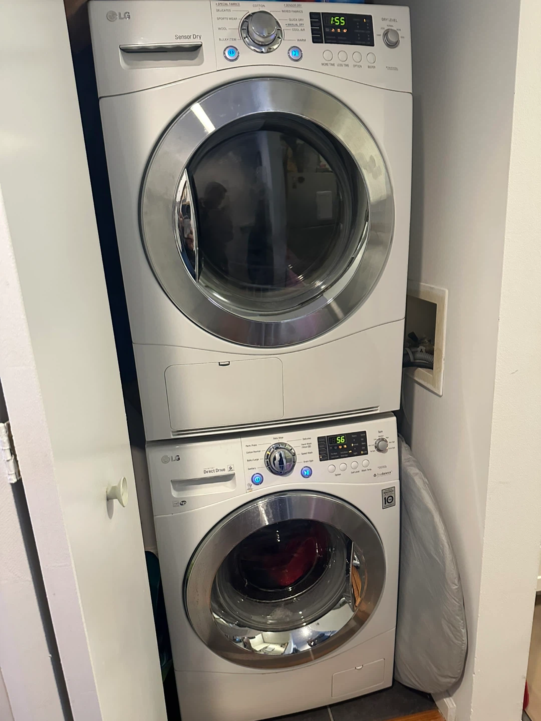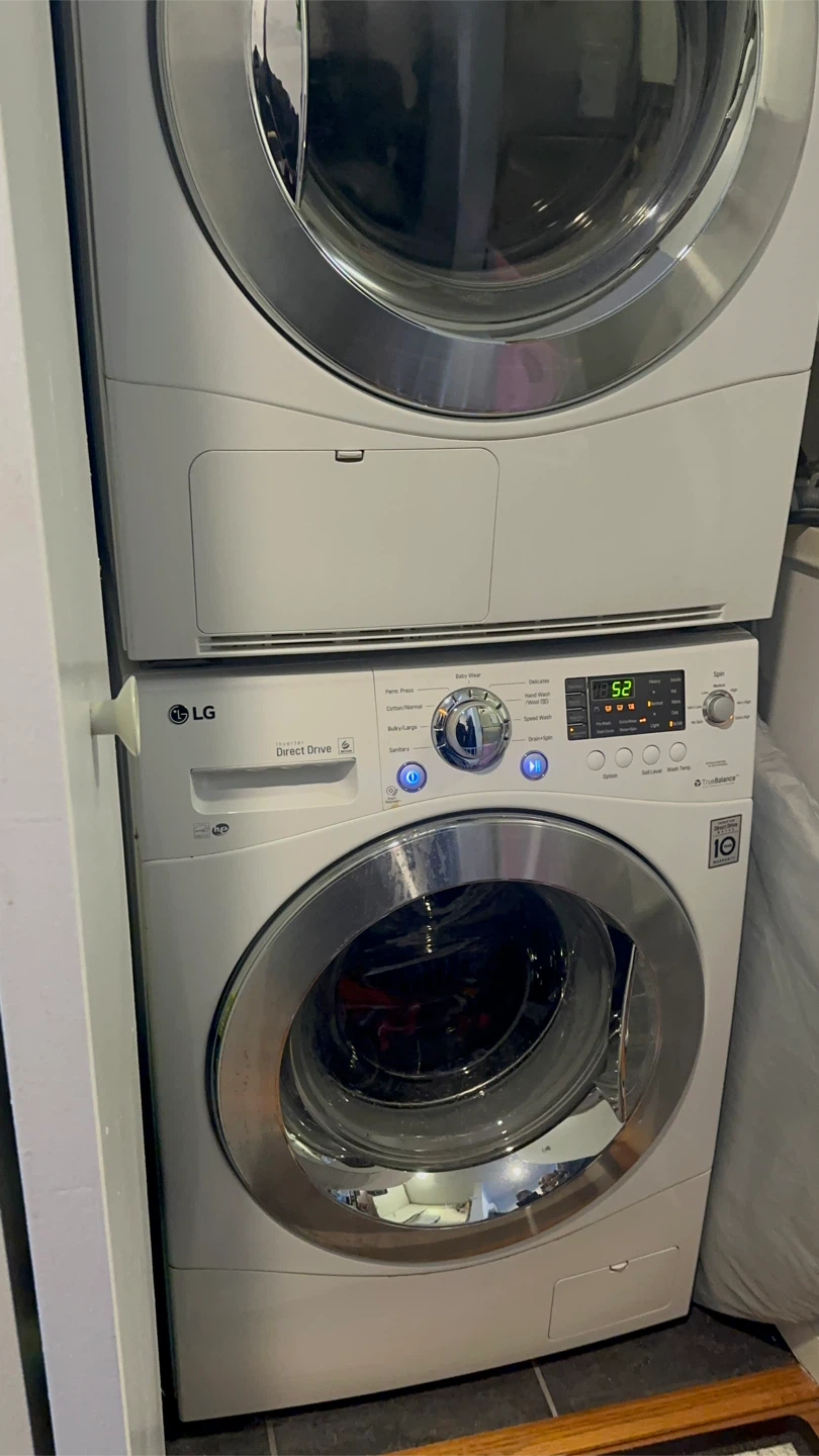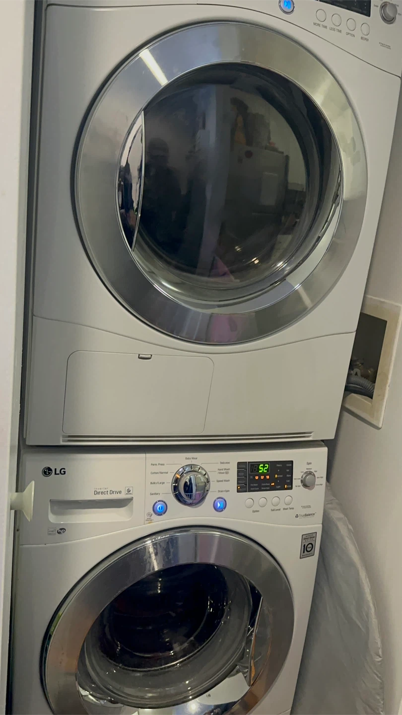 Selling an LG Washer and Dryer combo in great condition! It's a space-saving solution for your laundry needs. The washer features Direct Drive technology, and the dryer has Sensor Dry for efficient performance