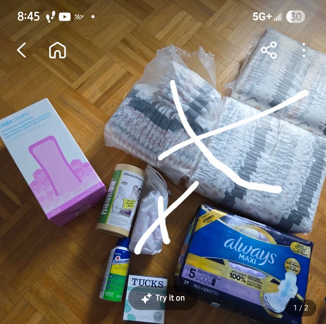 Included pack maxi pads, tucks pads, solarcaine, haakaa breast pump, Frida mom cold pads, 1 mam pack soothers and 1 pack nuk soother