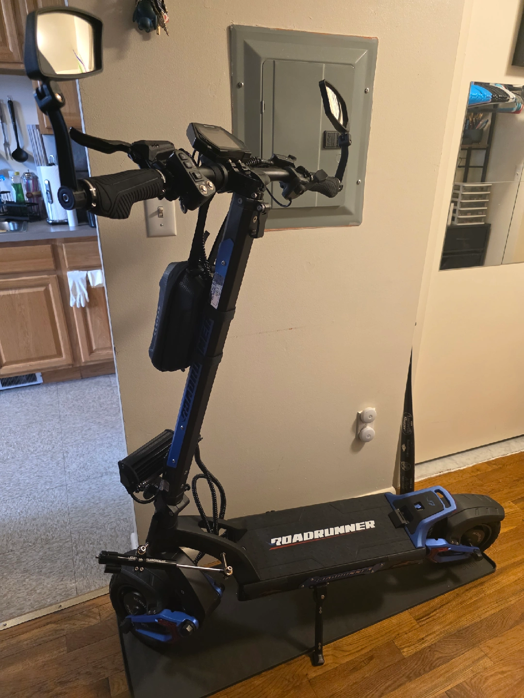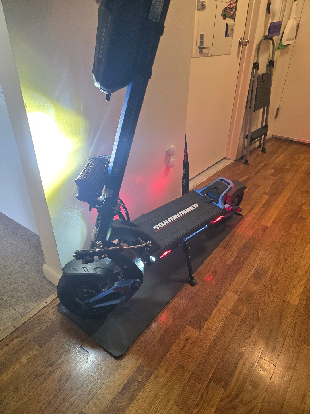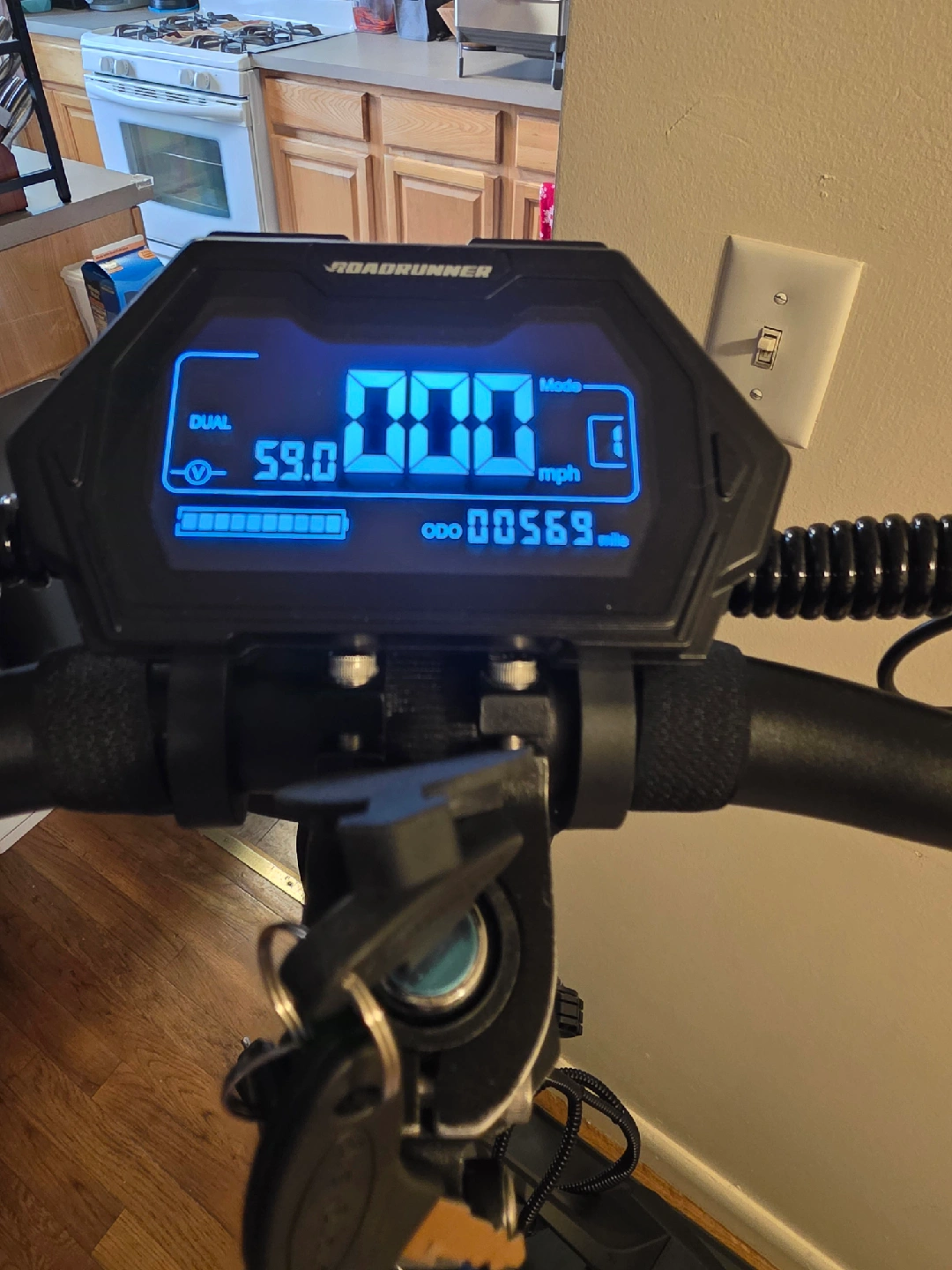 Selling a Roadrunner electric scooter! It looks to be in great condition and ready for a new owner. The display shows a speed of 59.0 mph and an odometer reading of 00569 miles. It also comes with a bag attached to the front with tools to fix. I also installed high beam yellow fog lights. Weight: 88 lbs (with battery installed) Weight : 70 lbs (with battery removed) Max load: 330 lbs Max speed Up to 50 MPH (depending on environment, climb, weight and driving habits) Range: Up to 60 miles (depending on environment, climb, weight, and driving habits) Max climb 32° incline
