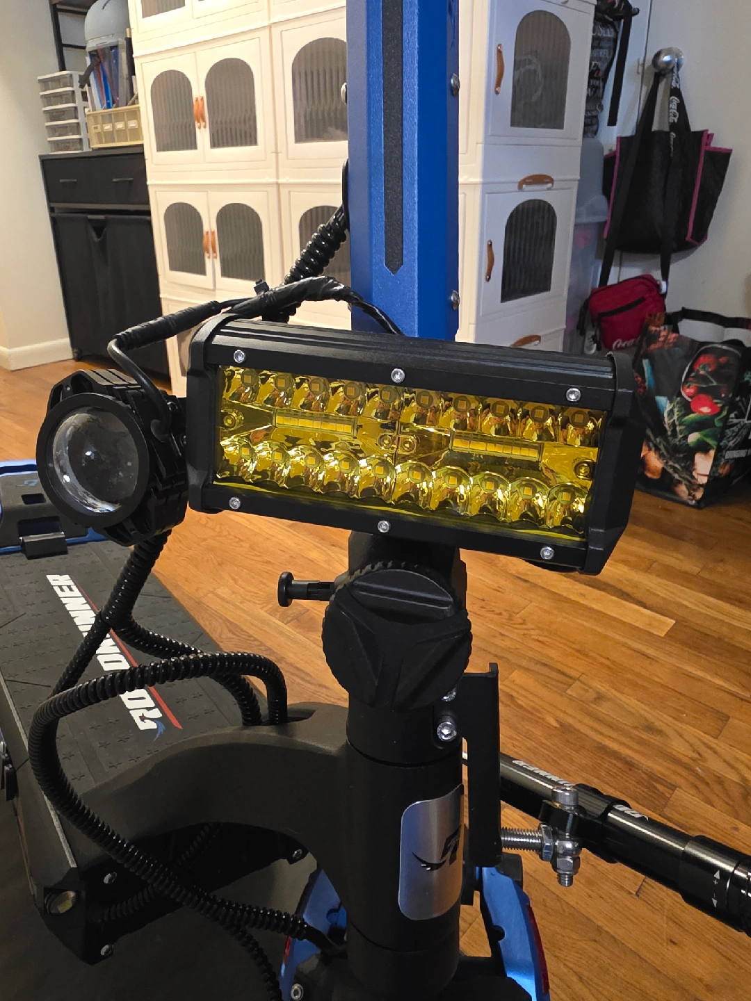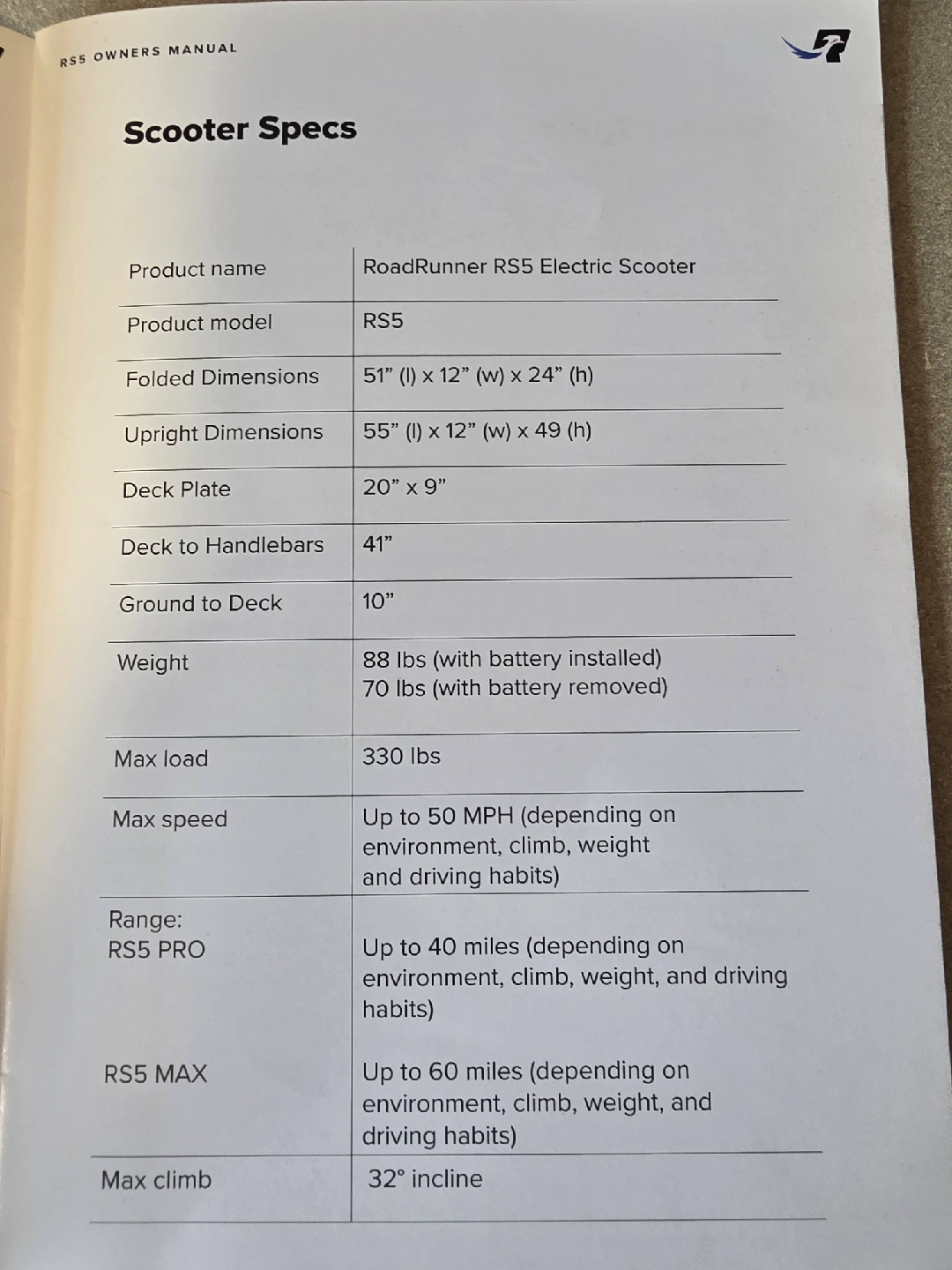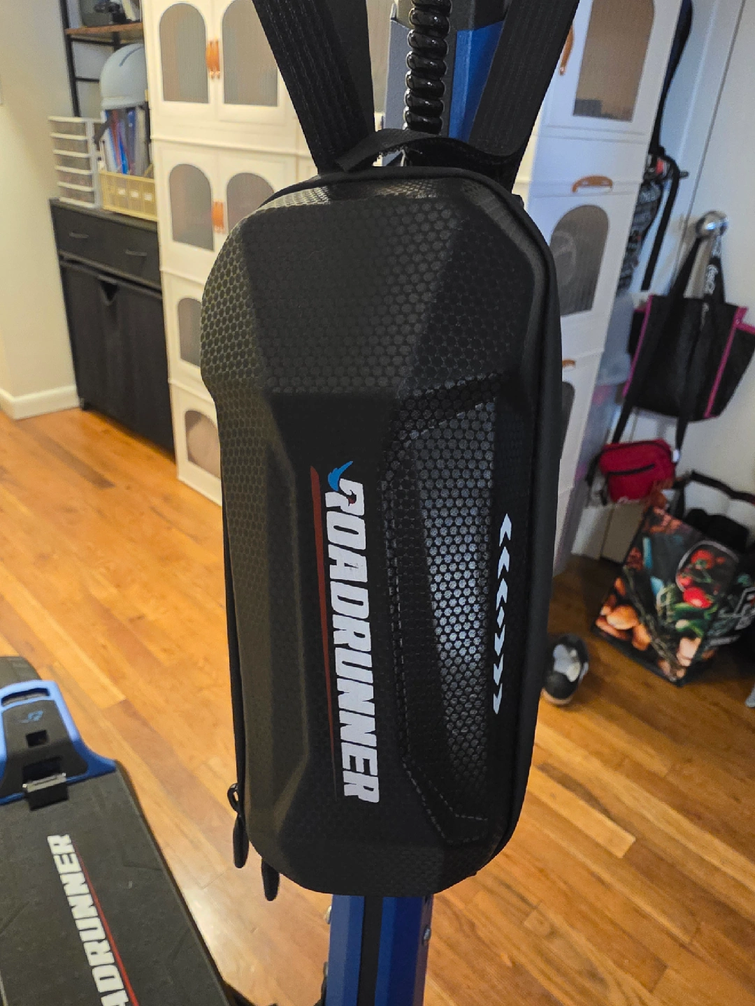 Selling a Roadrunner electric scooter! It looks to be in great condition and ready for a new owner. The display shows a speed of 59.0 mph and an odometer reading of 00569 miles. It also comes with a bag attached to the front with tools to fix. I also installed high beam yellow fog lights. Weight: 88 lbs (with battery installed) Weight : 70 lbs (with battery removed) Max load: 330 lbs Max speed Up to 50 MPH (depending on environment, climb, weight and driving habits) Range: Up to 60 miles (depending on environment, climb, weight, and driving habits) Max climb 32° incline