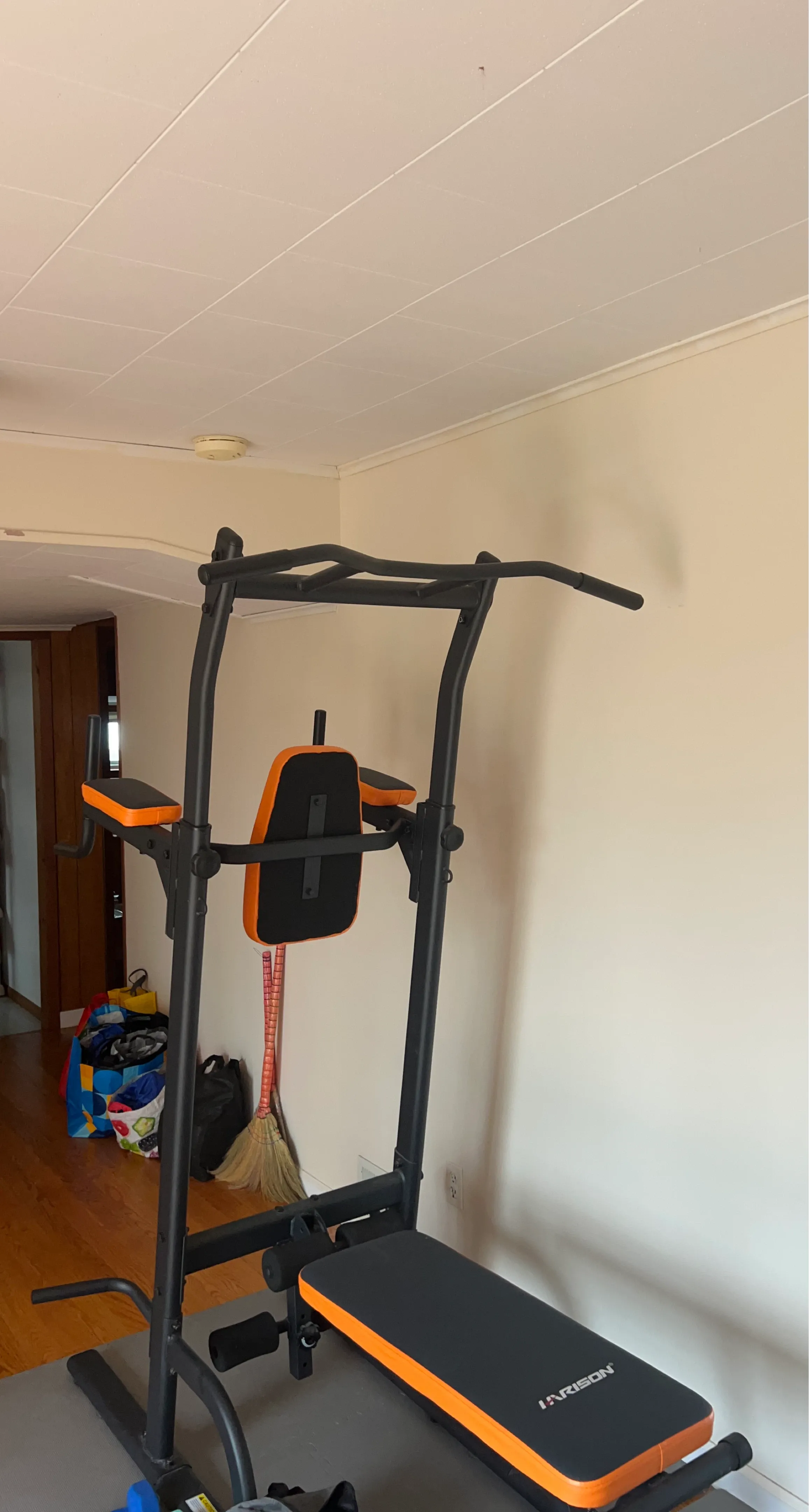 This is a HARISON power tower workout station. It's designed for home fitness and strength training. The station includes a pull-up bar, dip station, and sit-up bench. Black and orange color scheme.