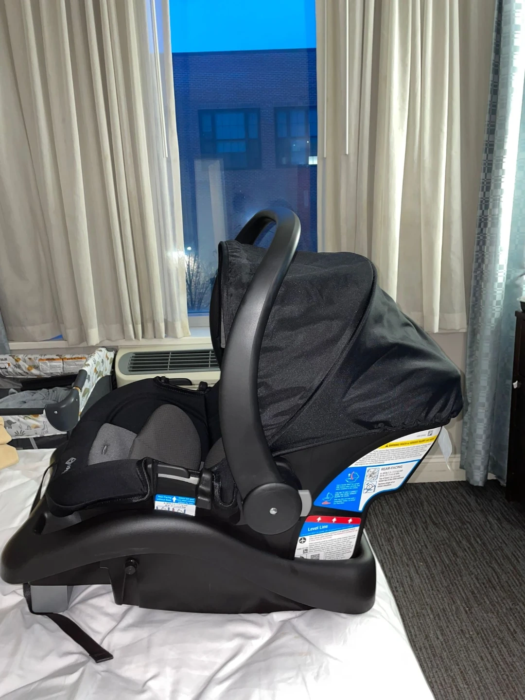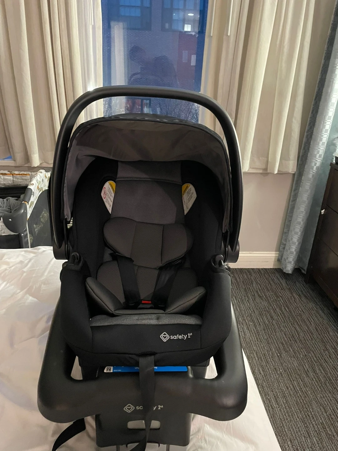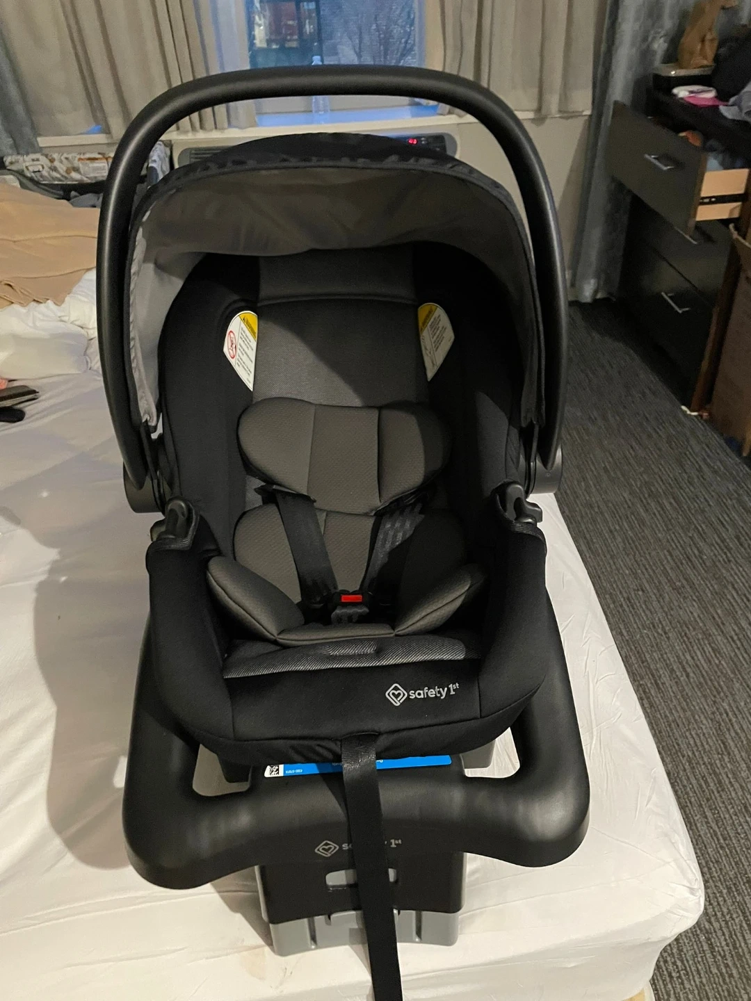 This is a black Safety 1st infant car seat and base. It includes a 5-point harness for safety. It's designed for infants and is compatible with many strollers.