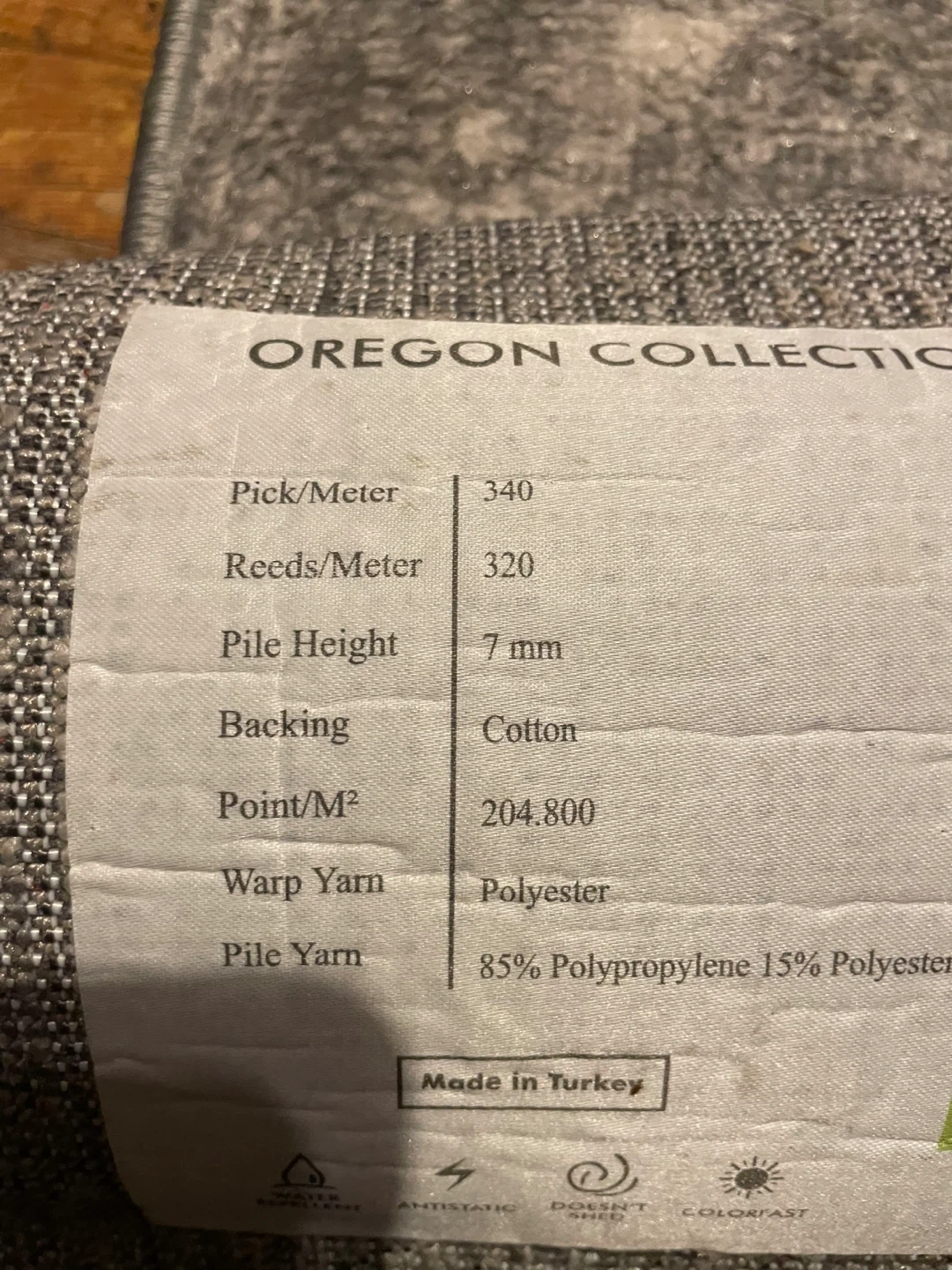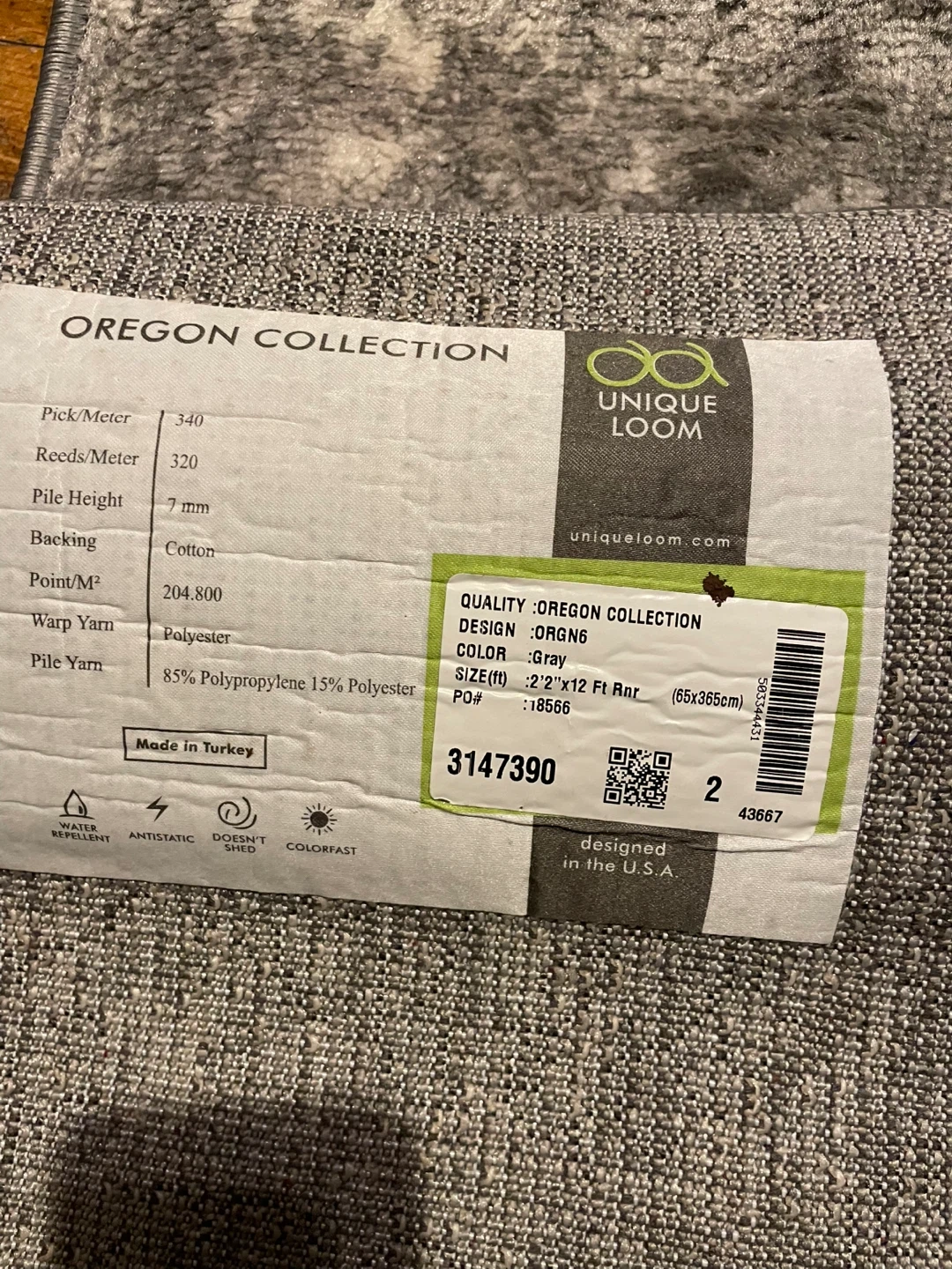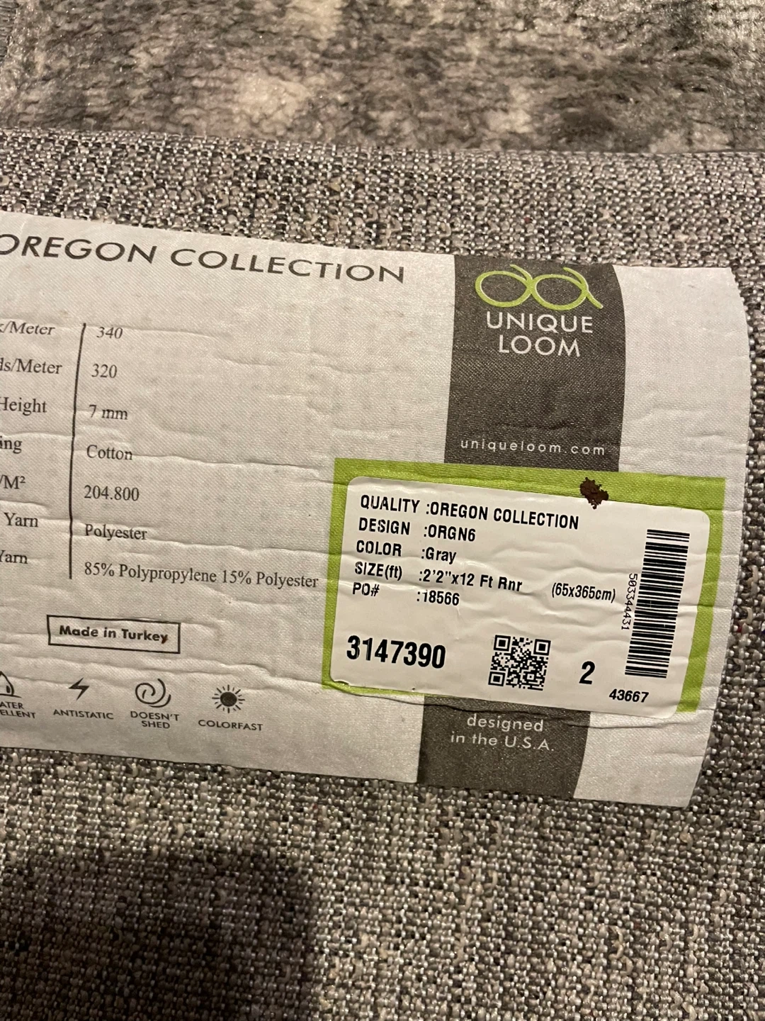 This is a gray runner rug from the Oregon Collection. It's 2'2" x 12 ft in size and made with an 85% Polypropylene, 15% Polyester blend. The backing is cotton and the pile height is 7 mm. It's water-resistant, antistatic, and doesn't shed!