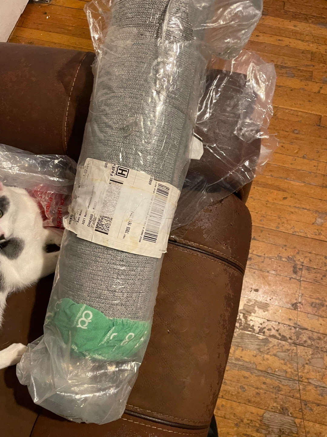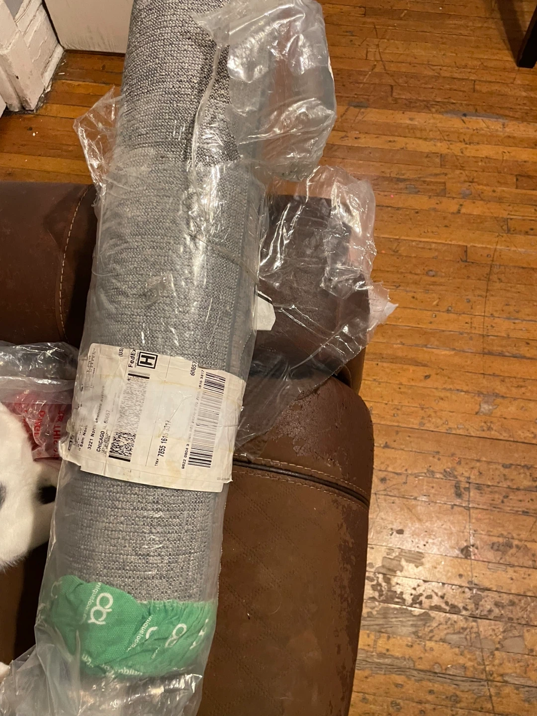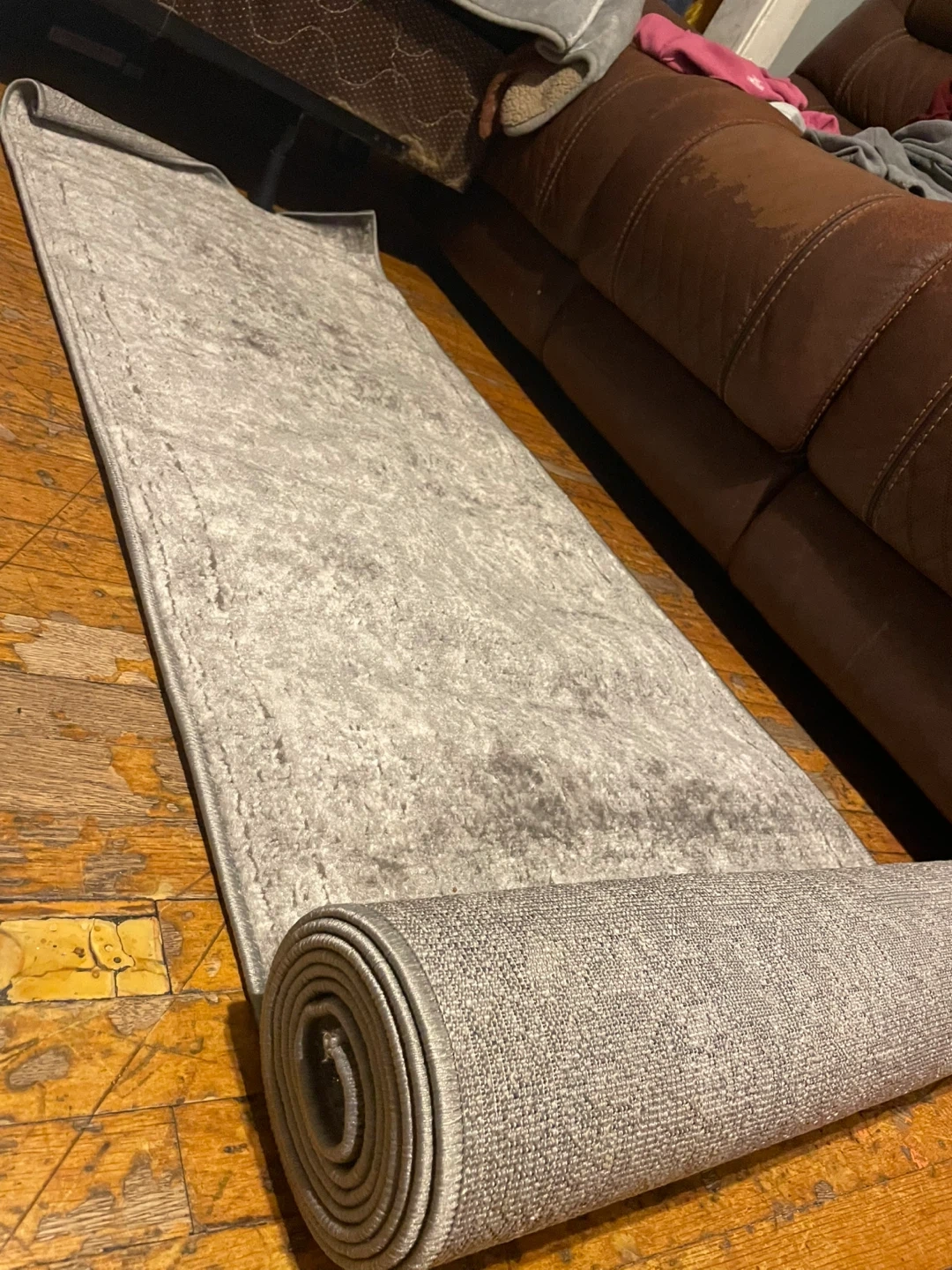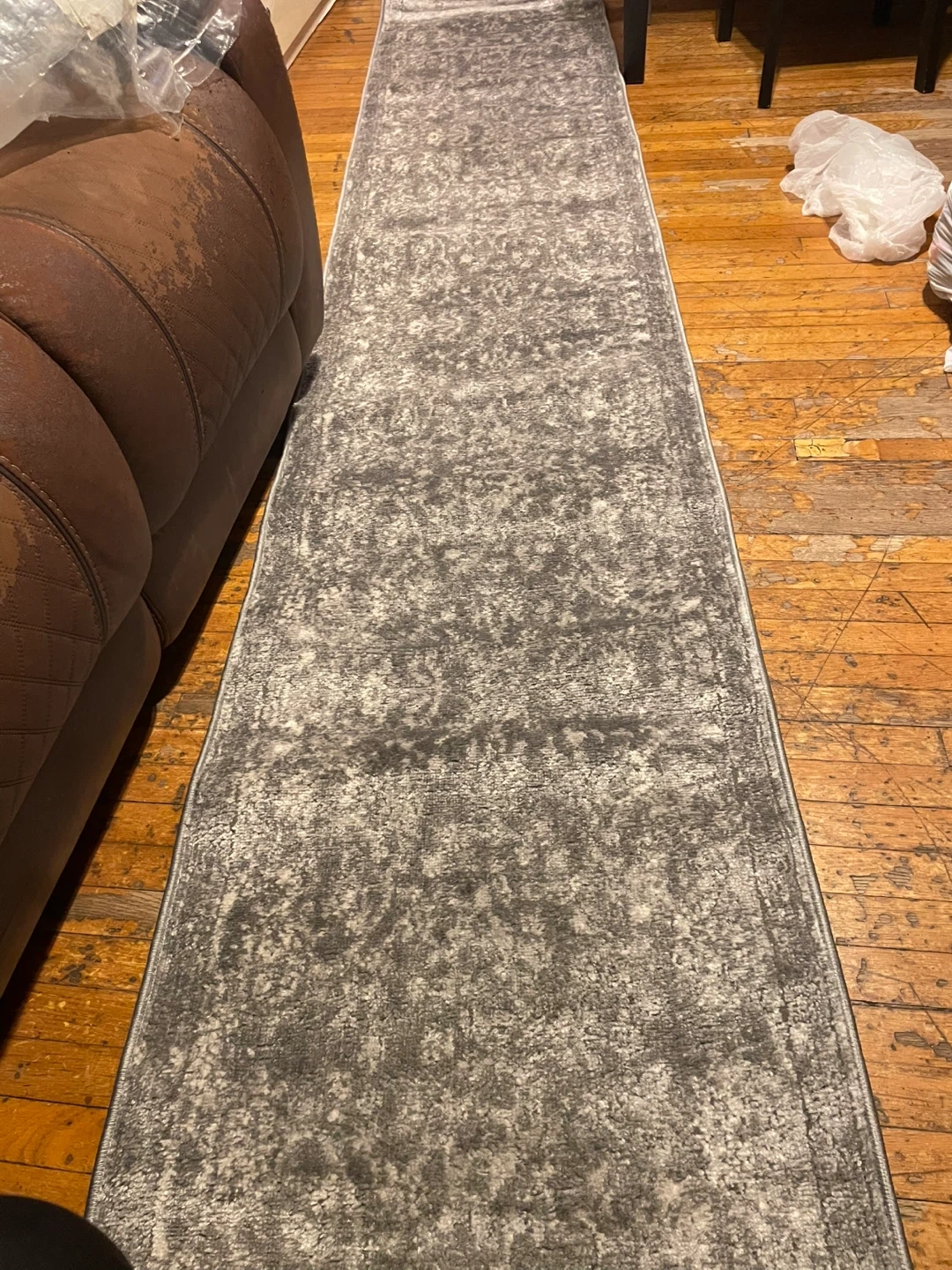 This is a gray runner rug from the Oregon Collection. It's 2'2" x 12 ft in size and made with an 85% Polypropylene, 15% Polyester blend. The backing is cotton and the pile height is 7 mm. It's water-resistant, antistatic, and doesn't shed!