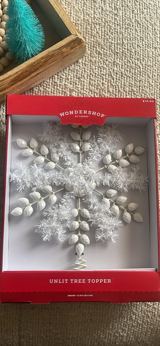 Selling a brand new Wondershop unlit tree topper! It's still in its original packaging and ready to add some sparkle to your holiday decor. The box says it's 12 inches in height. Originally bought for $10!