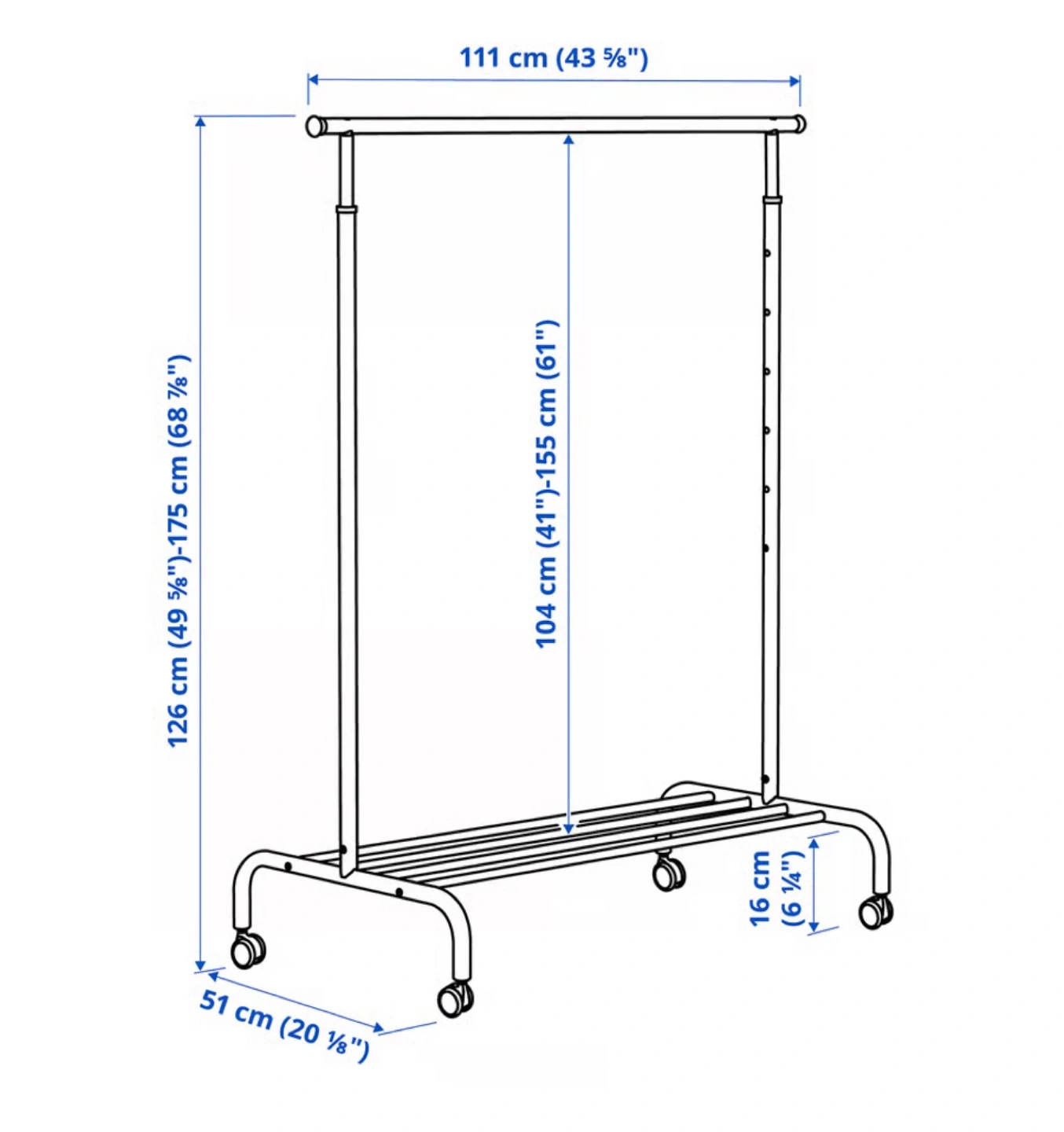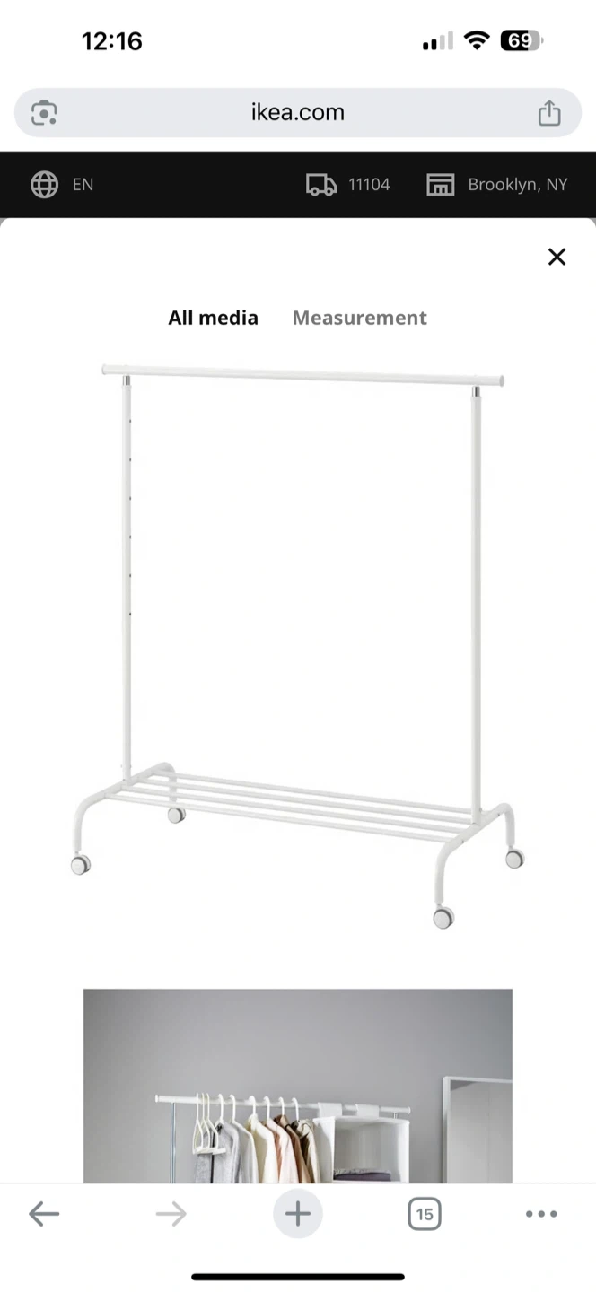Selling a white IKEA Rigga clothes rack. It's in great condition and ready to help organize your clothes! The dimensions are approximately 43 3/4" wide, adjustable height from 49 5/8" to 68 7/8", and 20 1/8" deep