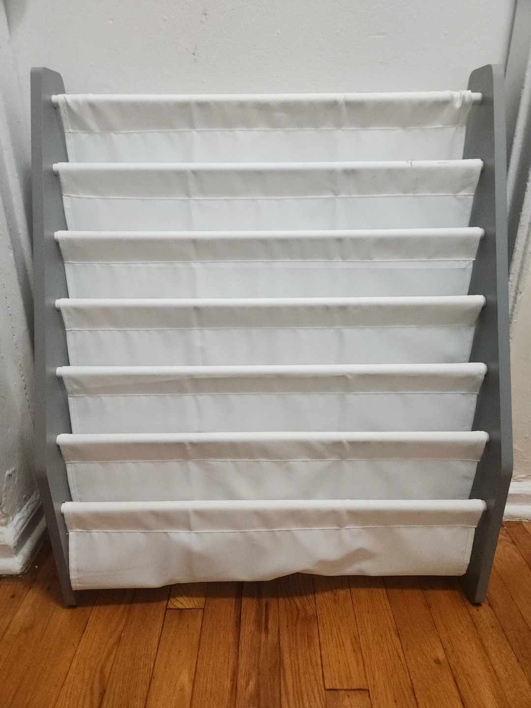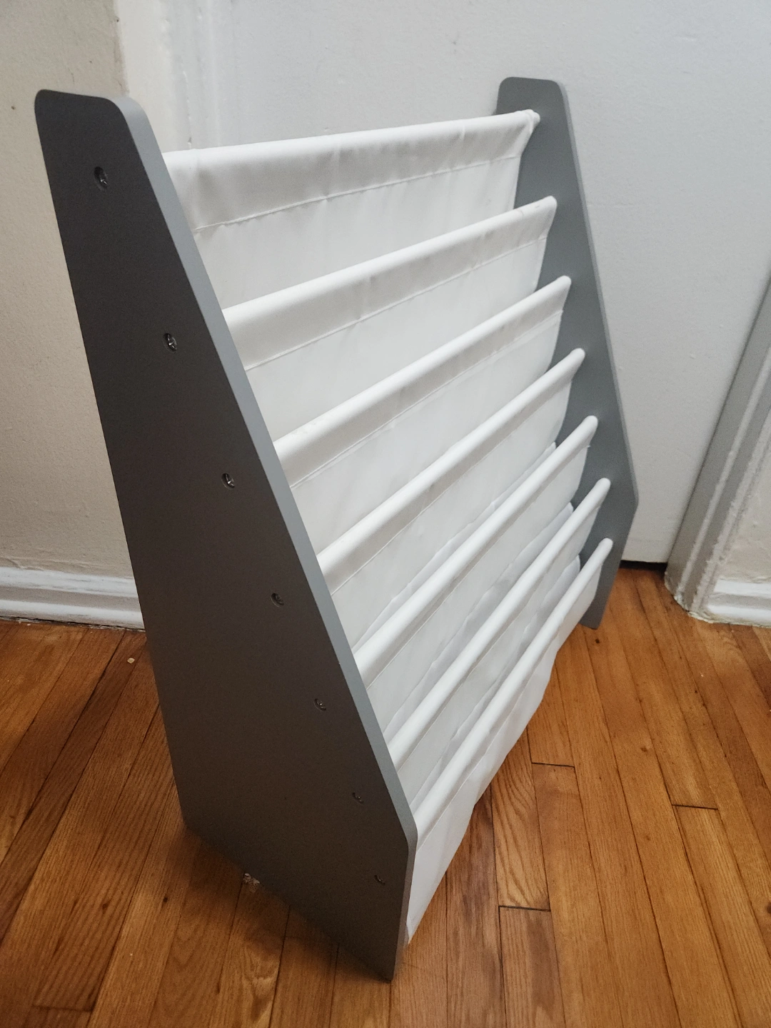 Grey Kids Book Organizer with White Fabric Pockets