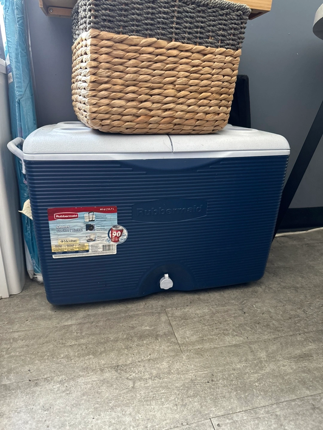 Selling a Rubbermaid cooler with a 60 qt (56.7 L) capacity. It features a drain plug for easy emptying and is in good condition. Perfect for picnics, camping, or any outdoor event!