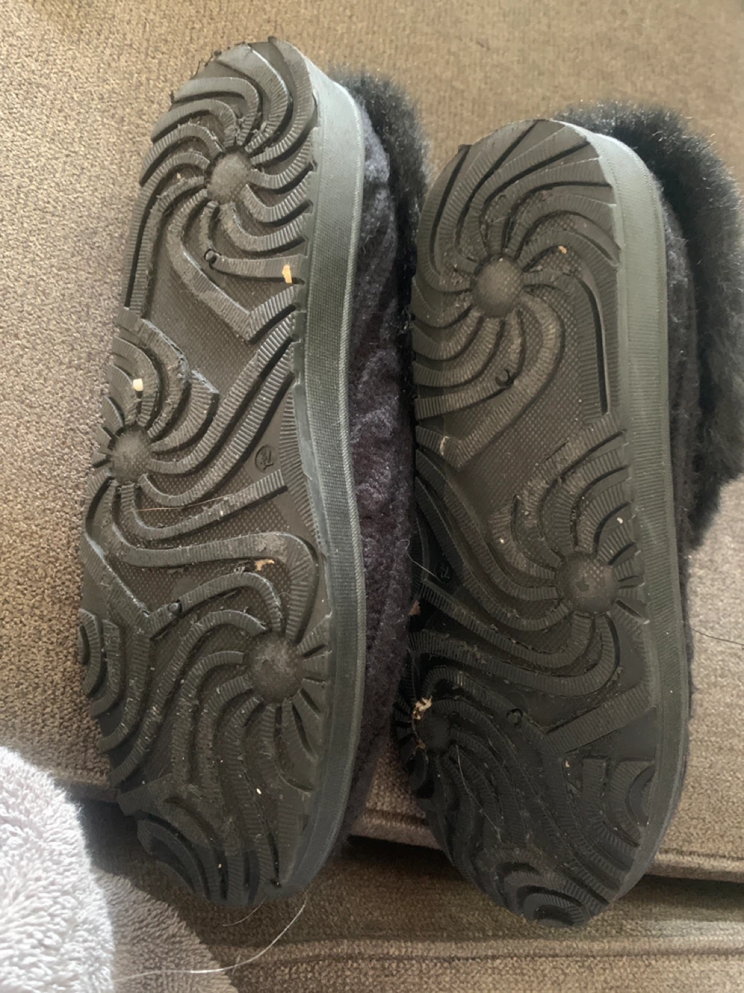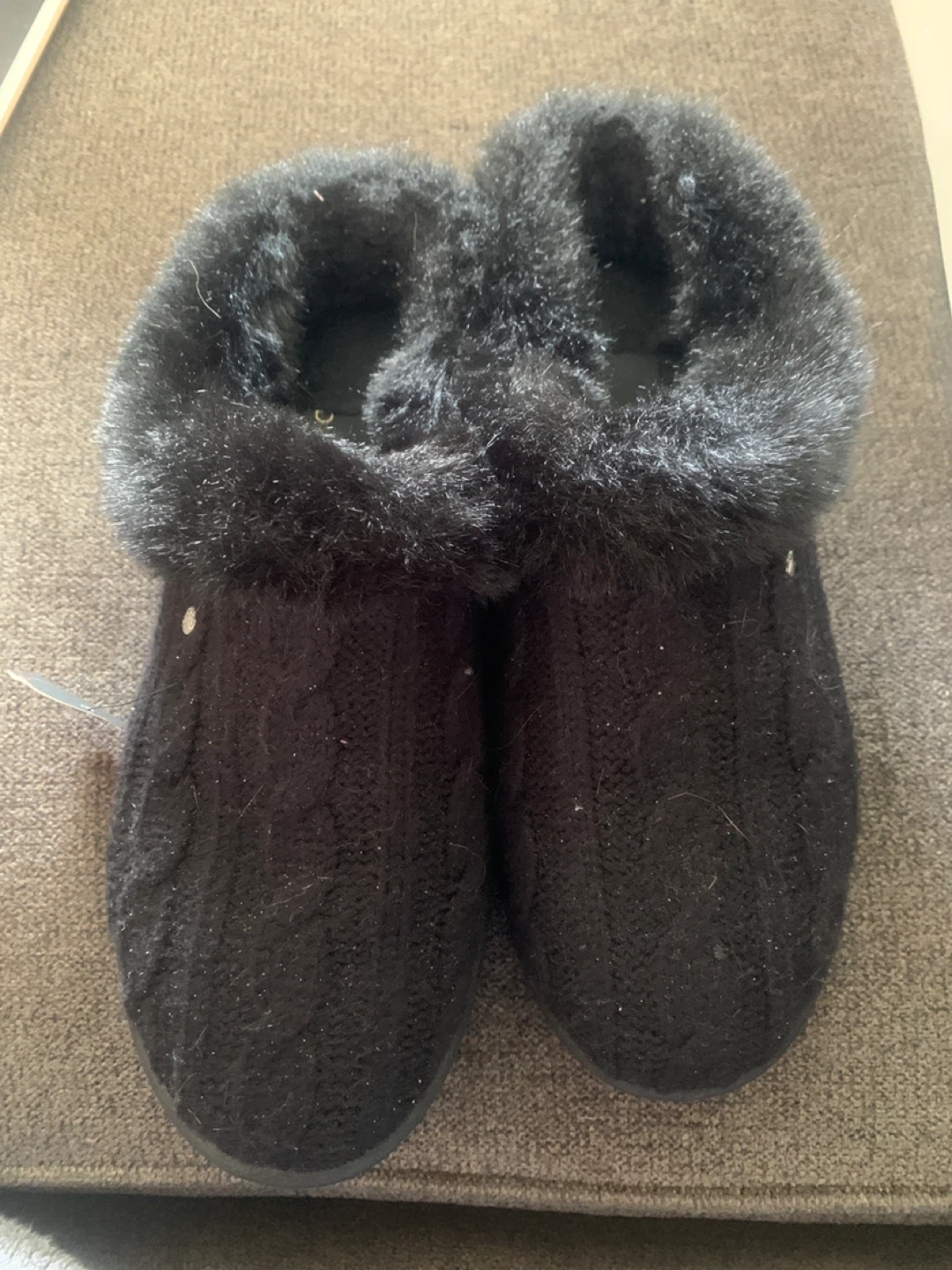 Cozy black cable knit slippers with a plush faux fur lining. They're perfect for keeping your feet warm around the house. The rubber sole provides durability. Slip them on for ultimate comfort! Excellent condition