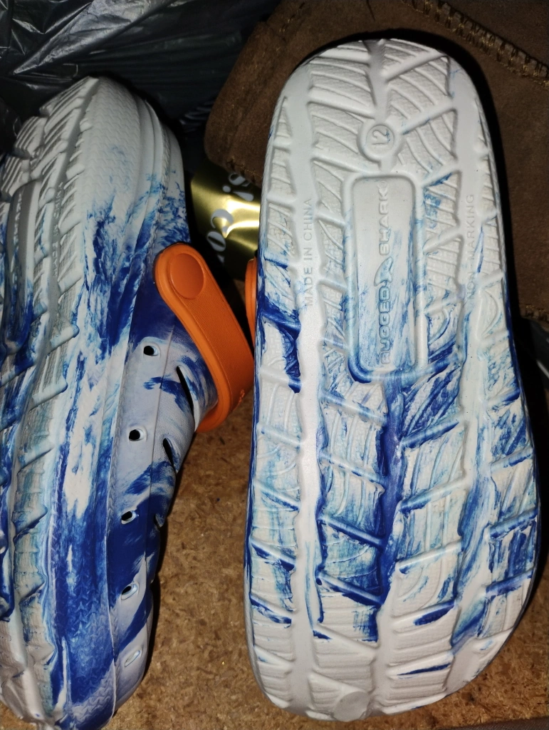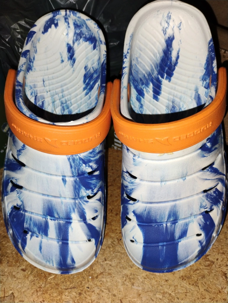 15Get ready for summer with these Rugged Shark clogs! They feature a unique marble blue and white pattern with an orange accent. Size 12.