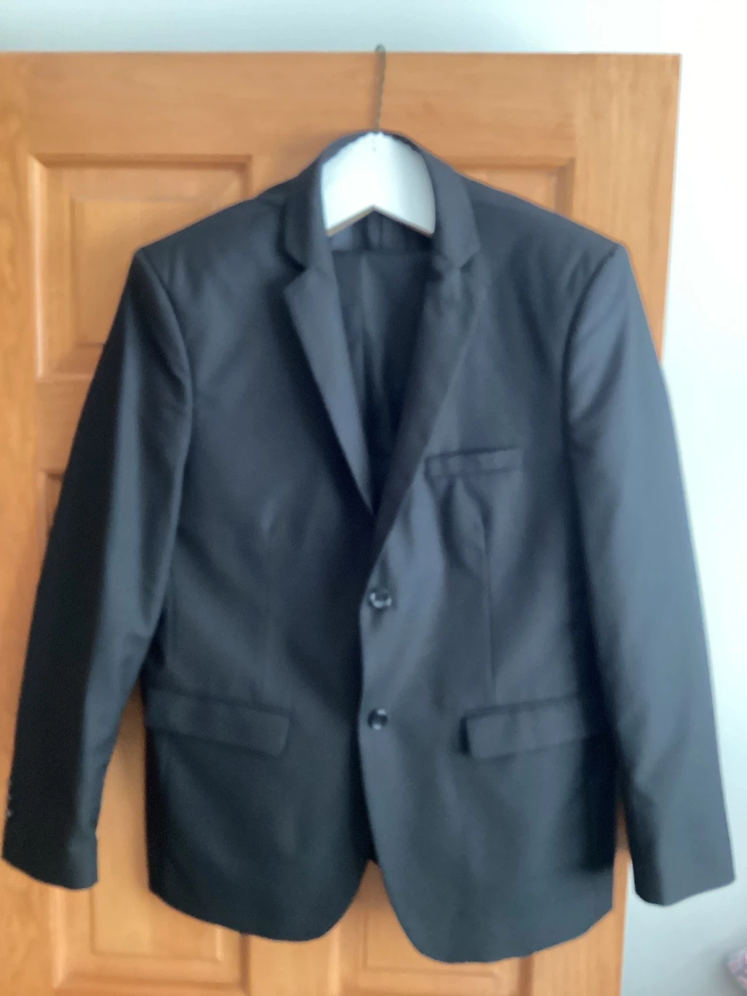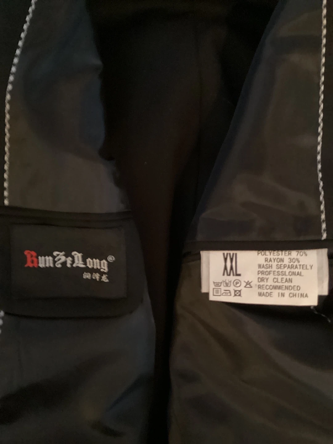 Selling a RunFeiLong black suit in size XXL. The material is 70% polyester and 30% rayon. It's recommended to dry clean this suit to keep it looking its best