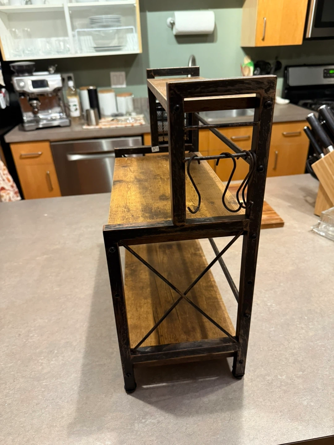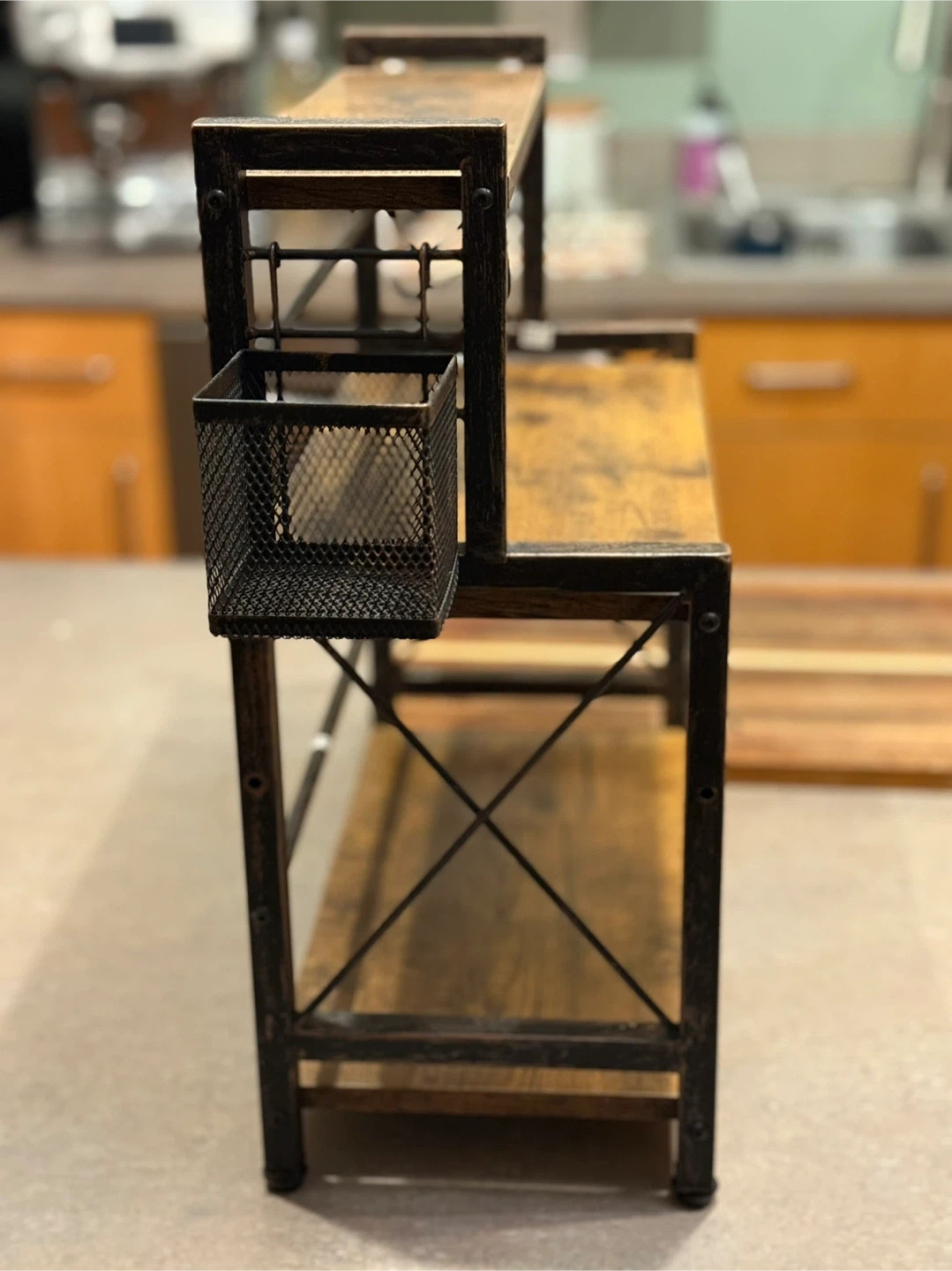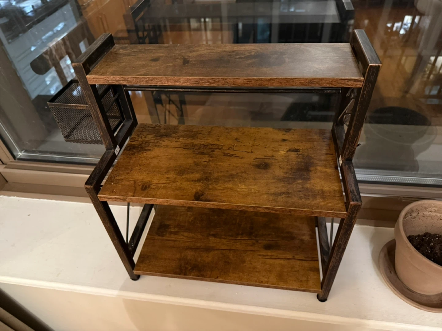 118Rustic brown table top shelf - perfect for storing small plants, coffee and tea, or books and office supplies. It is in good condition with no dents, scratches, or chips in the finish!