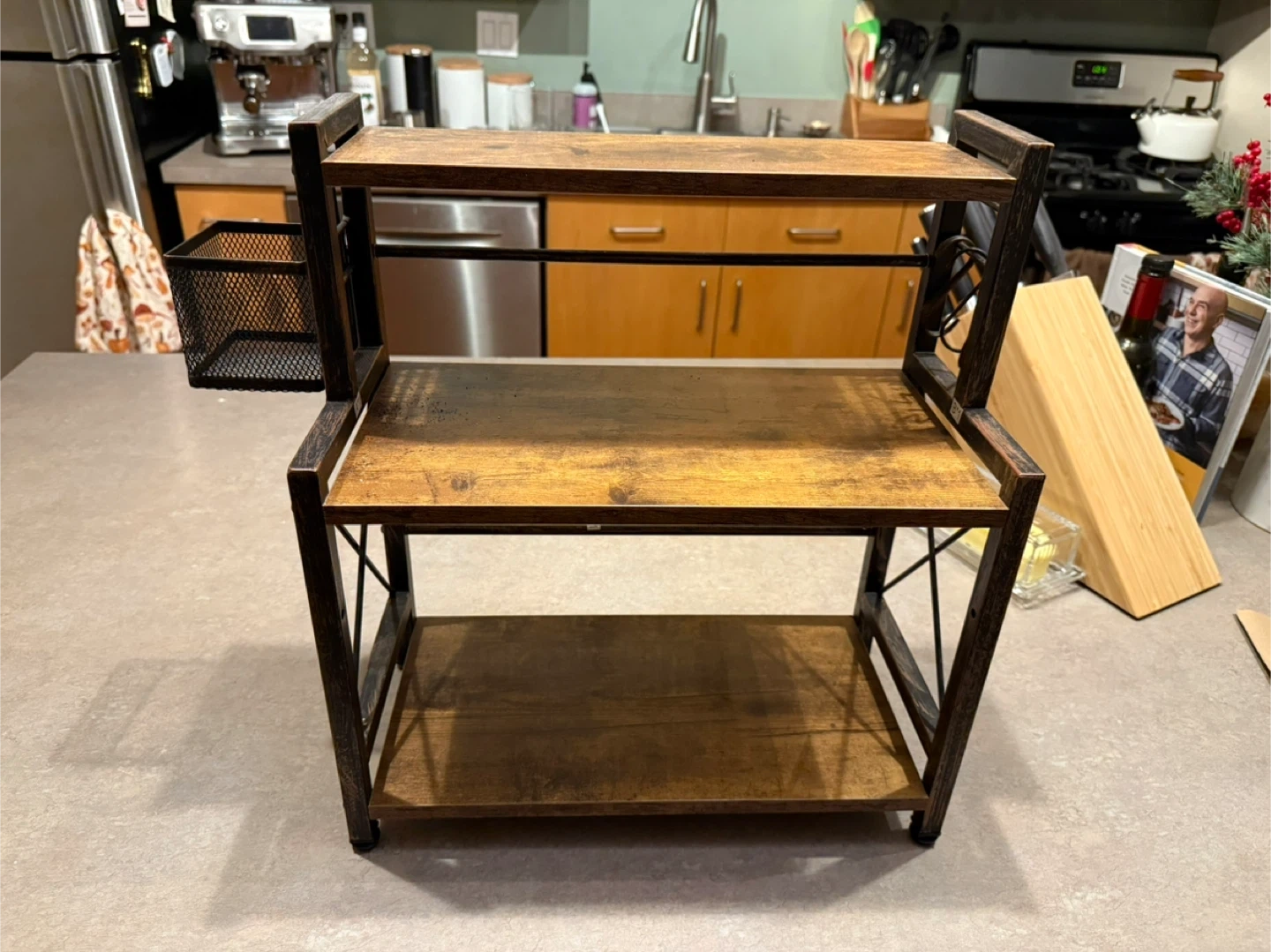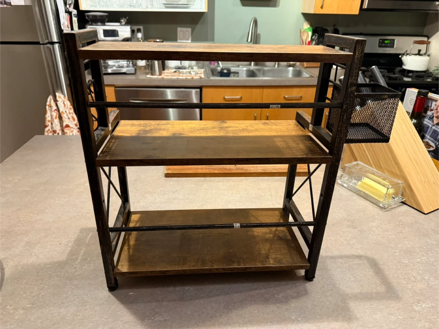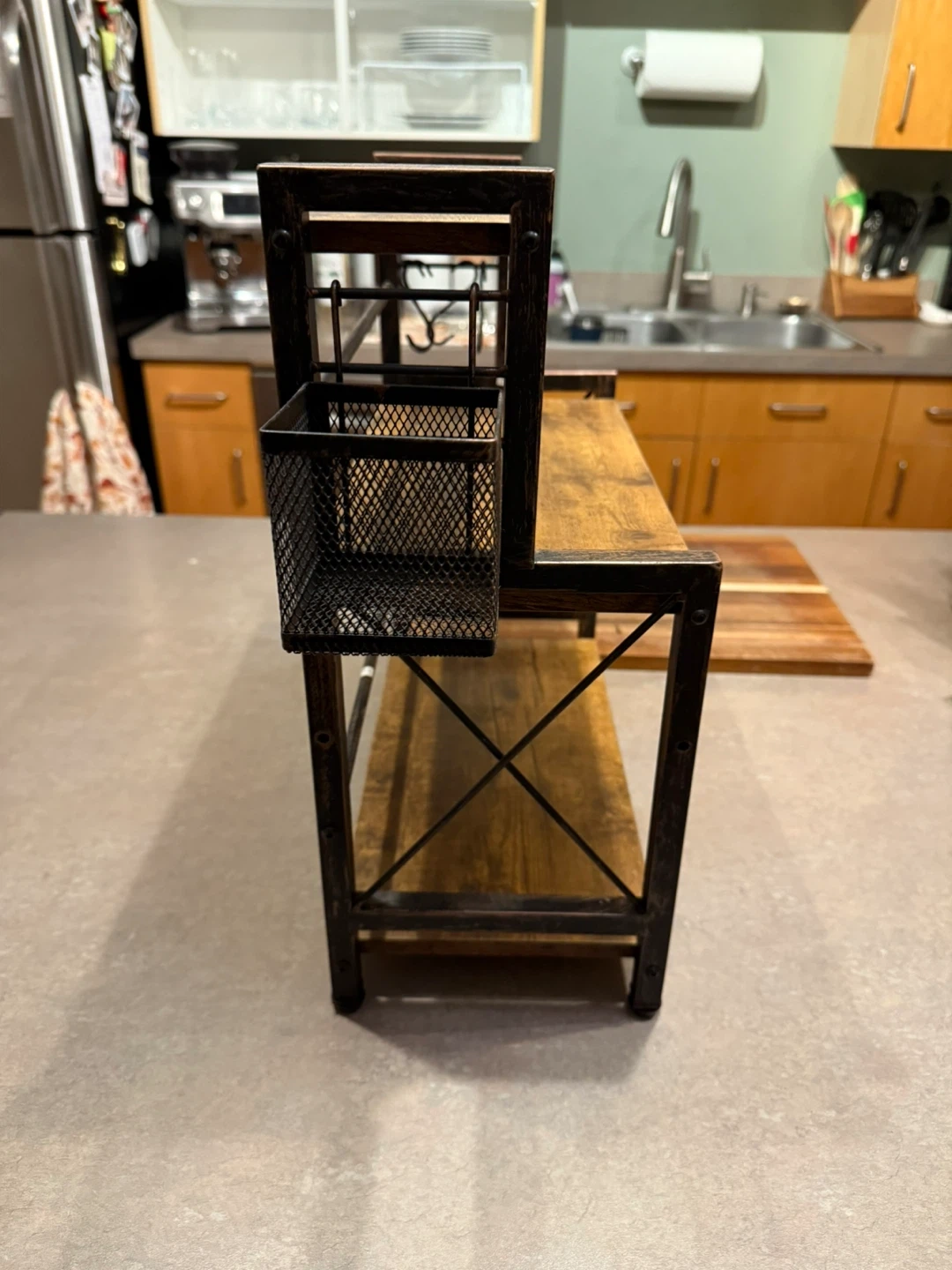 118Rustic brown table top shelf - perfect for storing small plants, coffee and tea, or books and office supplies. It is in good condition with no dents, scratches, or chips in the finish!