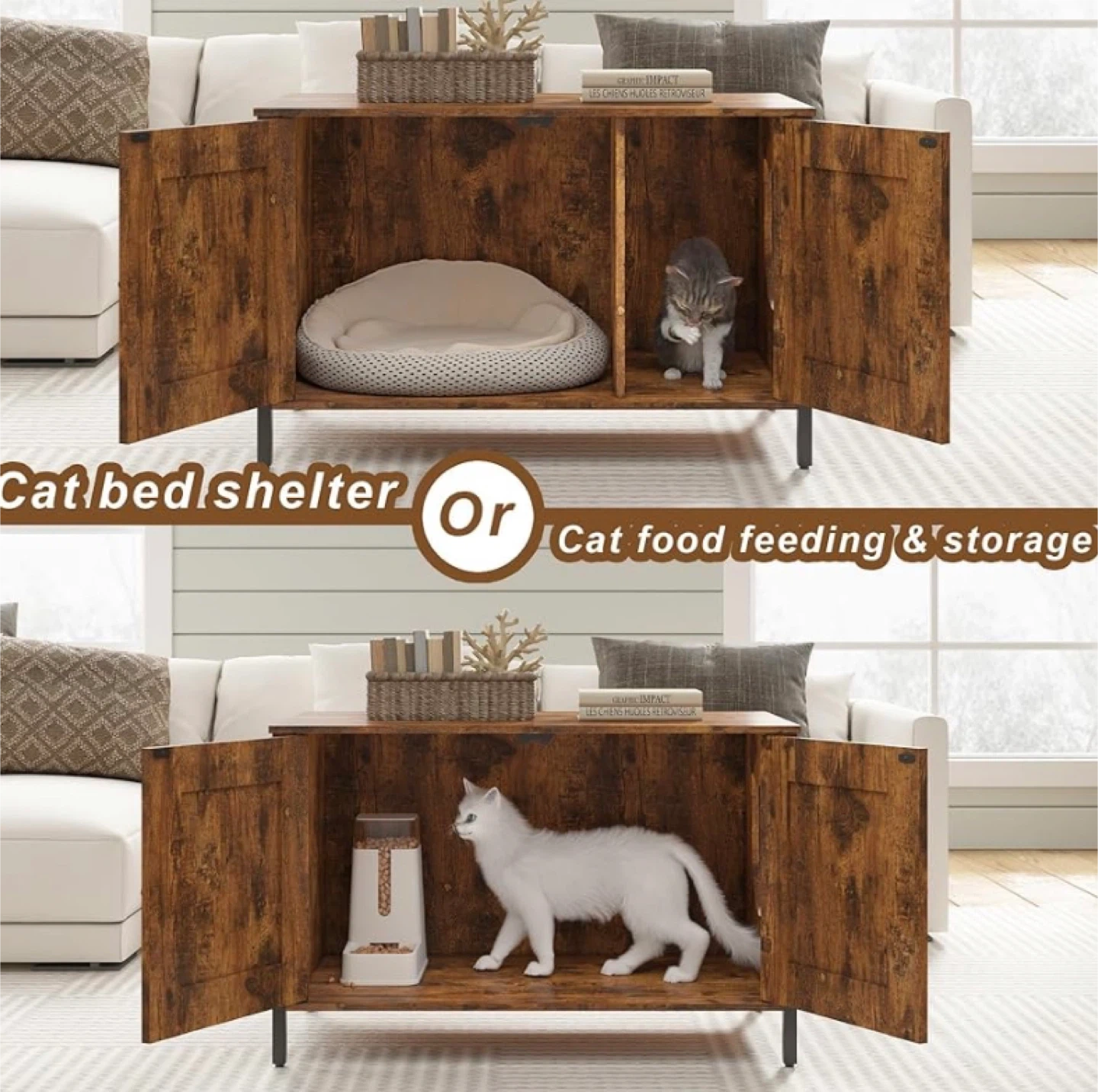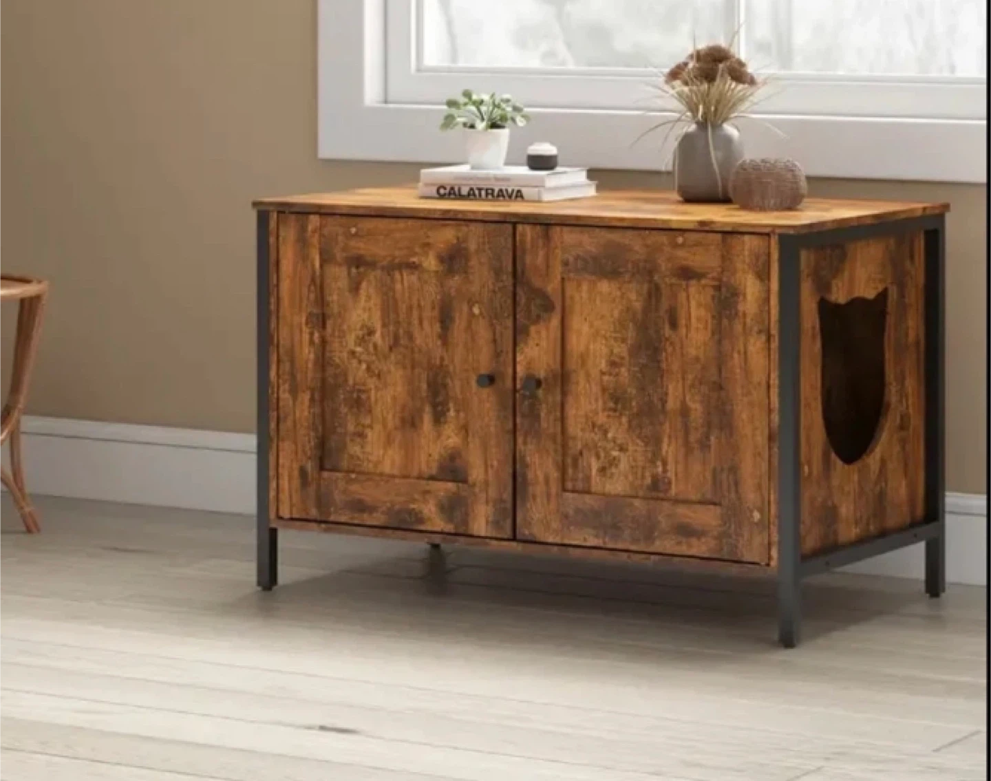 This rustic brown wooden cat litter box enclosure is a stylish way to hide your cat's litter box. It can also be used as a cat bed shelter or for cat food feeding and storage. The sturdy structure can hold up to 200 lbs on top and 100 lbs inside. Dimensions are approximately 39.92" x 21.89" x 25.1".
