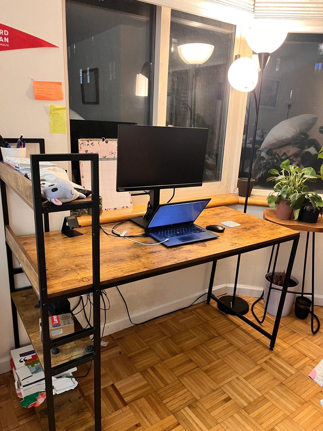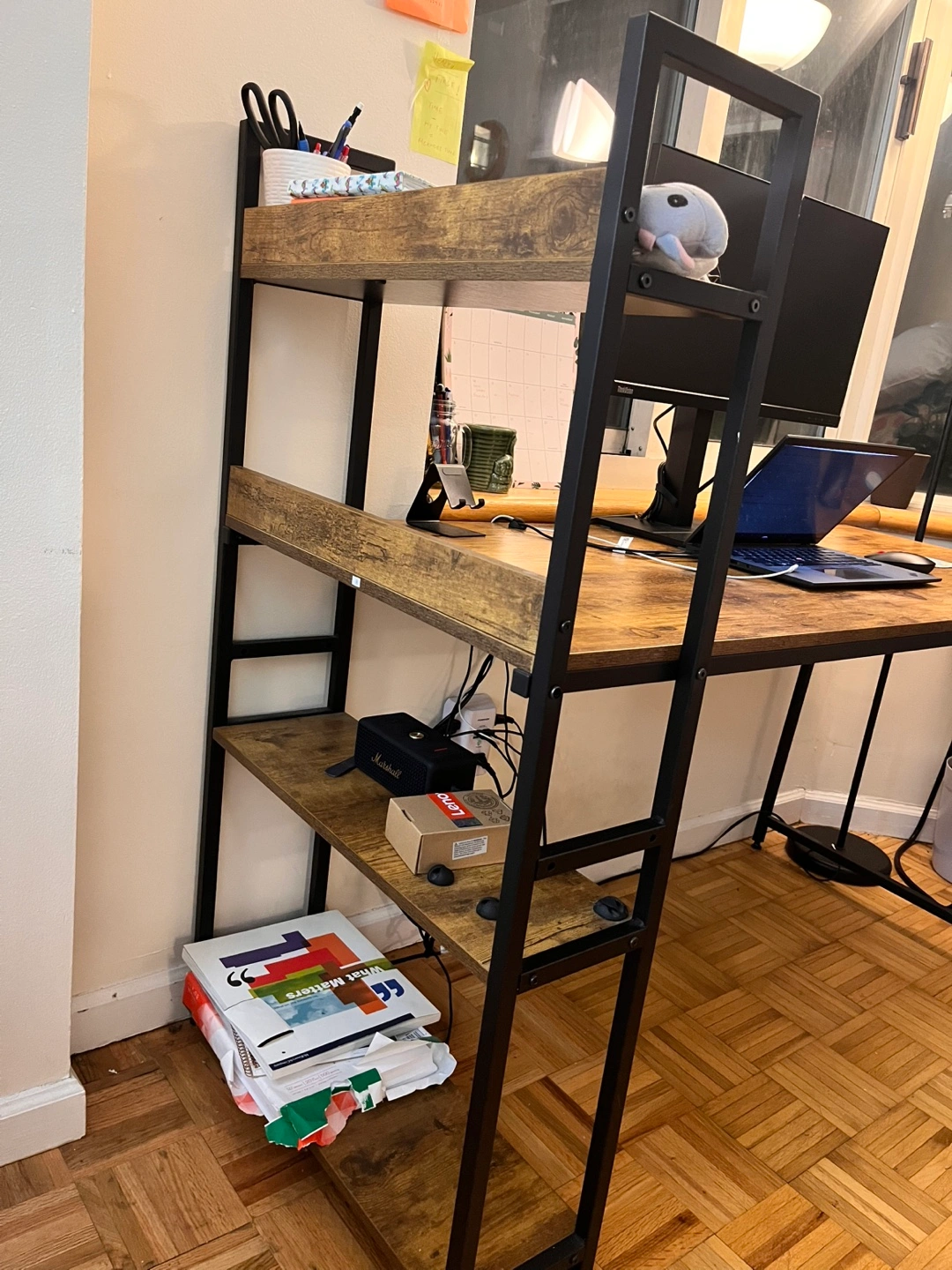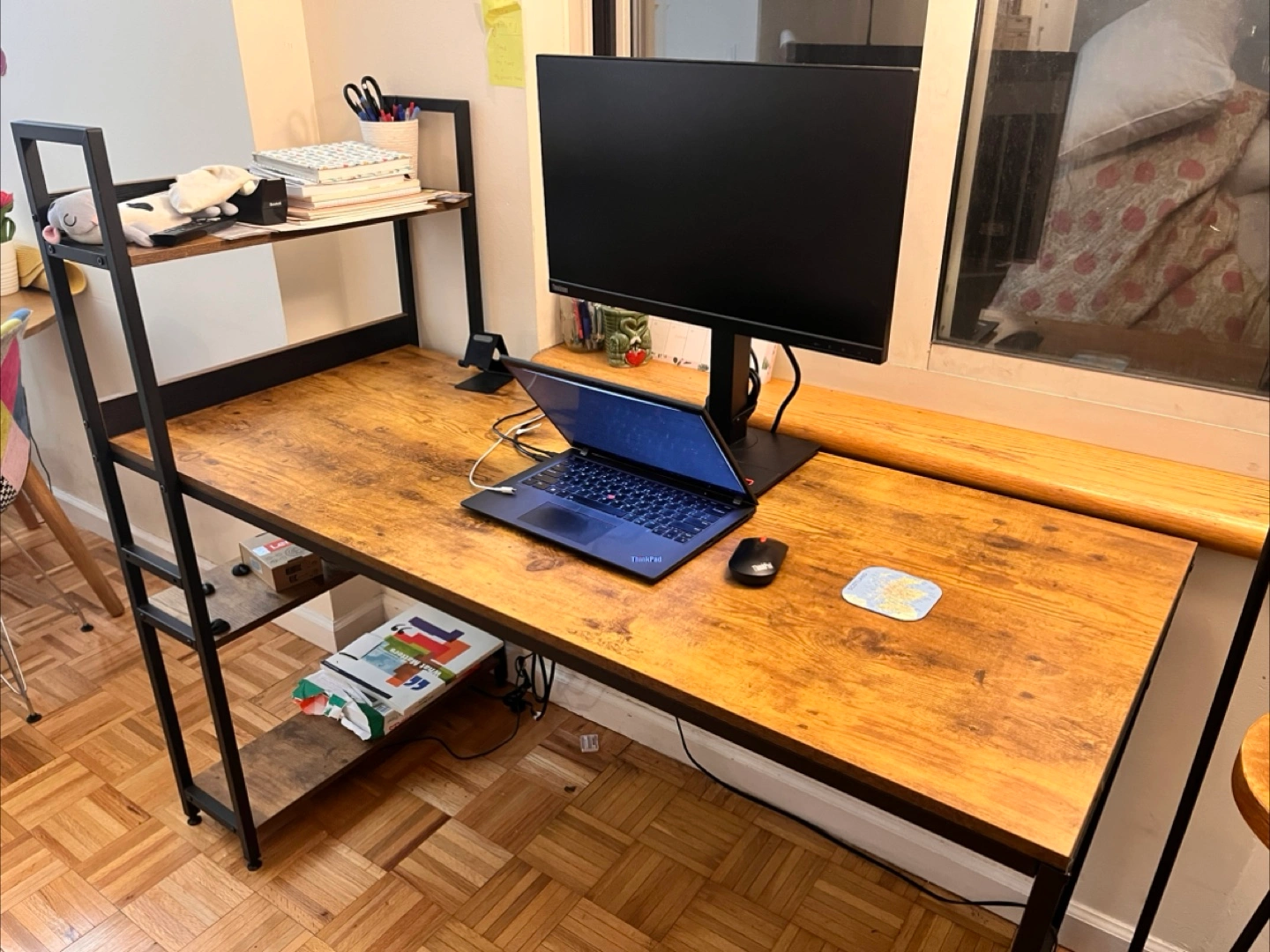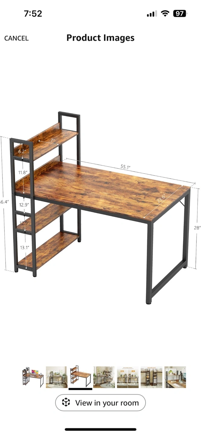 5Large computer desk with a built-in bookshelf. Wood-look top and black metal frame. Plenty of space for a computer, monitor, and other office supplies. Great for home offices or dorm rooms.