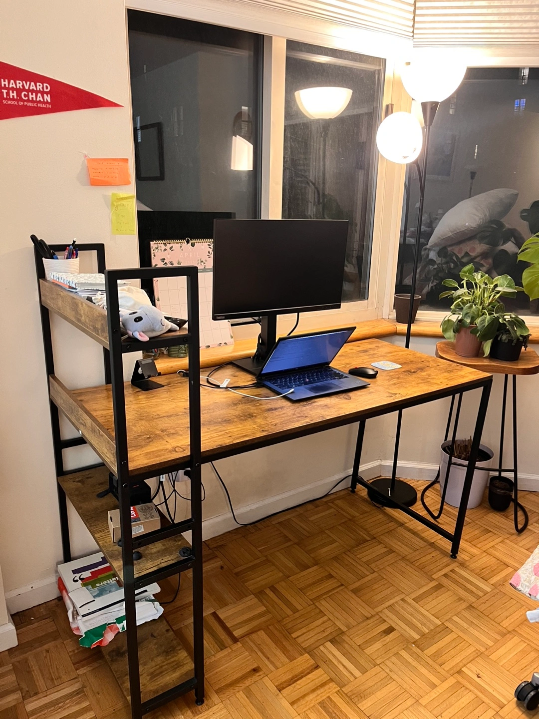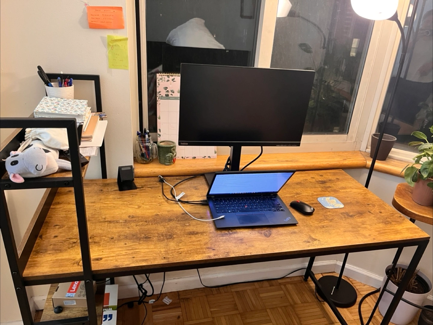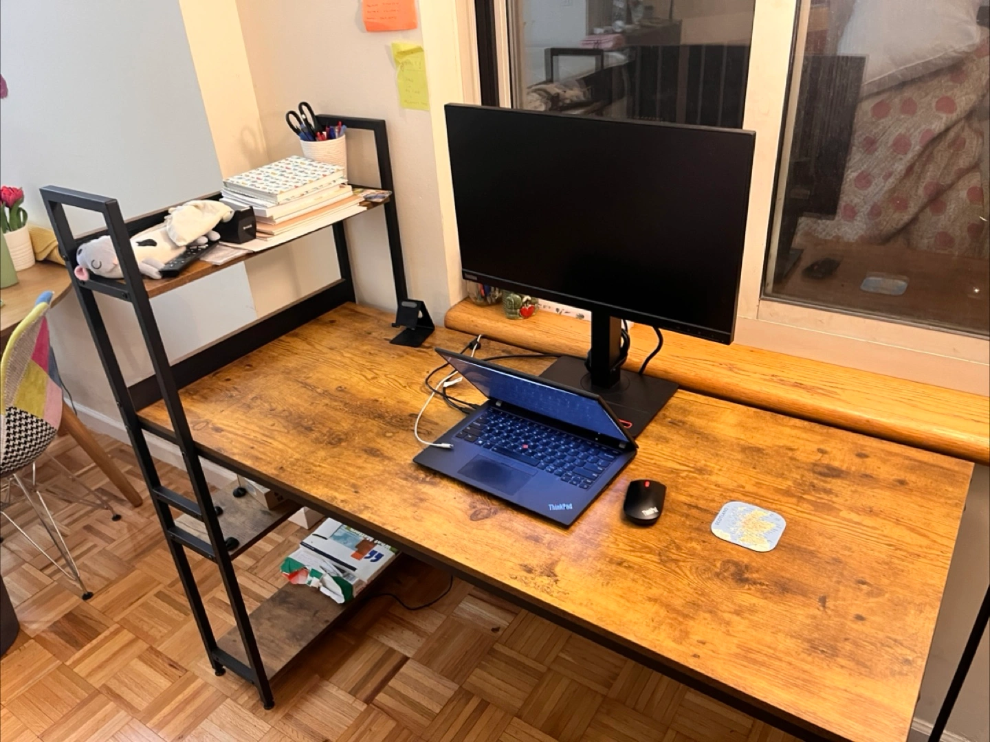 5Large computer desk with a built-in bookshelf. Wood-look top and black metal frame. Plenty of space for a computer, monitor, and other office supplies. Great for home offices or dorm rooms.