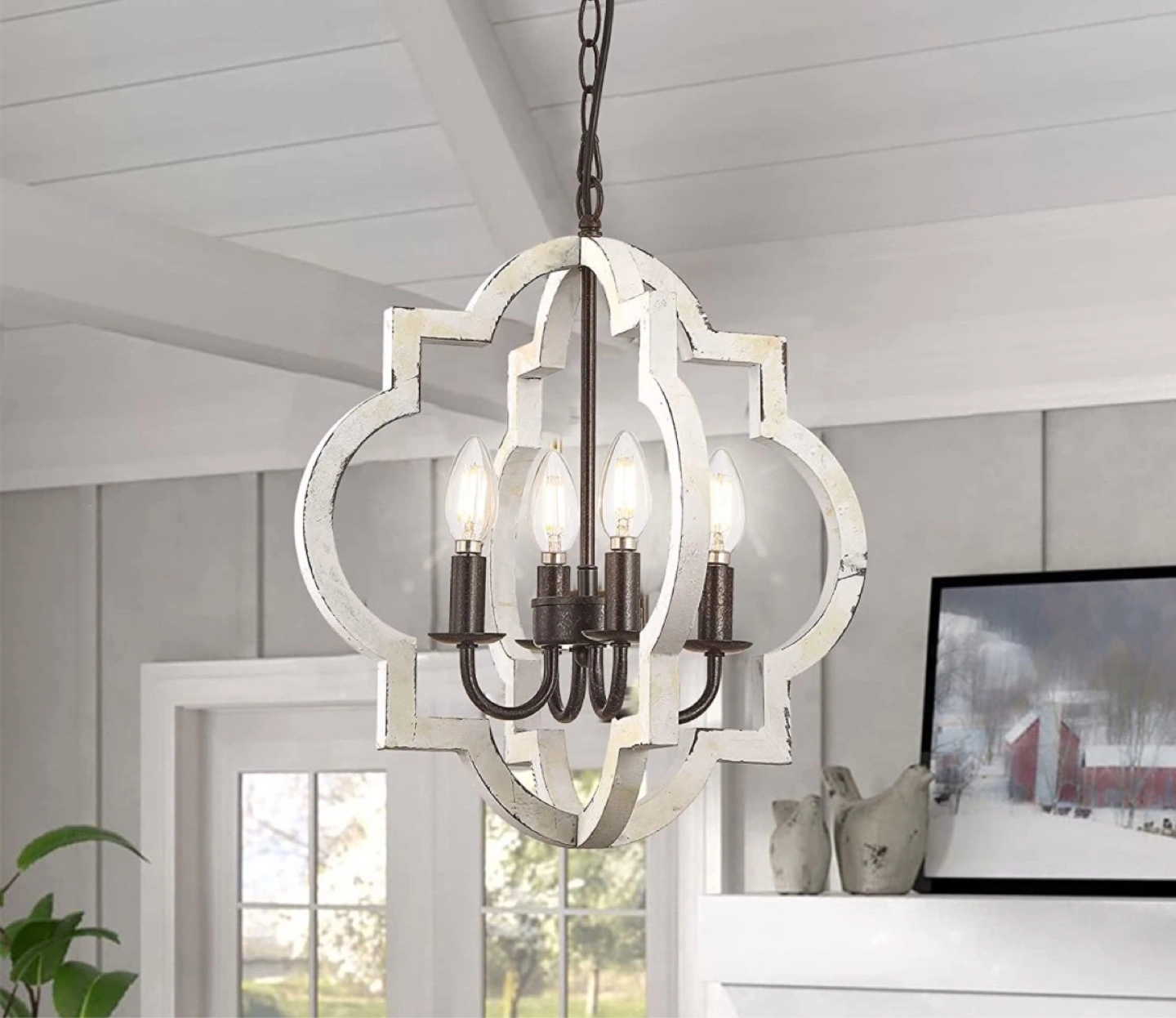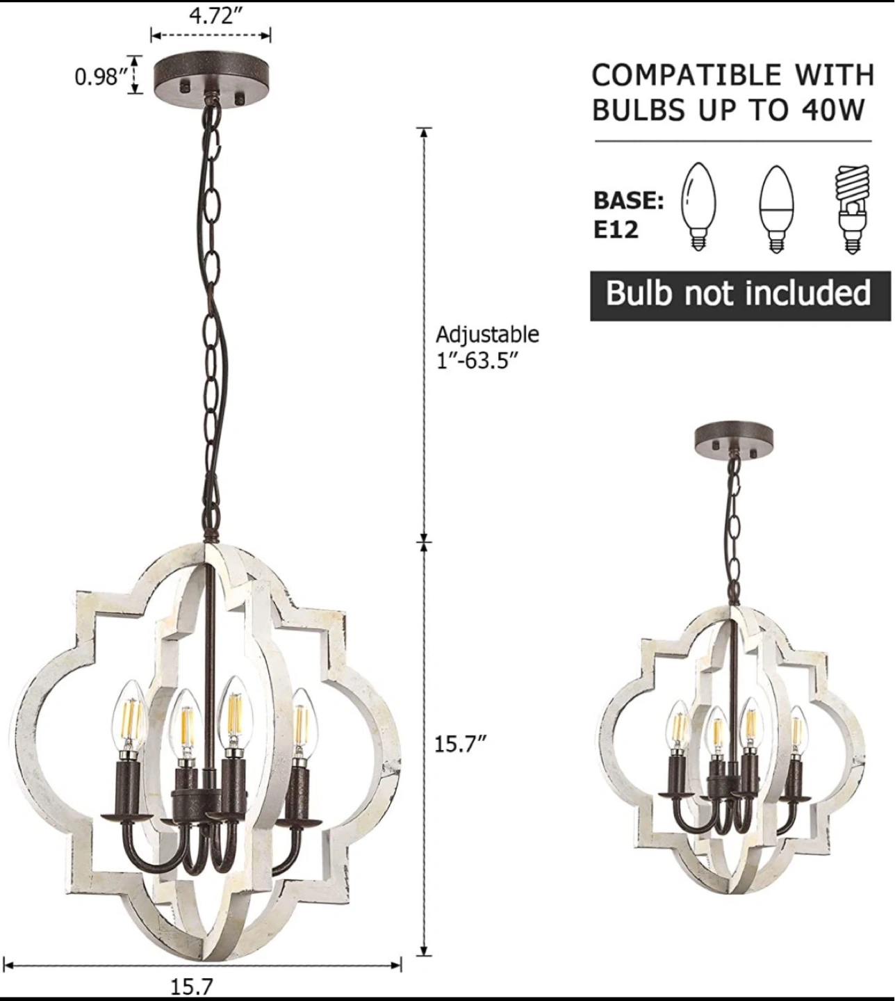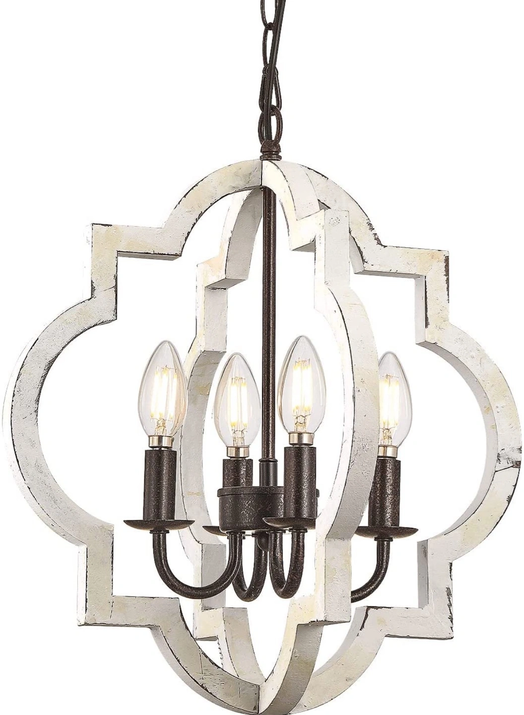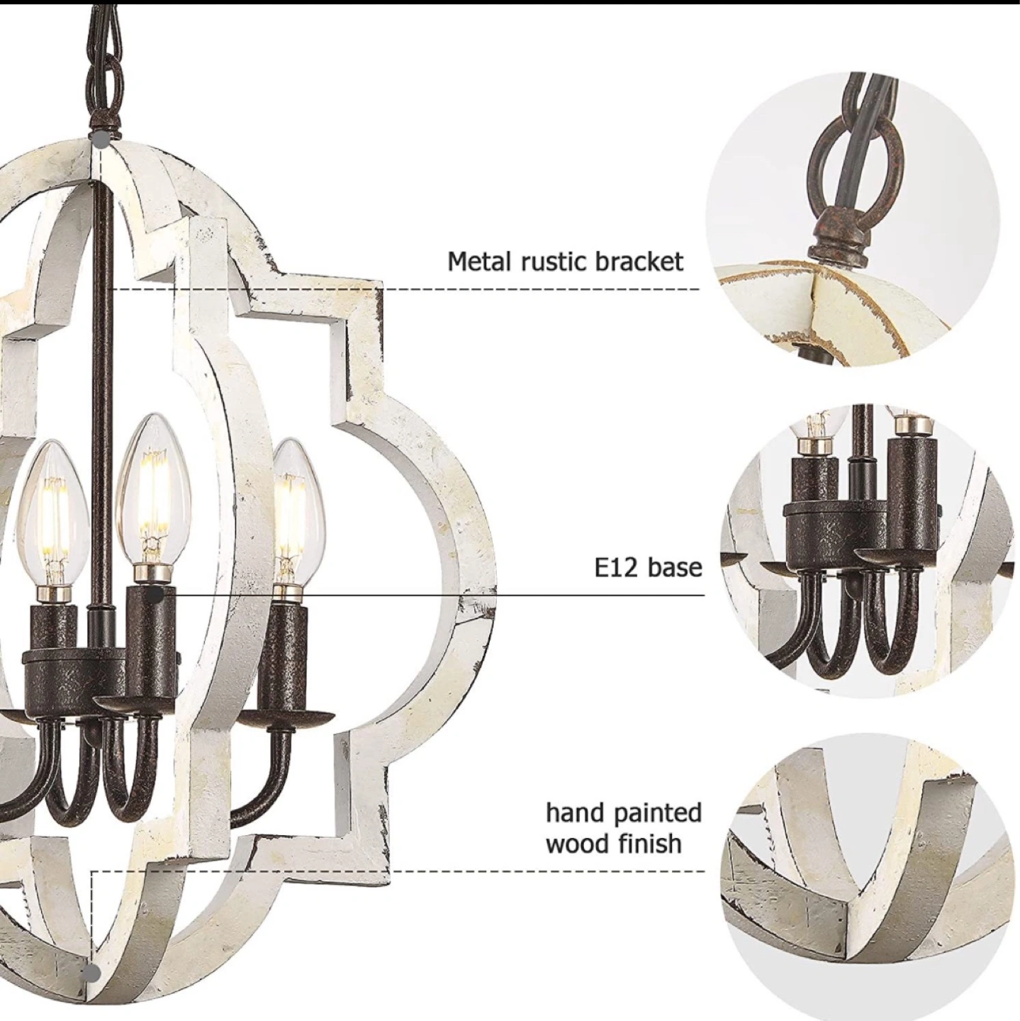 Beautiful farmhouse chandelier. White wood frame with black metal accents. Four lights. E12 base. Adjustable hanging length. Hand-painted finish. Bulbs included. Changing out decor.