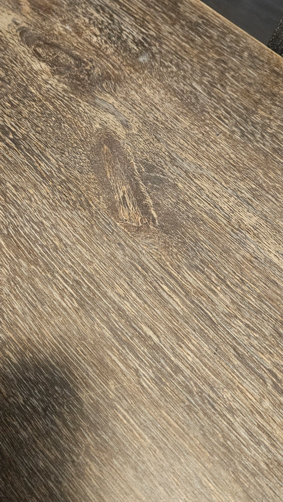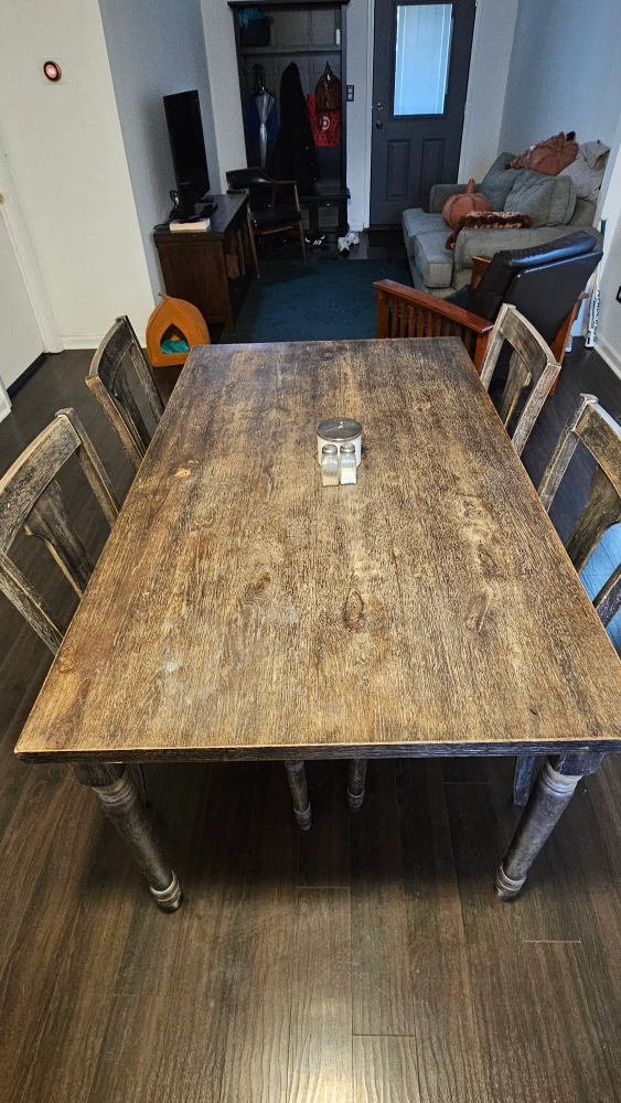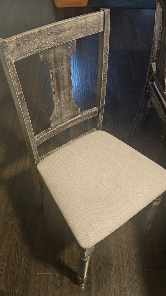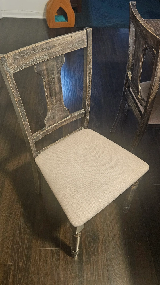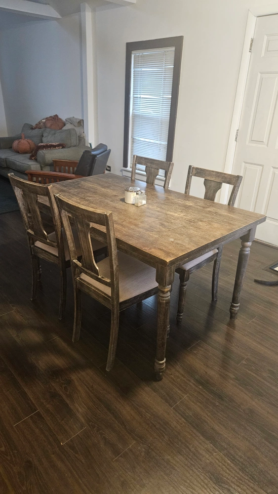 Dark brown wooden dining table. Features a distressed finish. Four matching chairs included. Beige fabric cushions. Simple, elegant design. Perfect for smaller spaces.