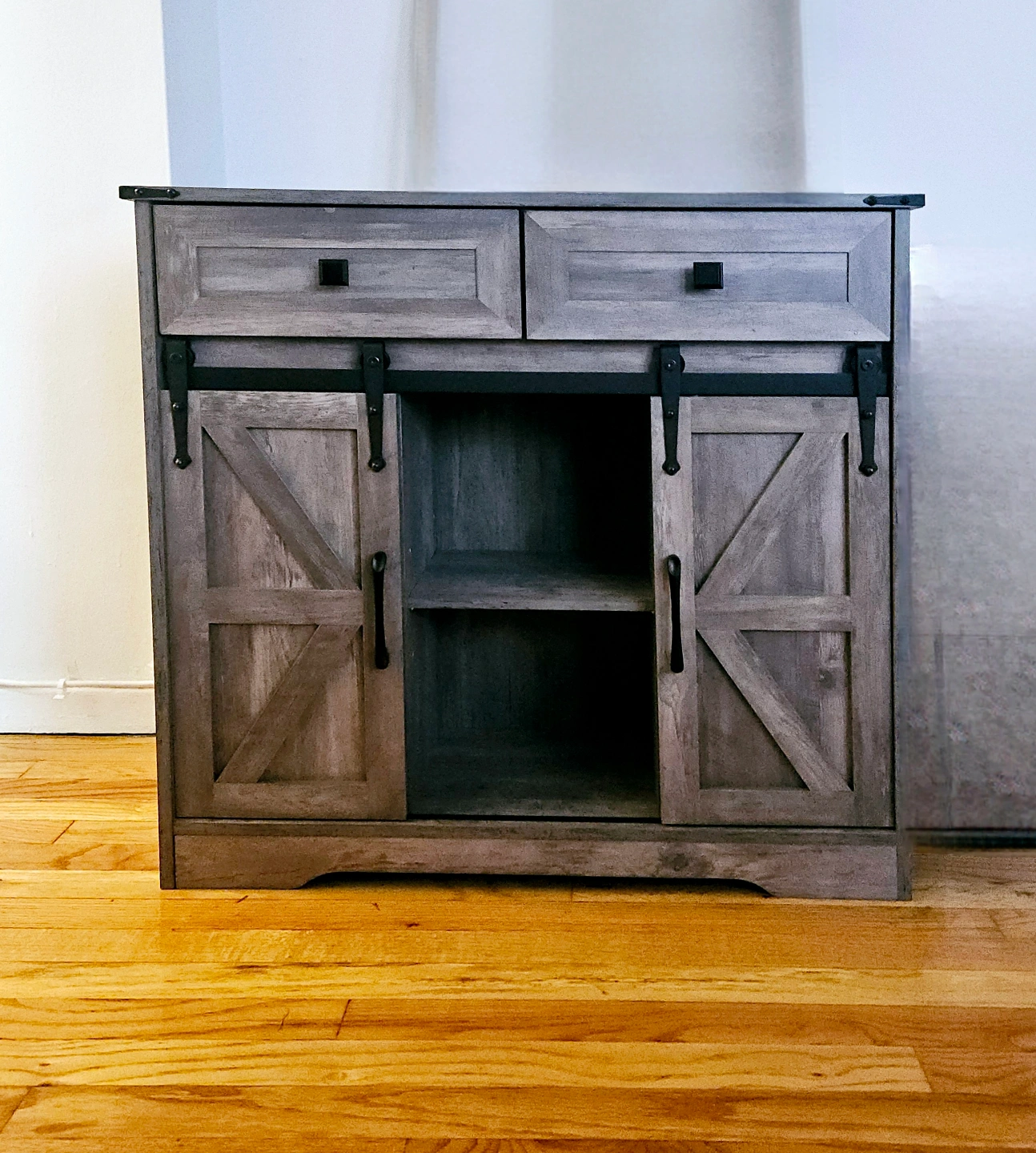 Selling a rustic gray accent cabinet with barn door style doors! It has two drawers on top and an open shelf in the center . The cabinet is in great condition and would be a stylish addition to any room. It has 6 adjustable compartments. Perfect as a sideboard, a bar or a TV cabinet.