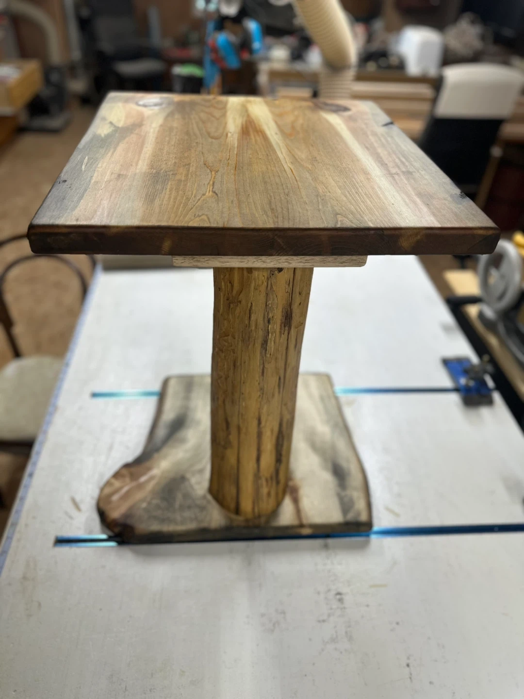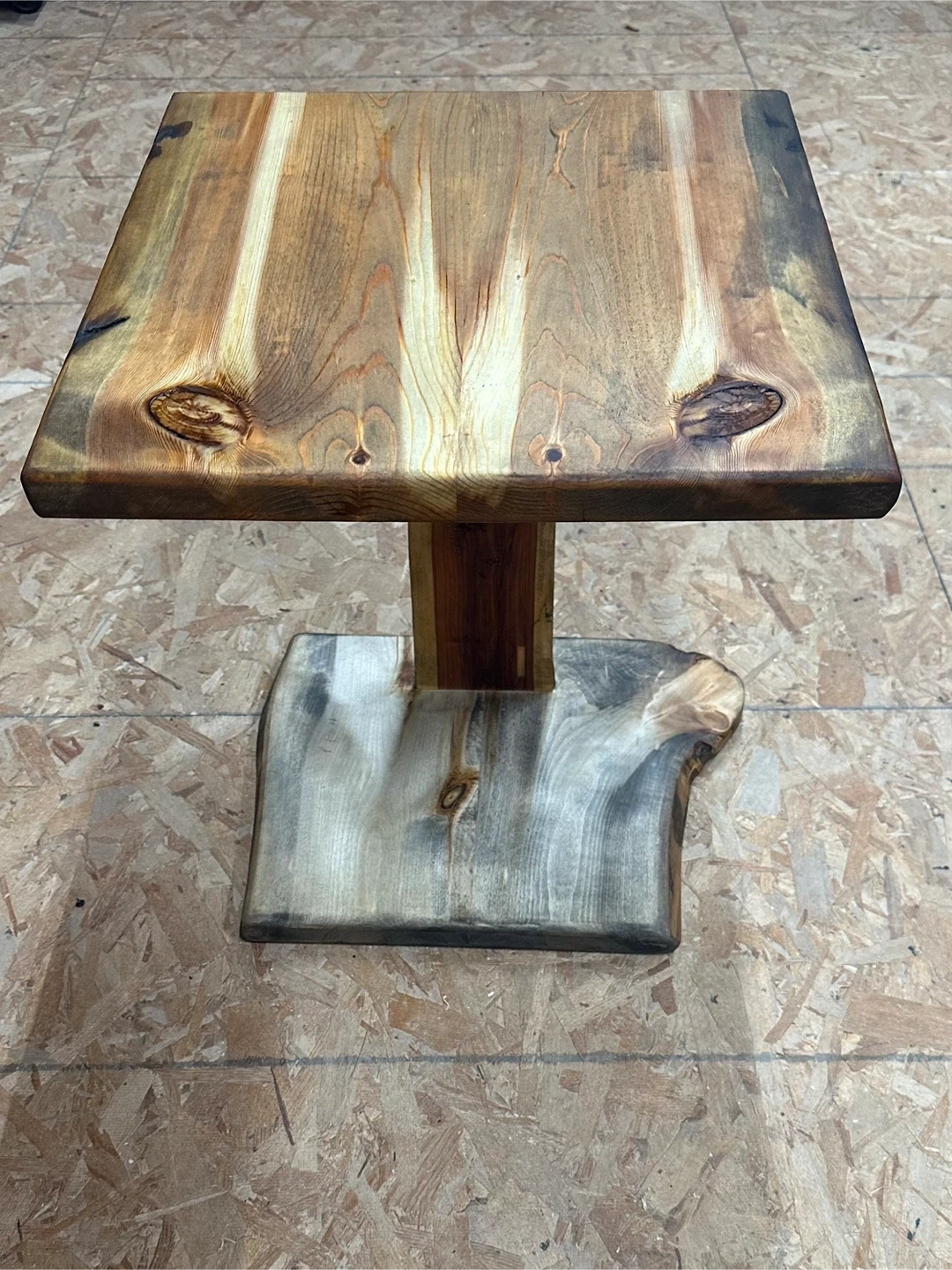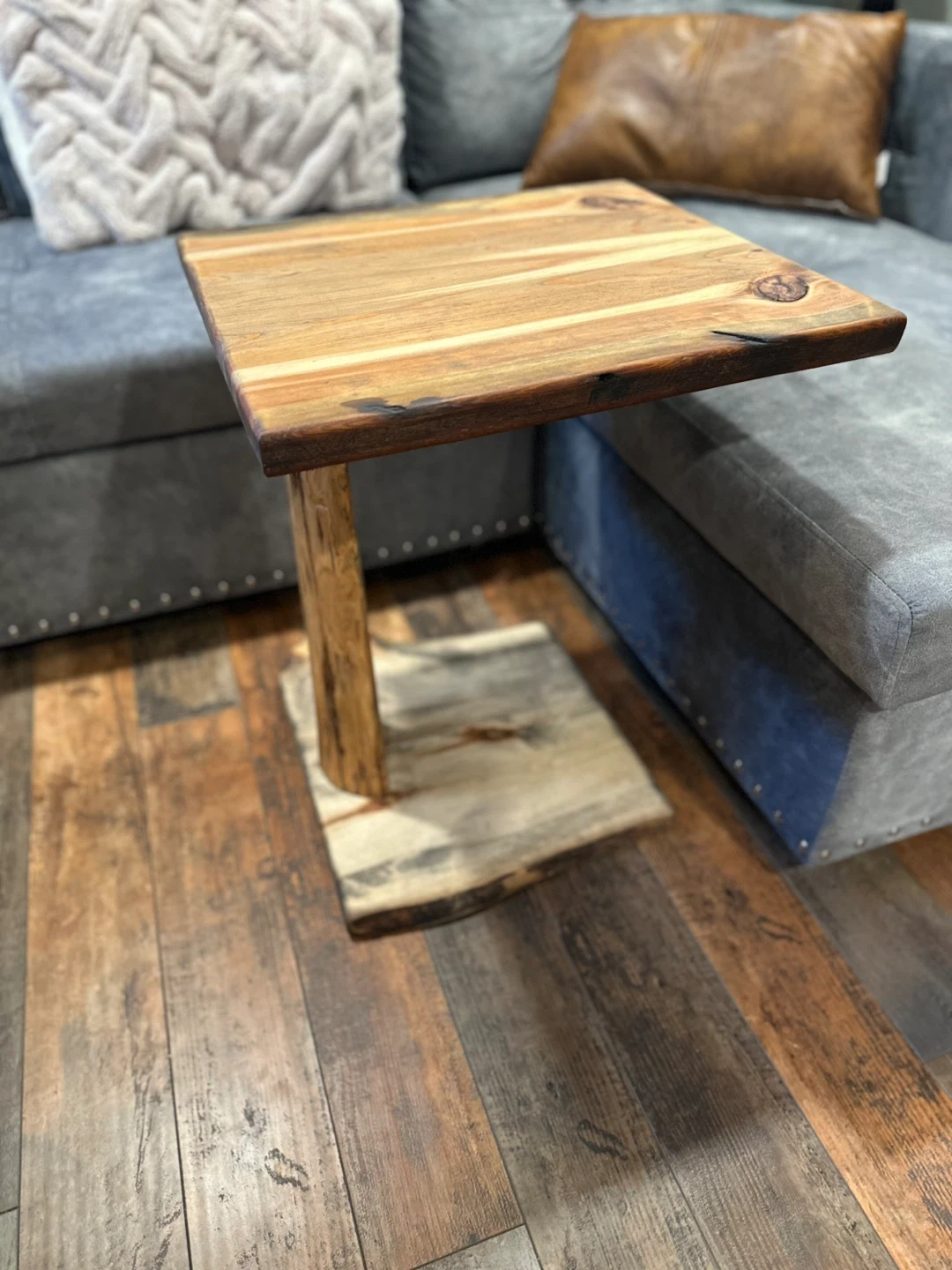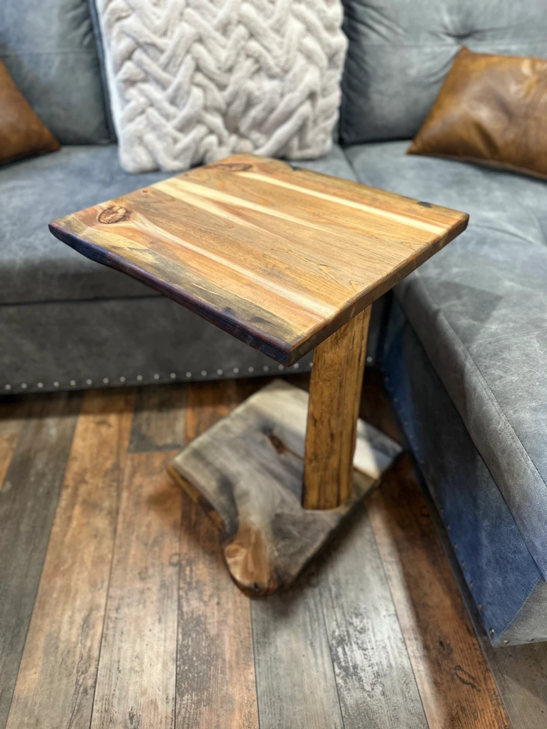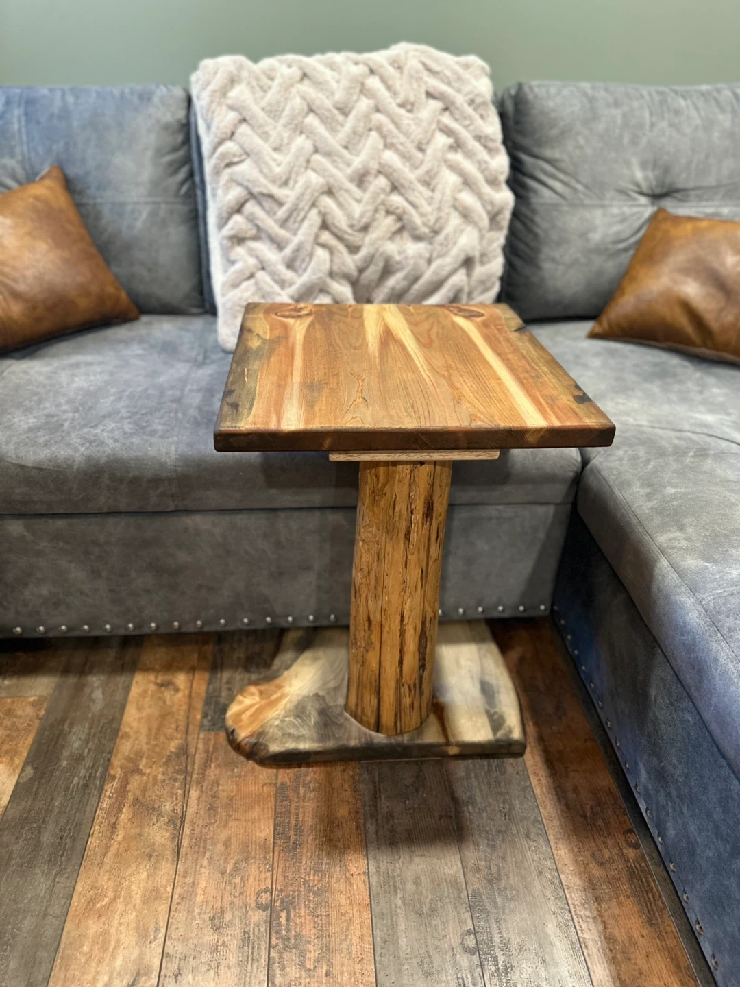 18W x 19D x22.5H. This rustic sofa table has a book matched 100+ year-old Barn wood top with integrity left in place as seen by the top’s original edge with stain bleed around the nail holes. Support comes by way of a halved, live-edge, worm-holed, cedar log. Lastly, the Aspen base is live-edge as well. This piece was finished in Rubio Monocoat Walnut. Thanks for looking!