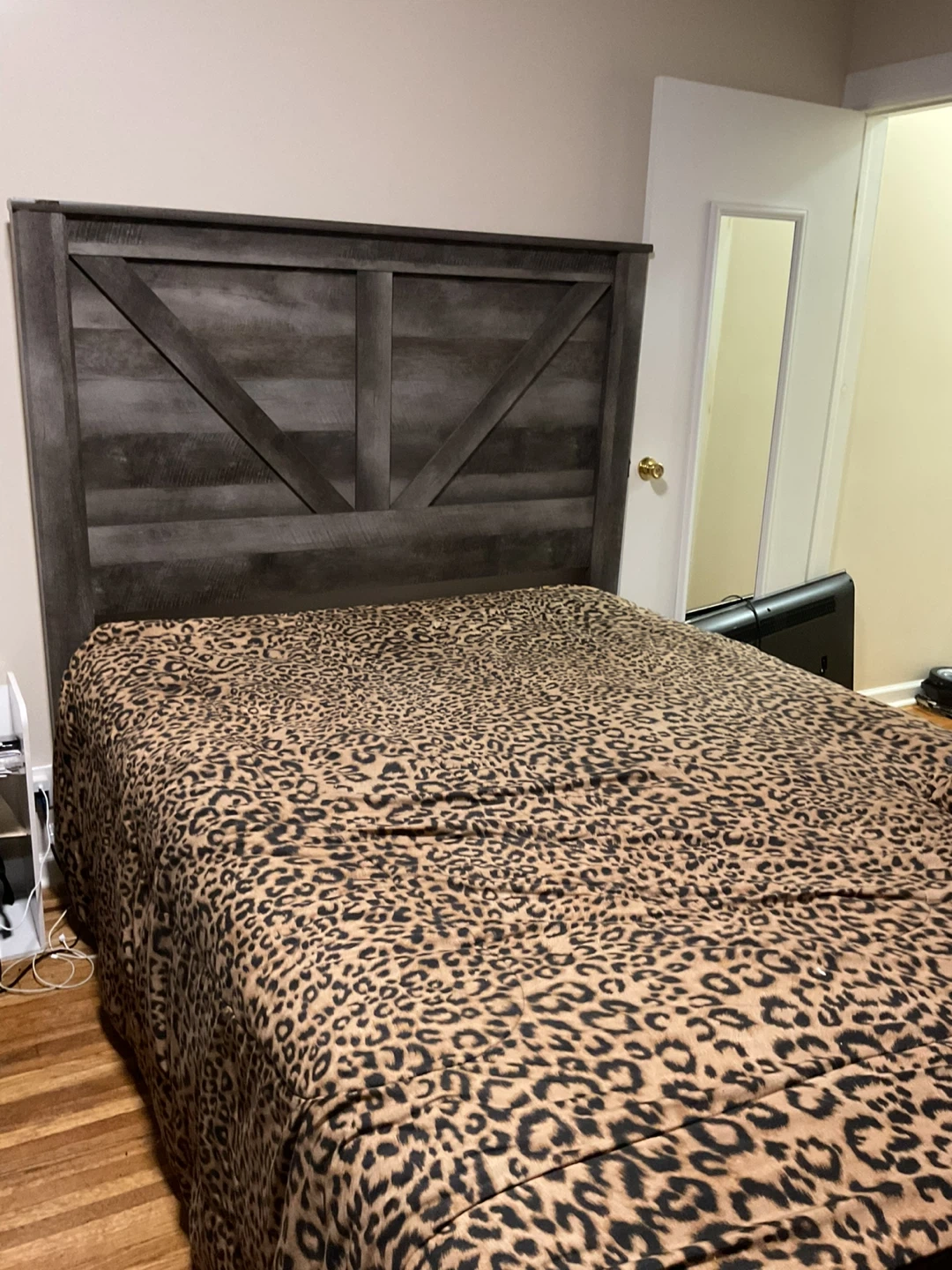 Selling a rustic-style headboard for a queen-size bed! It has a lovely gray wood finish and a cool design. It's in good condition and would look great in any bedroom