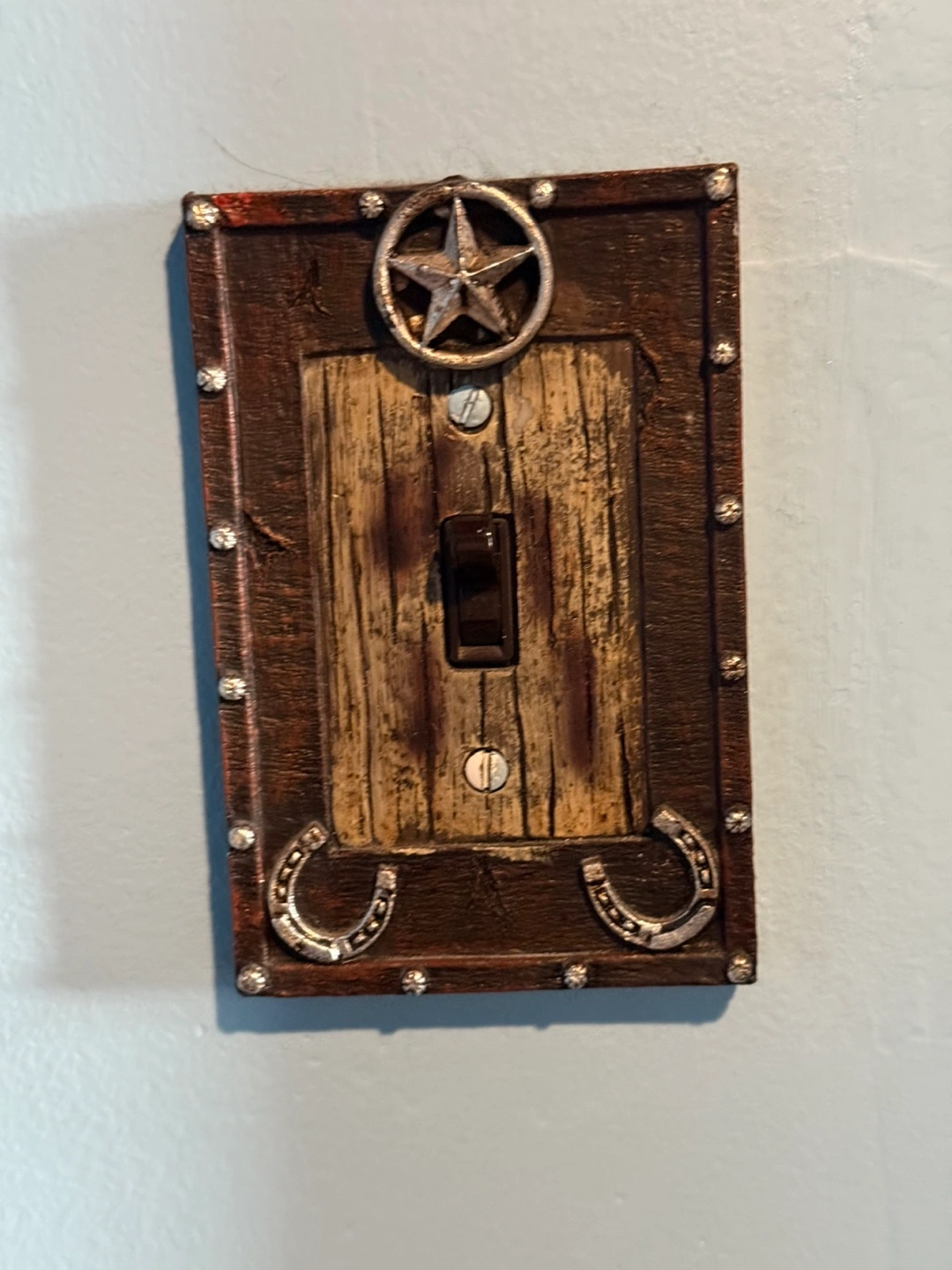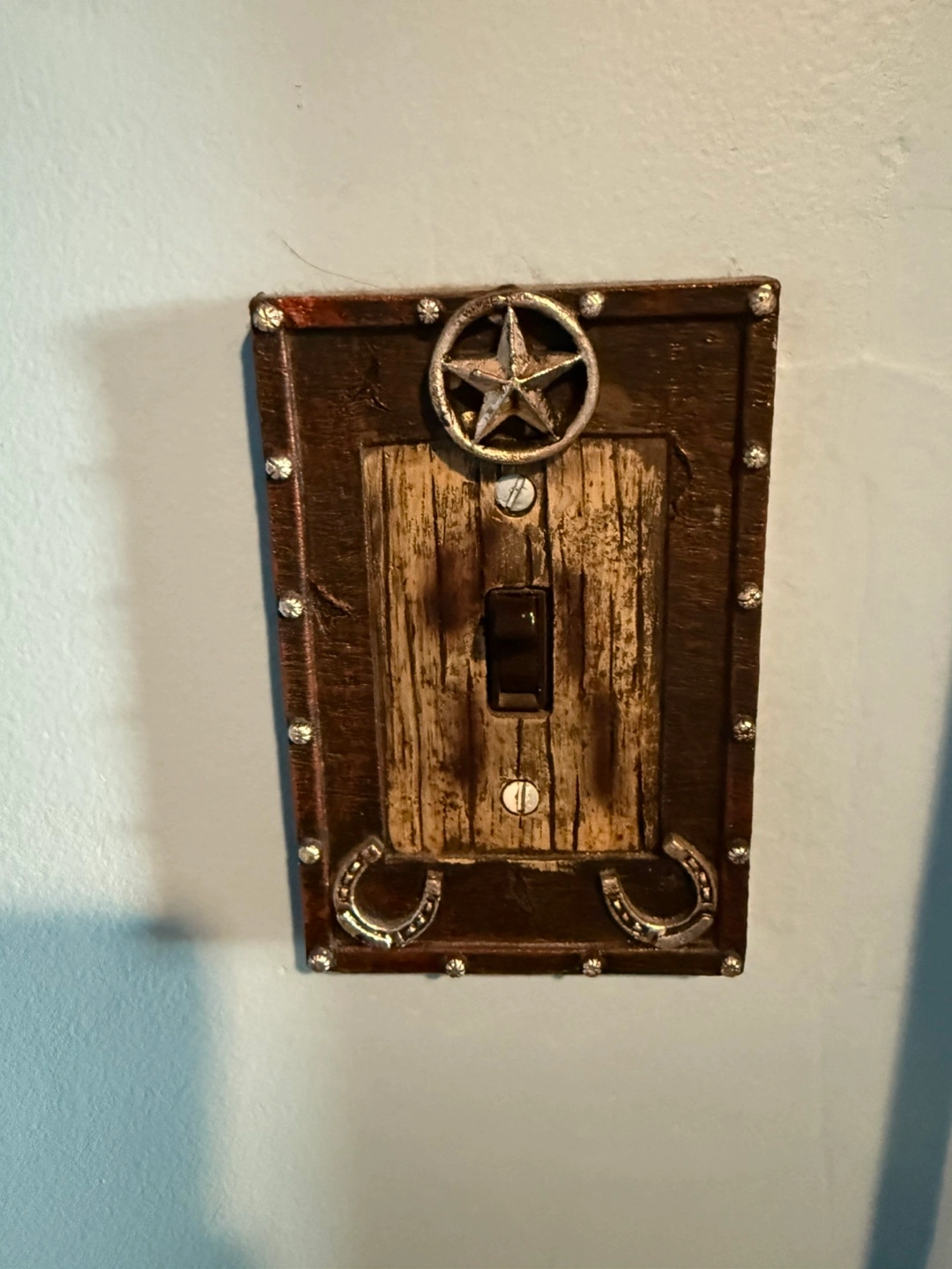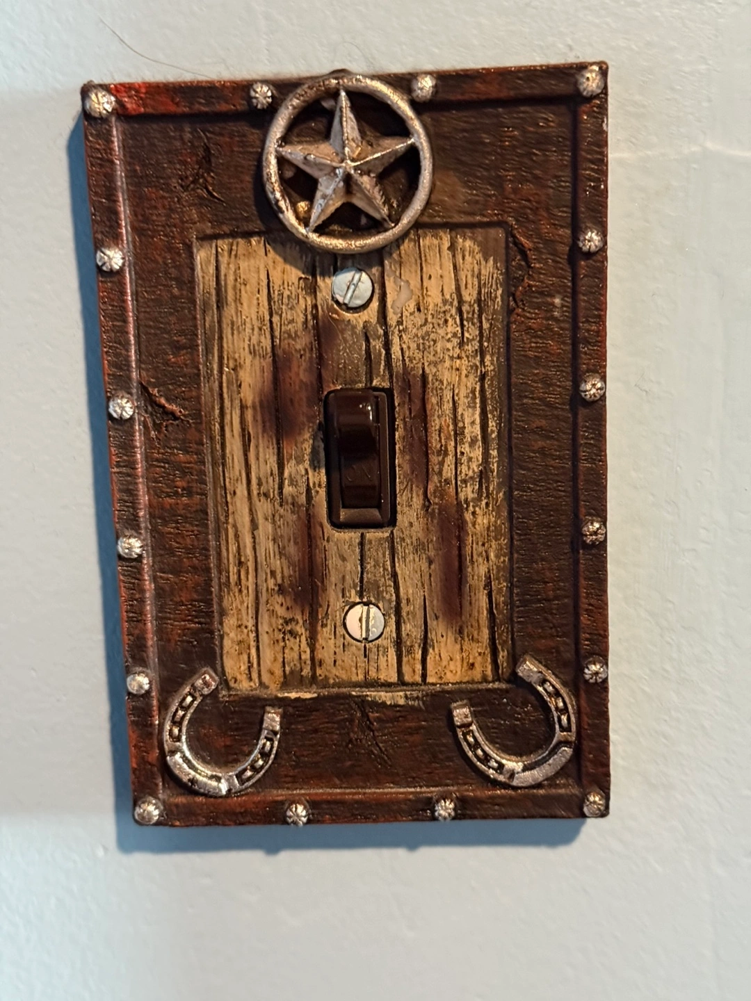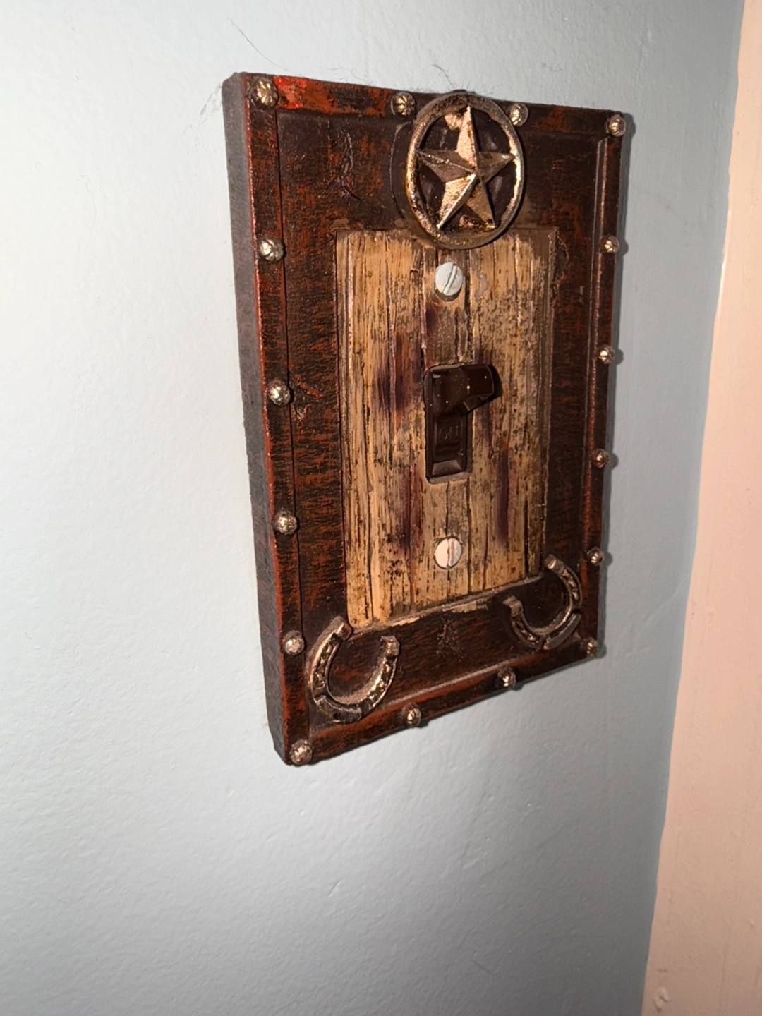 Unique light switch plate cover. Features a rustic wooden design, metal horseshoes, and a star. Adds a Western touch to any room. Great for cowboy or western theme