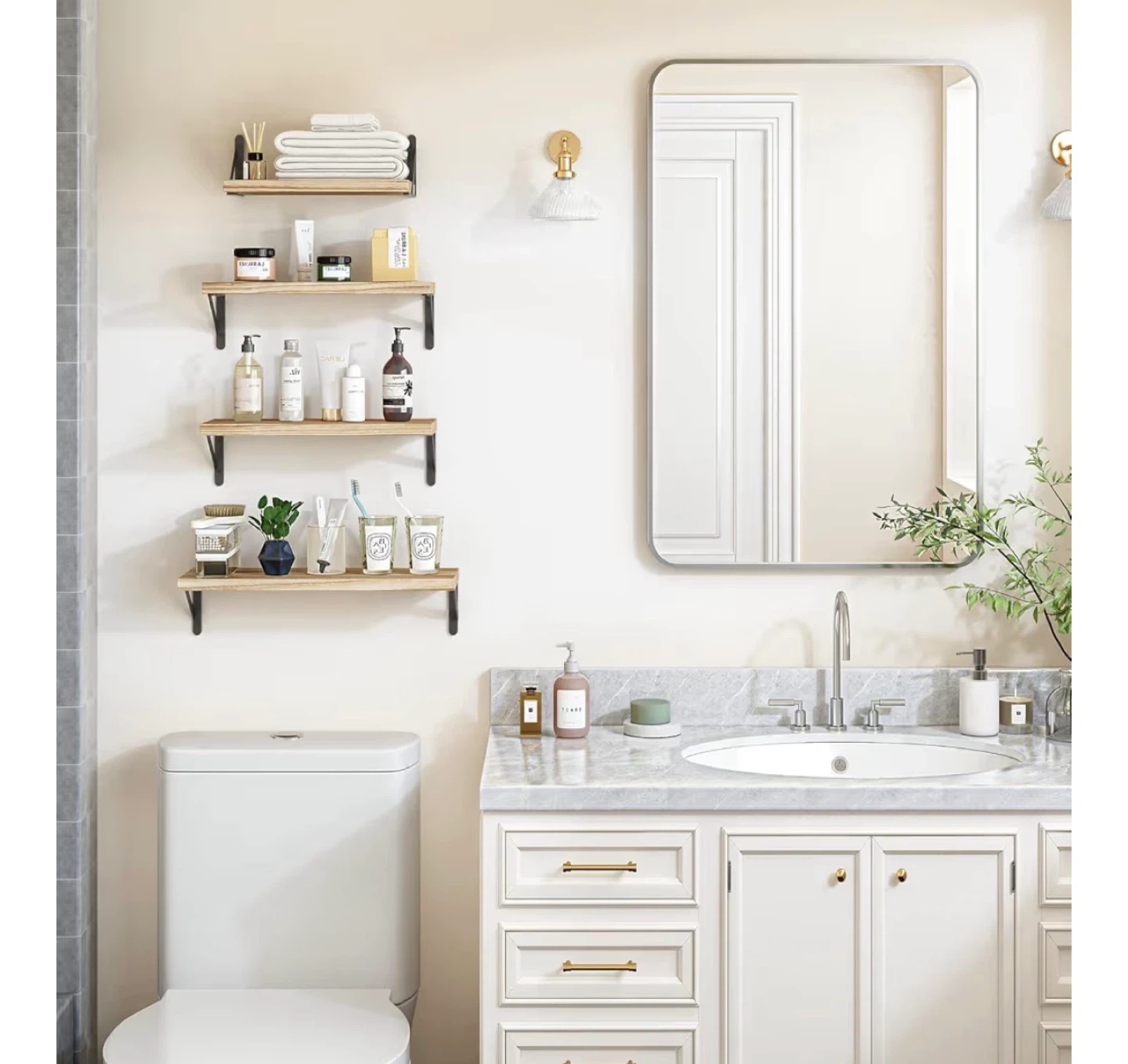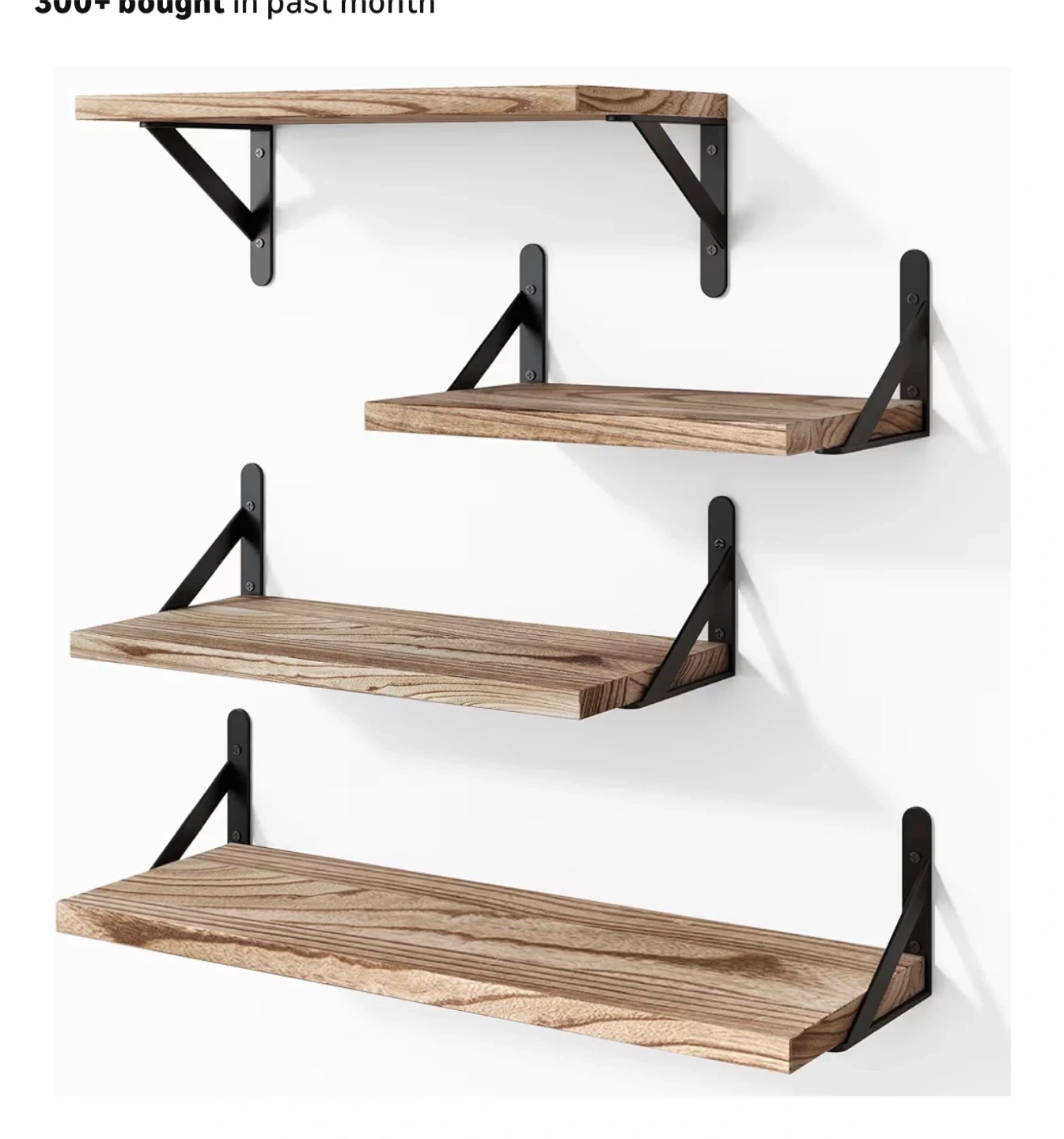 35Selling a sets of 4 rustic wood floating shelves! They're perfect for adding some character to your bathroom, living room, or bedroom. The shelves are made of wood with black metal brackets. The dimensions are 11.4" x 6.1", 14.2" x 6.1", 14.2" x 6.1", and 16.5" x 6.1". Never opened from box