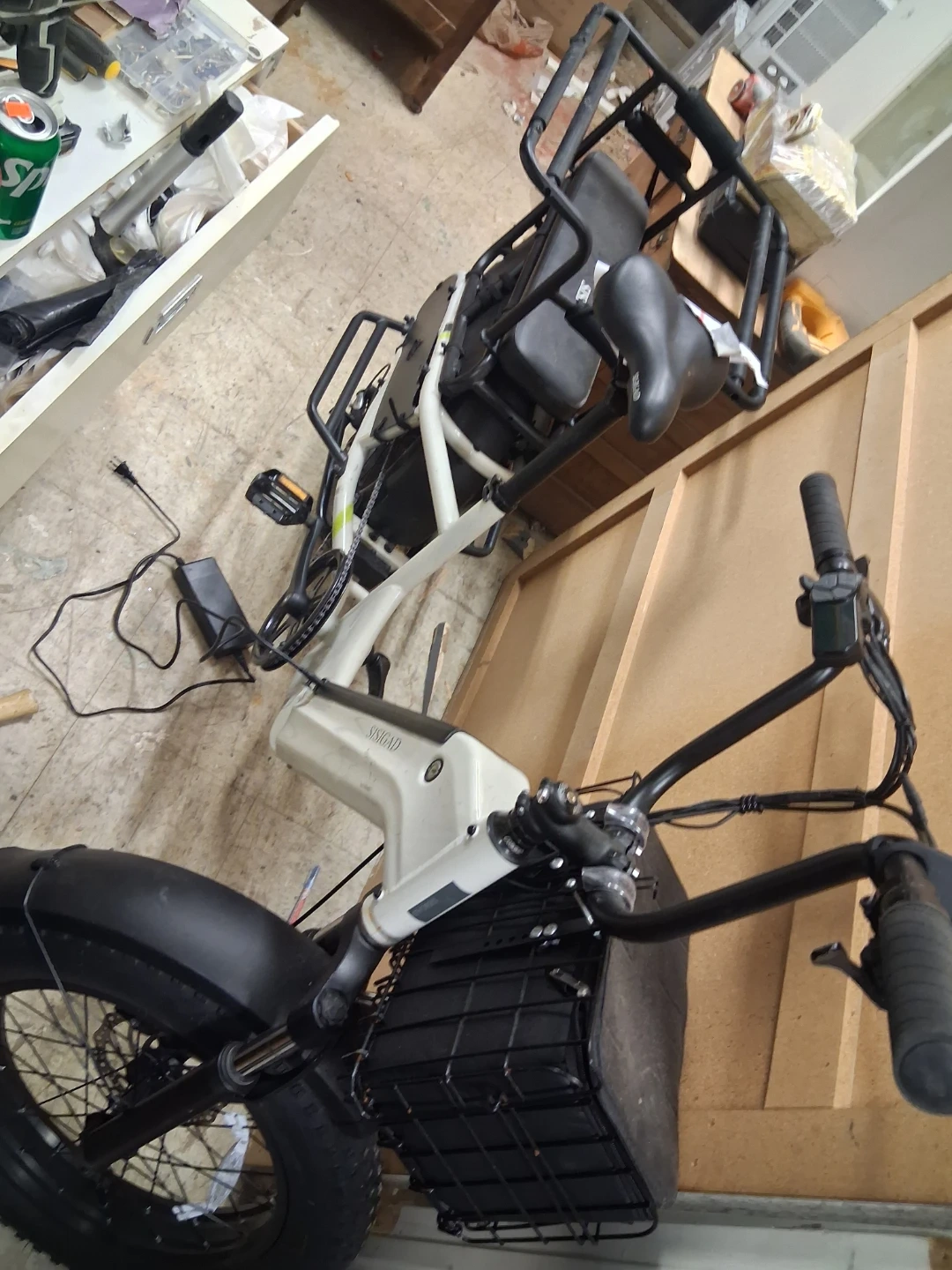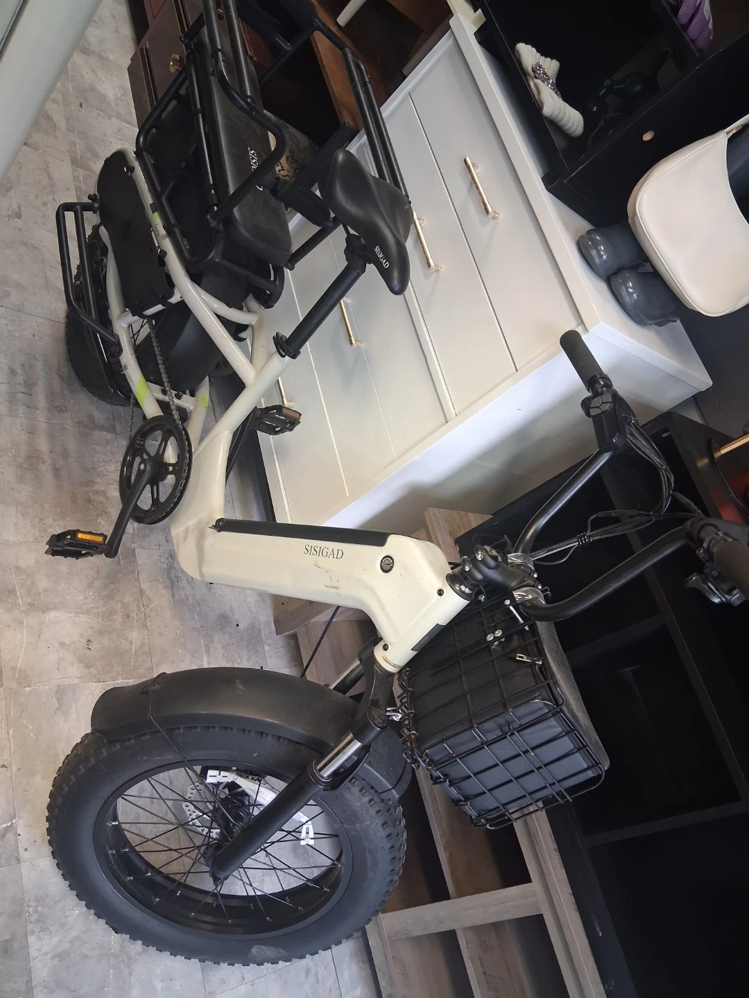 This is a white SISIGAD electric fat tire bike with front and rear racks. It comes with a battery and charger. This bike's fat tires provide excellent traction on various terrains.