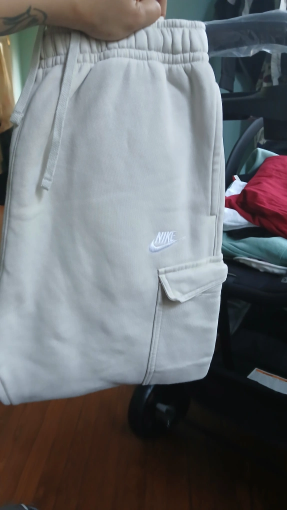 Selling a pair of Nike cargo sweatpants in a cream/beige color! They have a relaxed fit and a comfortable elastic waistband with a drawstring. The pants also feature a cargo pocket on the side
