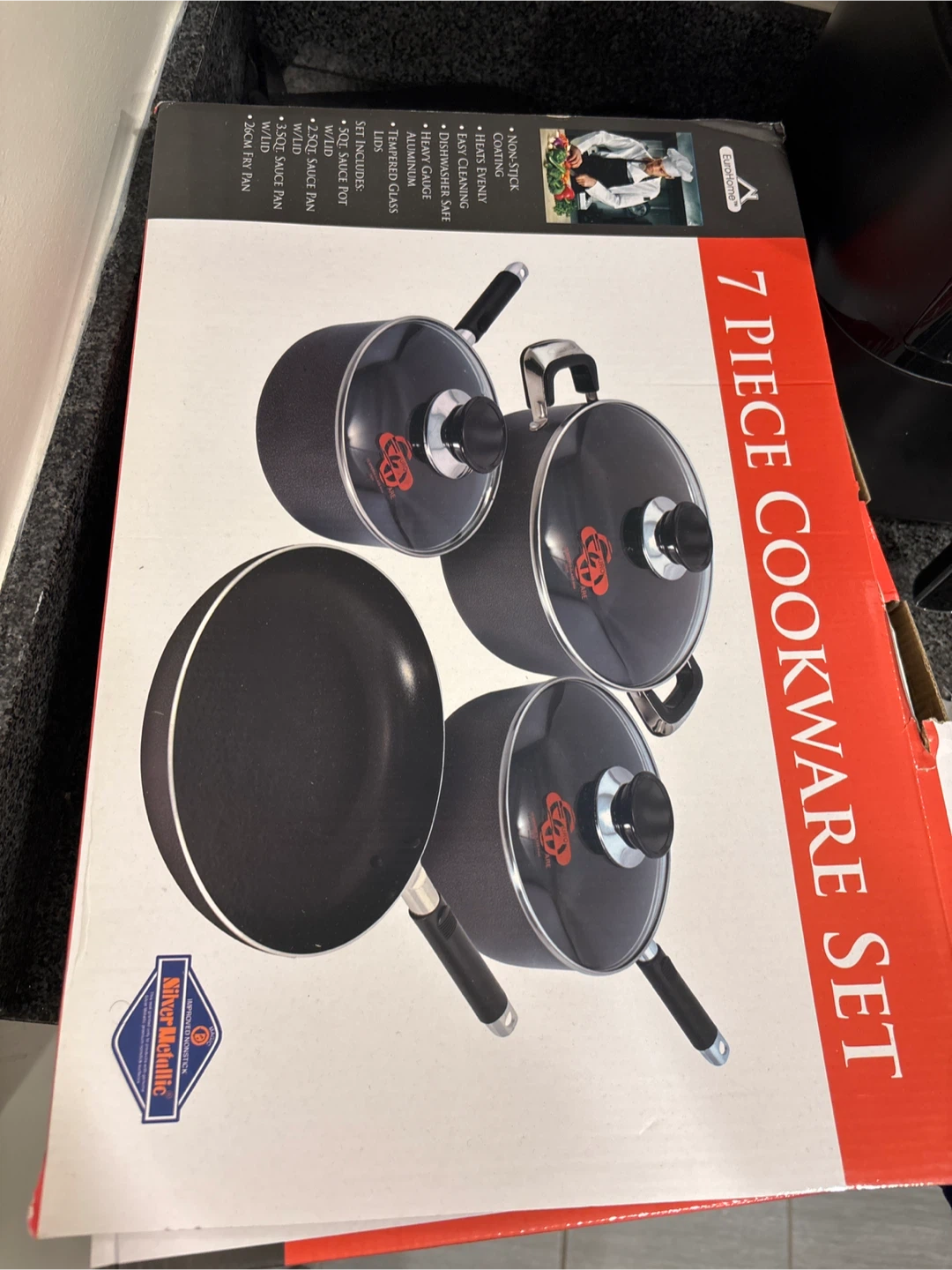 Selling a 7-piece cookware set from EuroHome. The set includes: