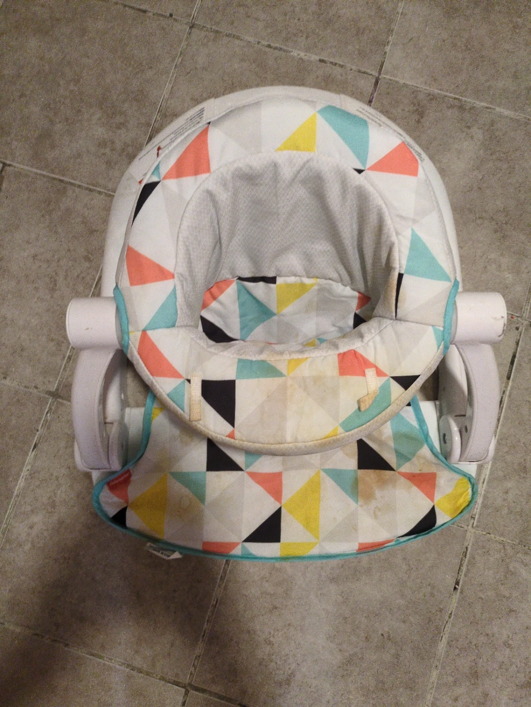 This Fisher-Price infant seat features a colorful geometric pattern. It has a soft, padded insert for comfort. The seat shows some staining on the fabric.
