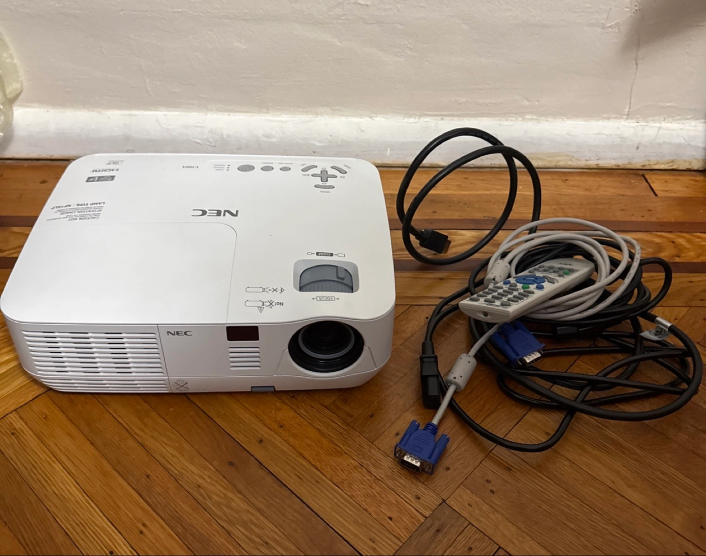 NEC NP-V300X projector. Includes power cord, remote, and various cables. Comes with a black carrying case. Good for presentations or home theater.