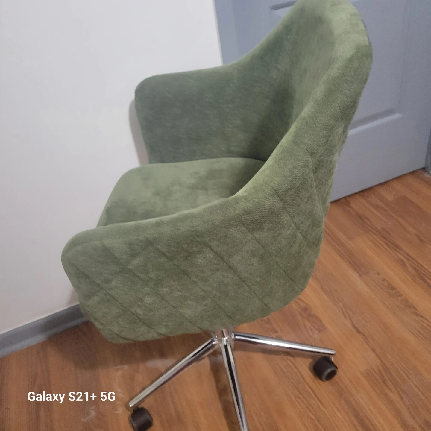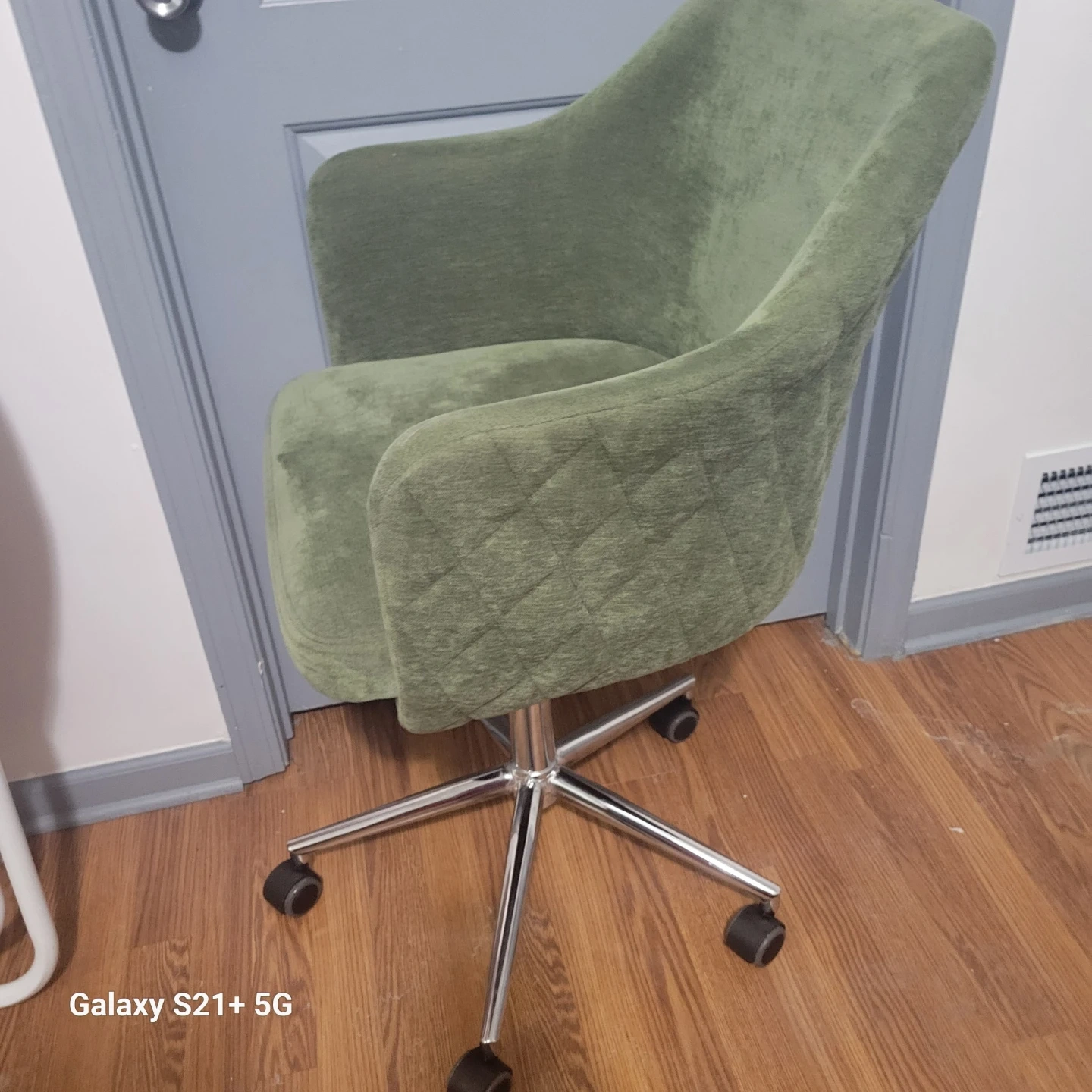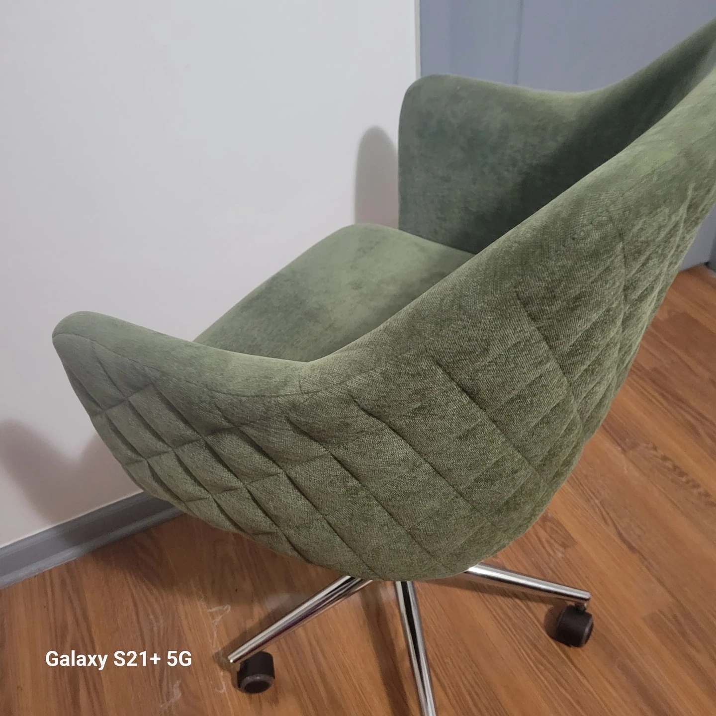 This is a green office chair with a quilted design. It's upholstered in a soft fabric and features a metal base with wheels for easy movement. The chair offers comfortable seating with a supportive backrest.