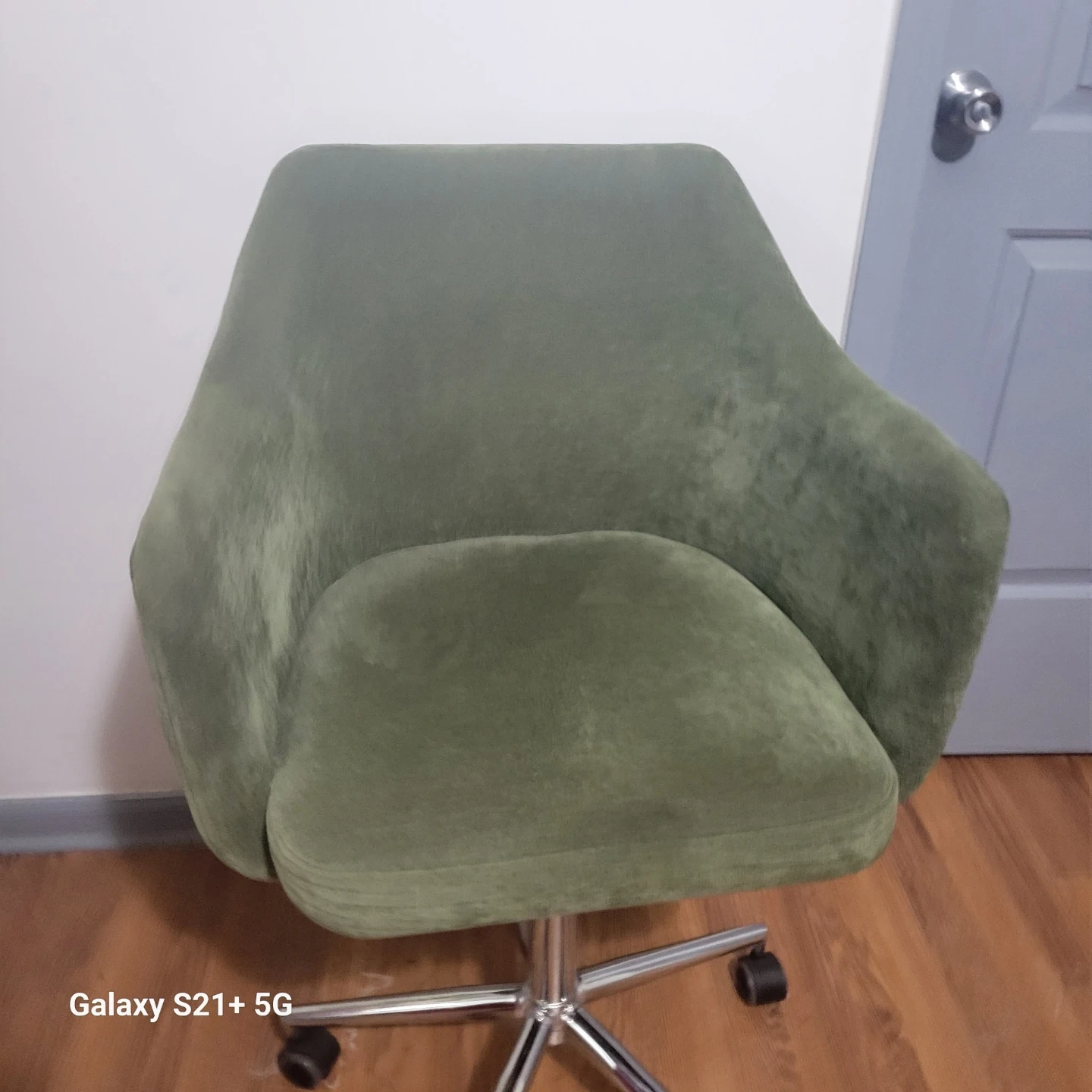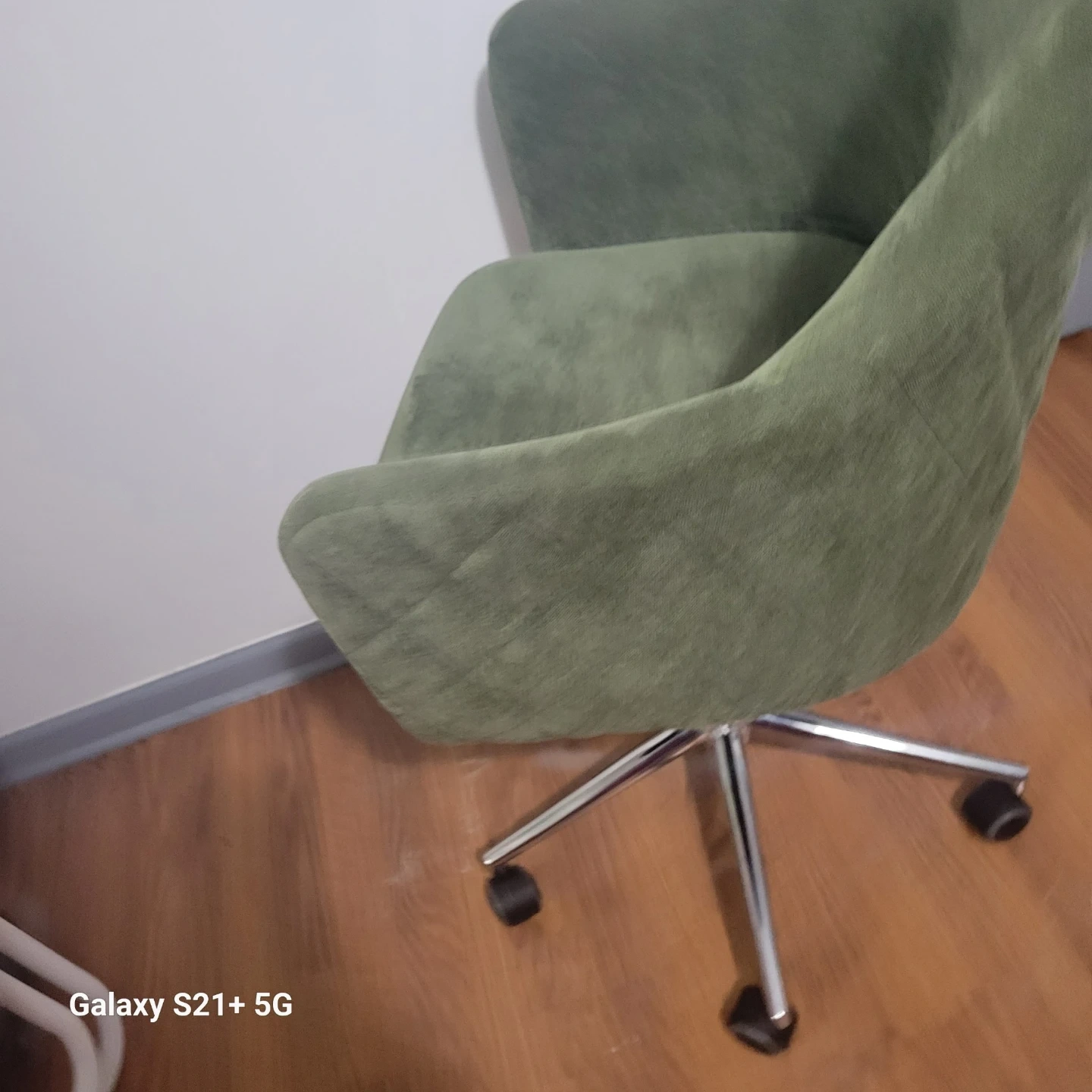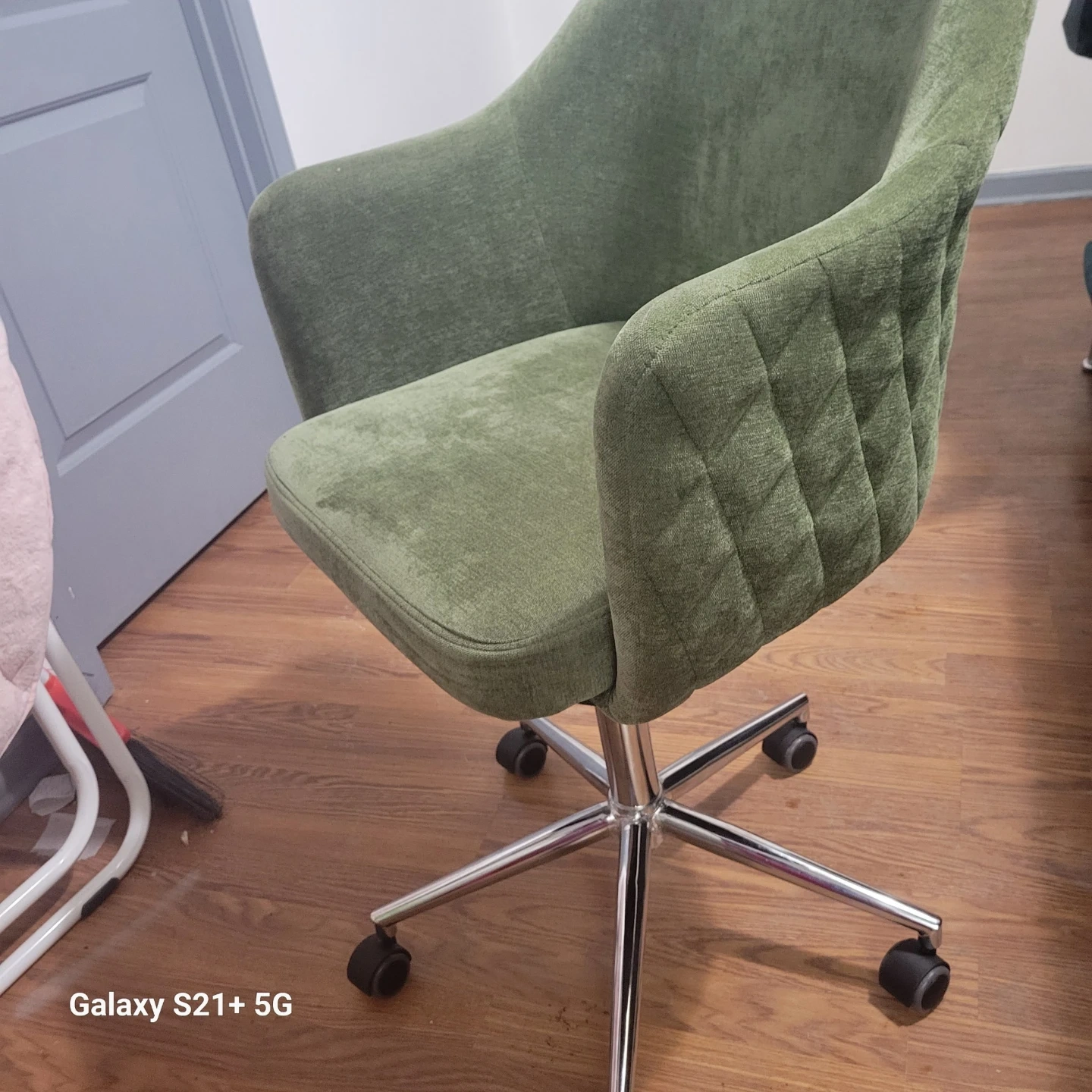 This is a green office chair with a quilted design. It's upholstered in a soft fabric and features a metal base with wheels for easy movement. The chair offers comfortable seating with a supportive backrest.
