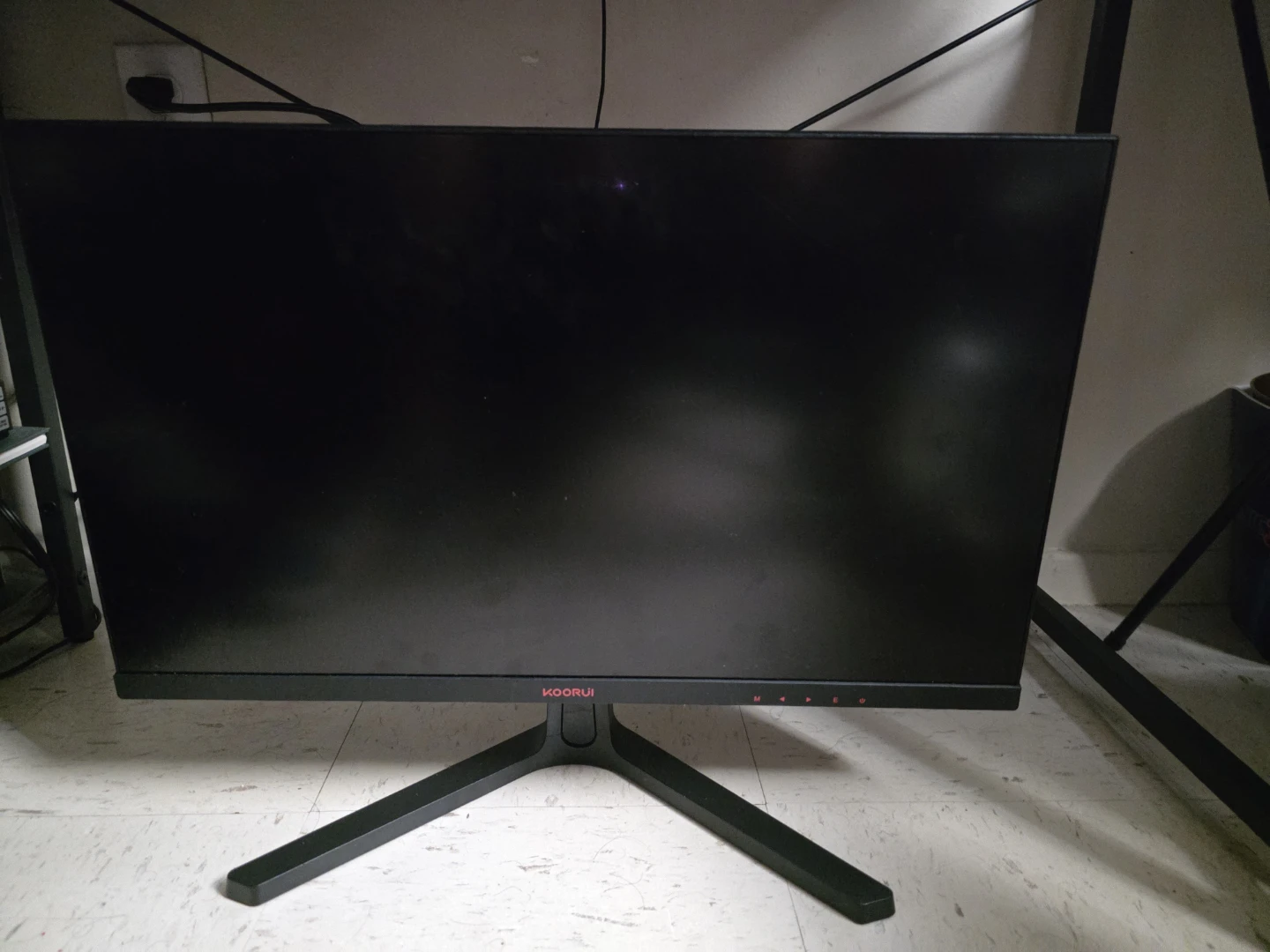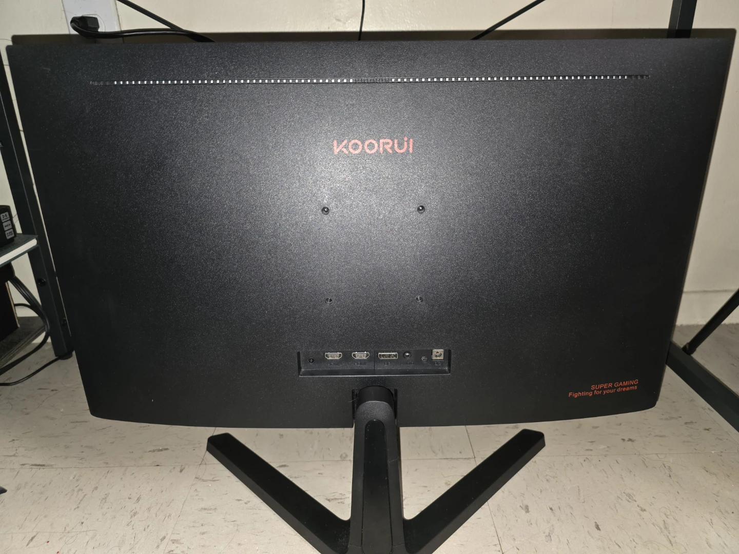 This is a KOORUI gaming monitor. It's black and features a stand. The back has HDMI and DisplayPort inputs.