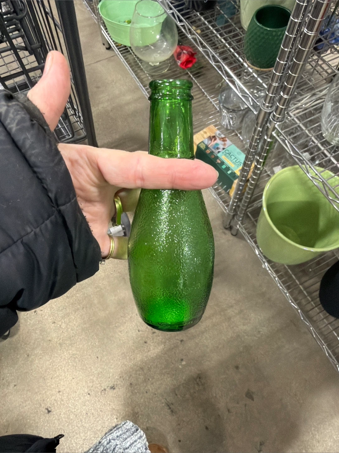 This is a textured green glass bottle. It's great for display or for holding small items. Glass material. Perfect for adding a pop of color to your decor!