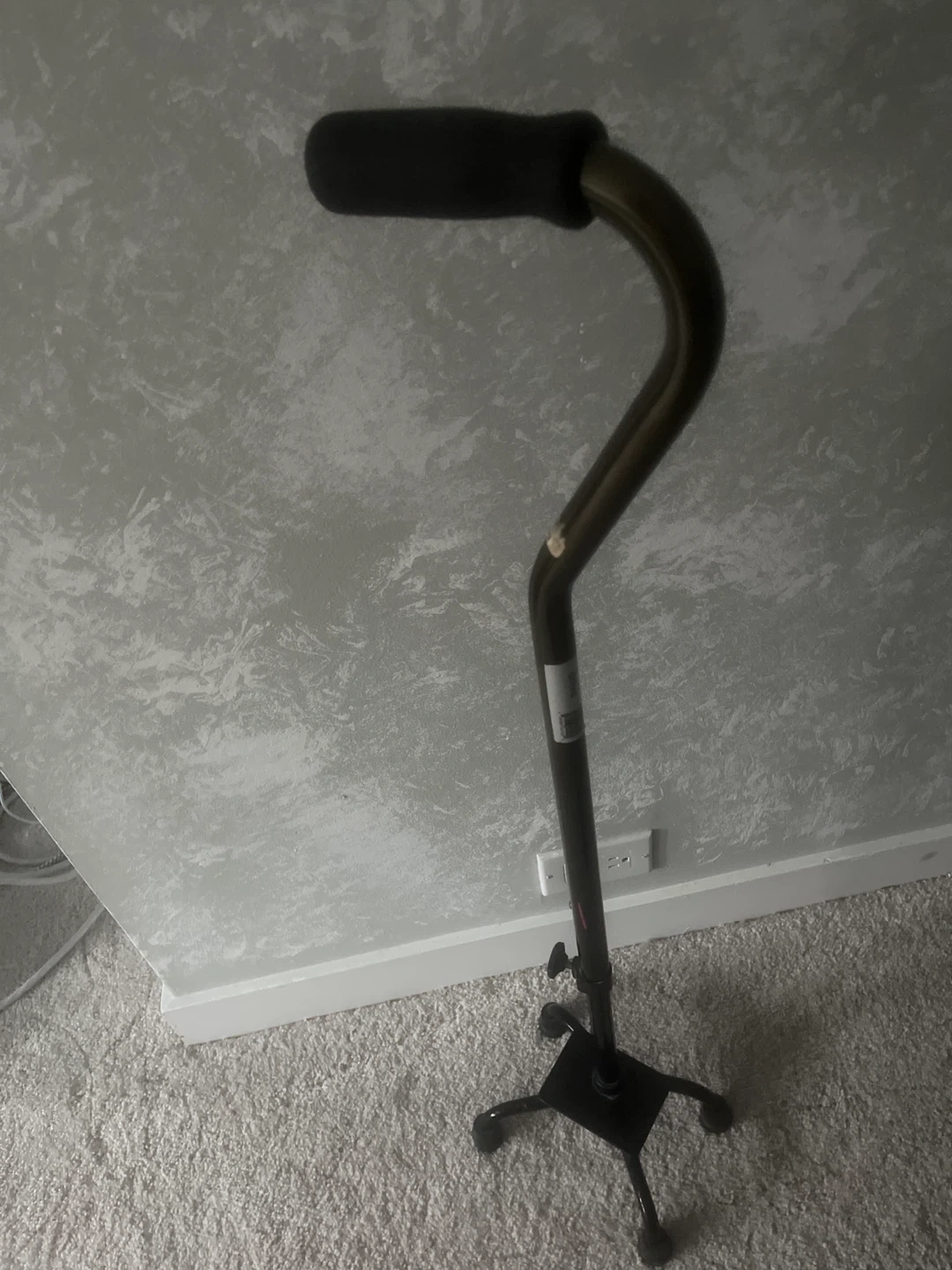 This adjustable quadcane walking cane offers stable support with its four-pronged base. It features a comfortable, ergonomic handle and a durable metal frame. The height is adjustable to suit individual needs.