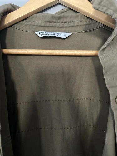 This Zara Basics tan women's long cotton shirt in size Large is a stylish and versatile addition to any wardrobe. Made from soft and breathable cotton, this button-up shirt features a classic brown color and a basic style that can be easily paired with jeans or trousers for a casual or more polished look. The regular fit and long length make it a comfortable and flattering option for everyday wear.
