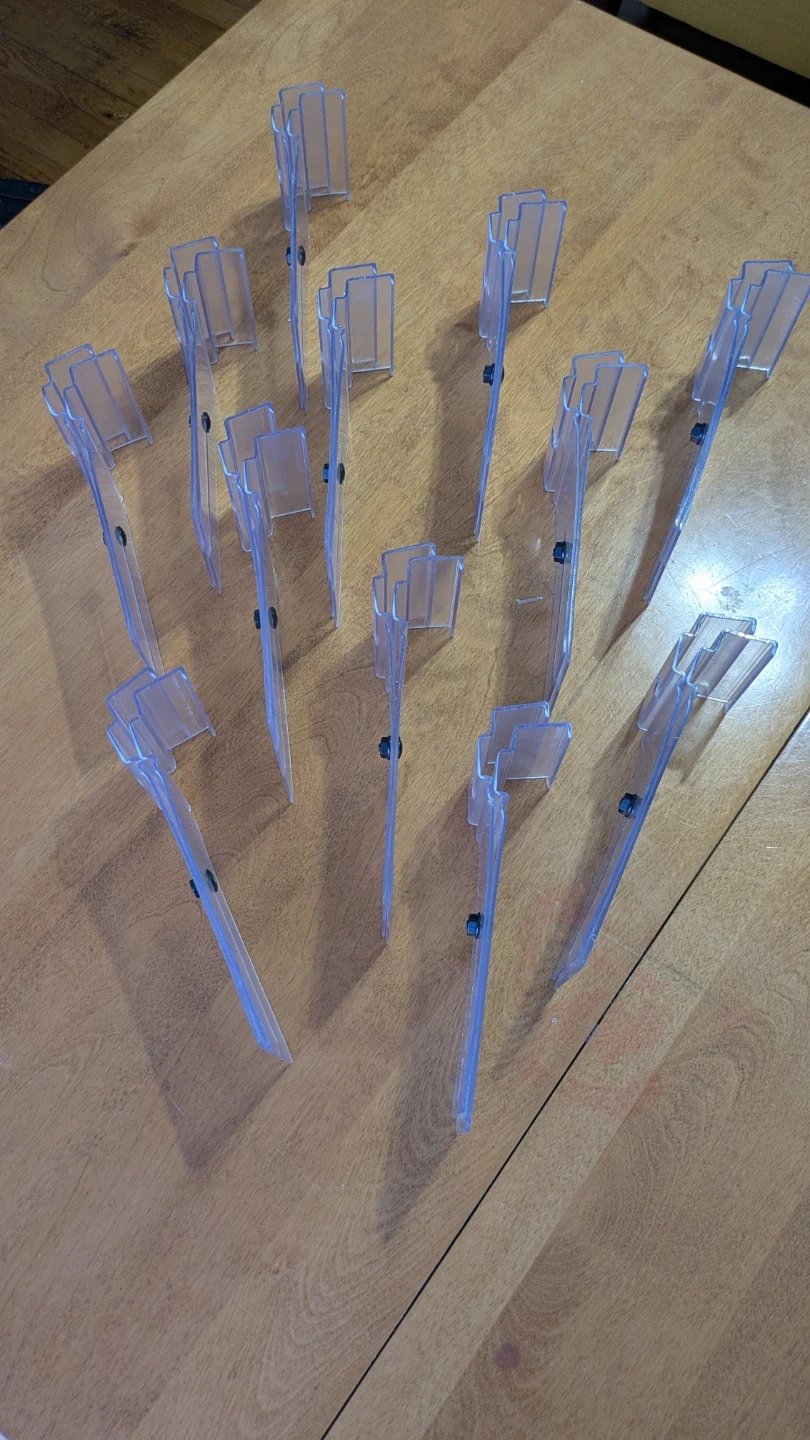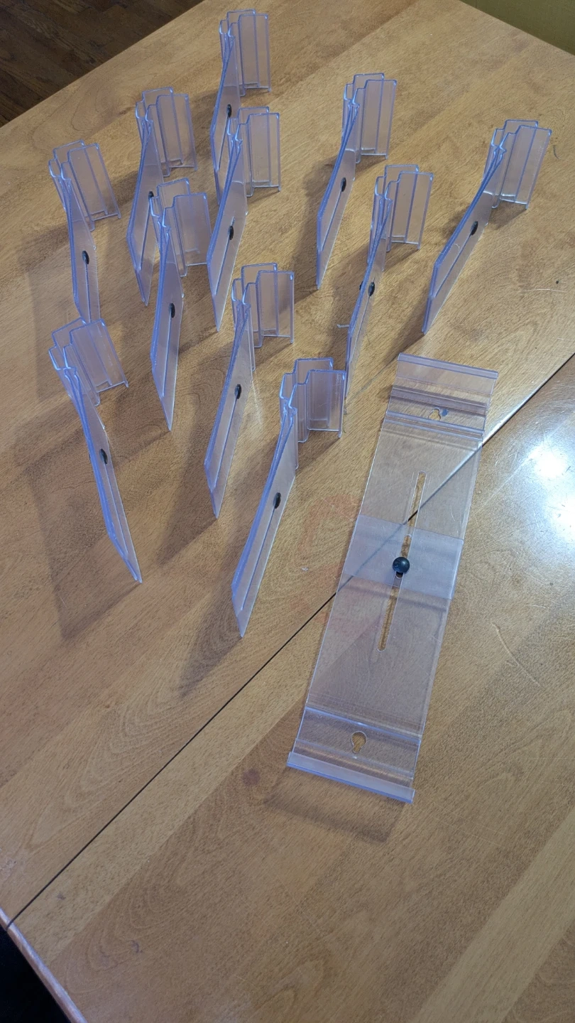 These clear plastic mounts are perfect for displaying your vinyl record collection on the wall. They're made of durable plastic and come with a screw for easy installation. This lot includes 13 mounts.