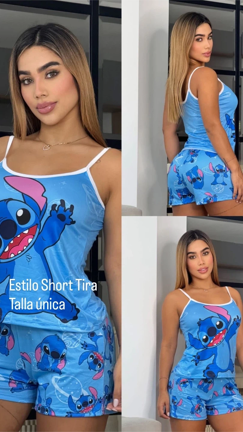 This cute pajama set features iconic characters like Hello Kitty, Stitch, and Mickey Mouse. It's perfect for lounging or sleeping! Available in shorts and long pants styles.