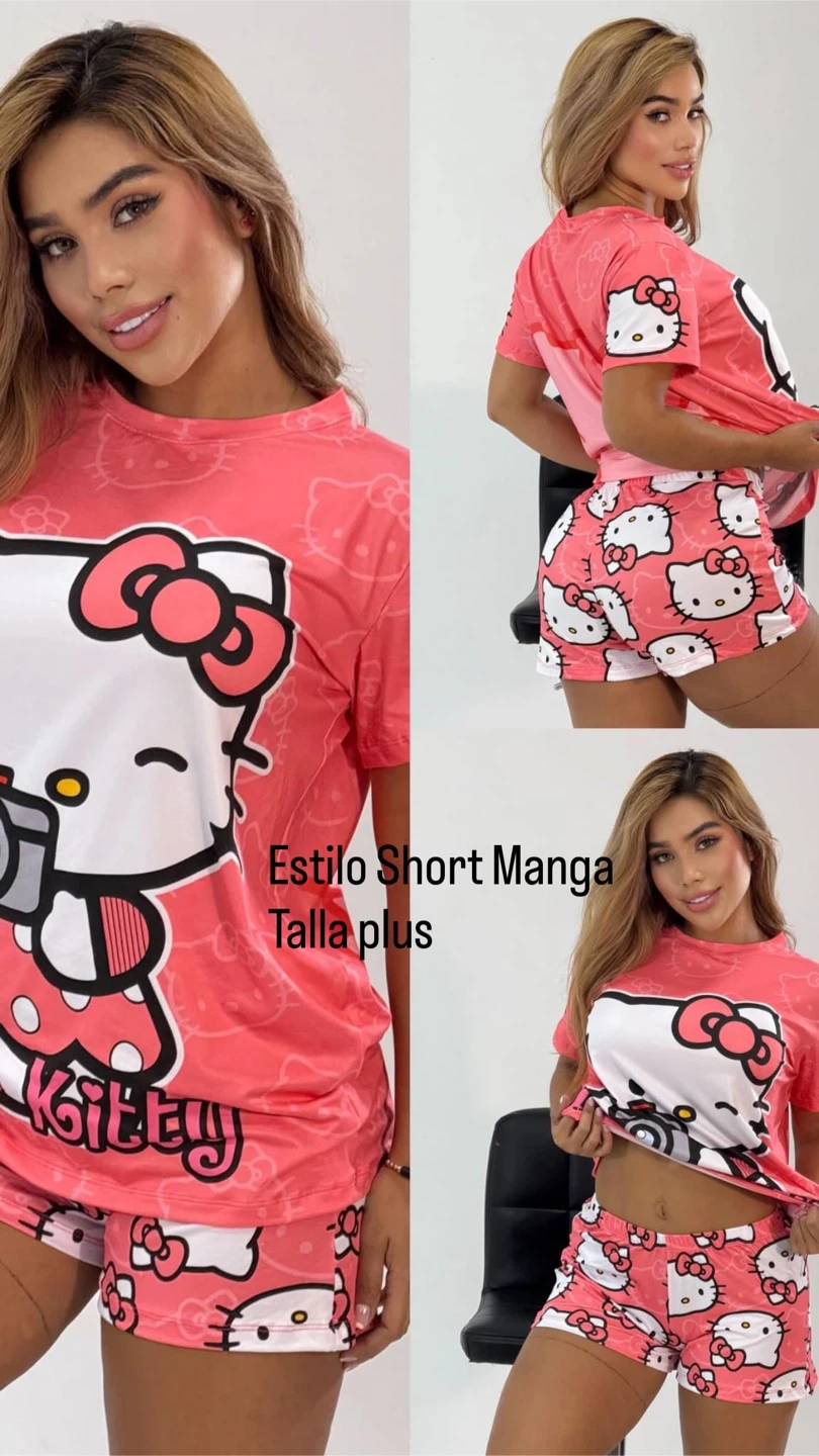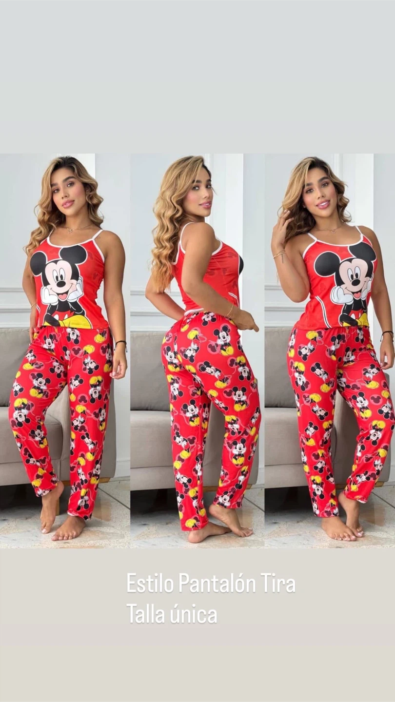 This cute pajama set features iconic characters like Hello Kitty, Stitch, and Mickey Mouse. It's perfect for lounging or sleeping! Available in shorts and long pants styles.