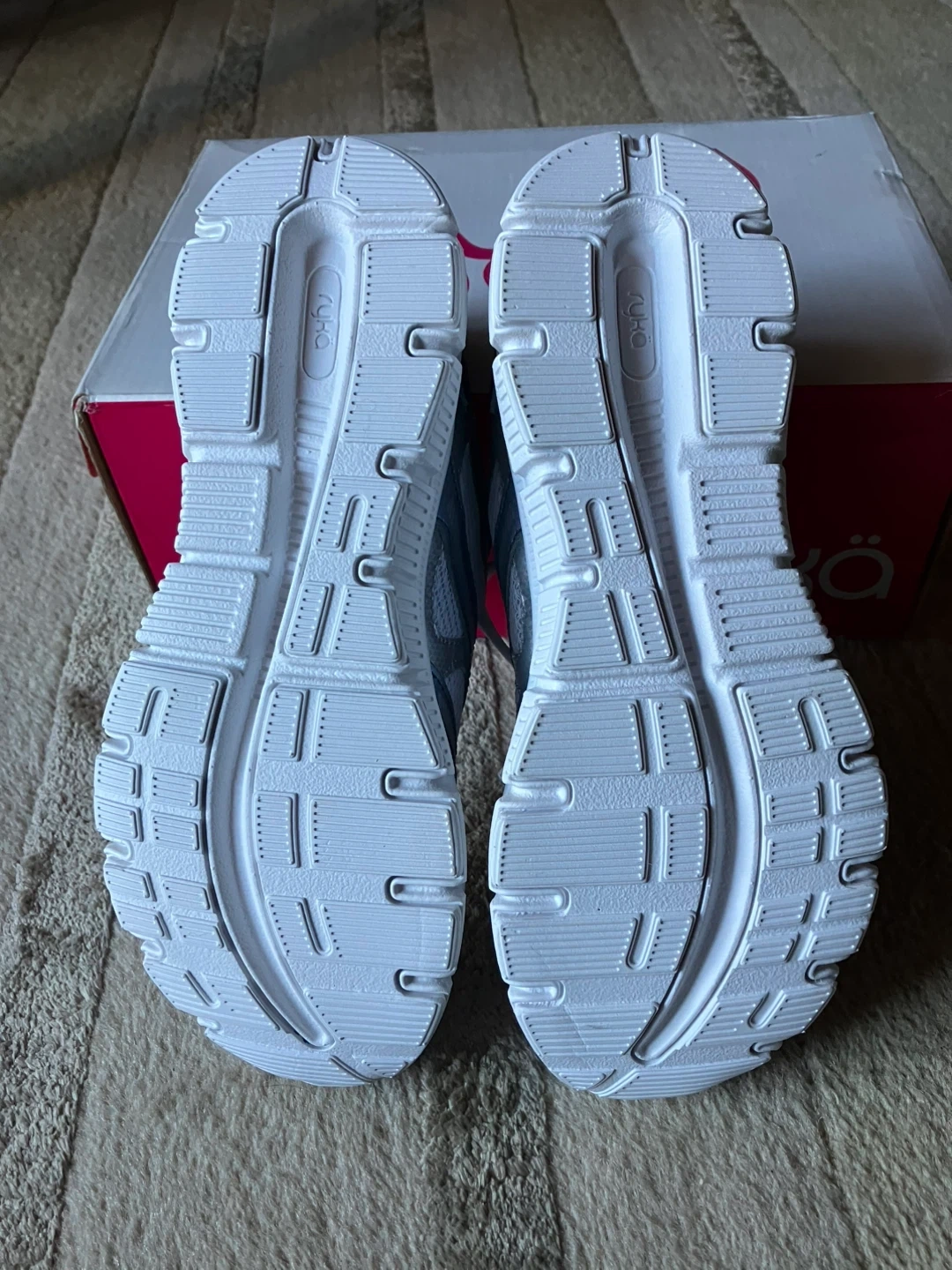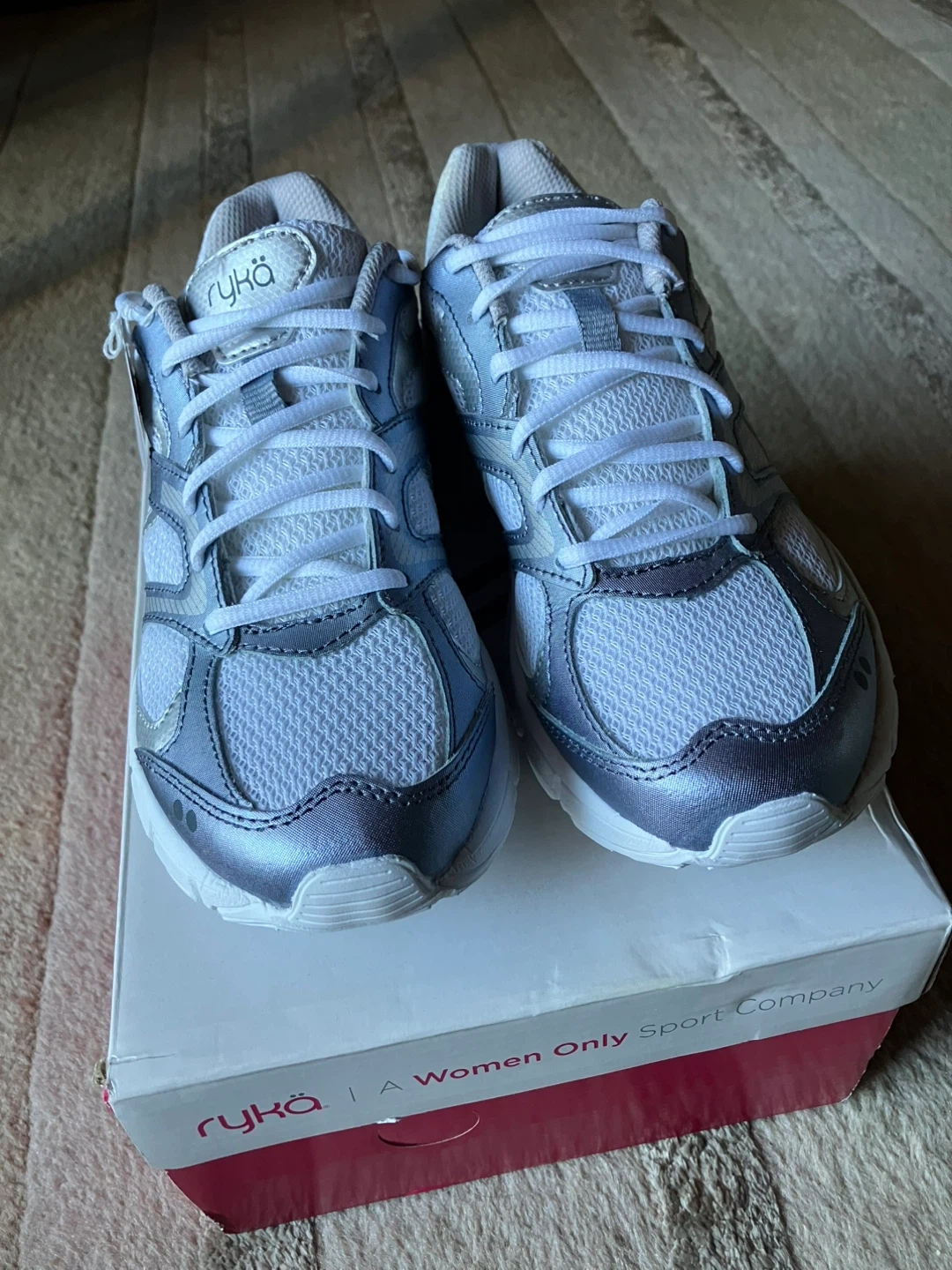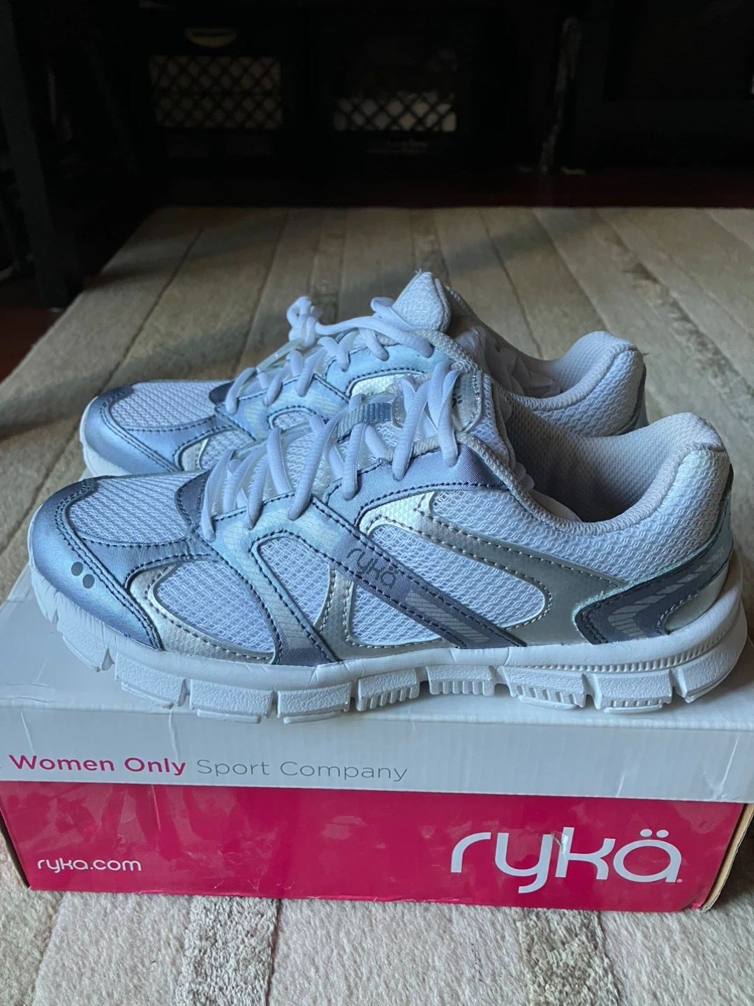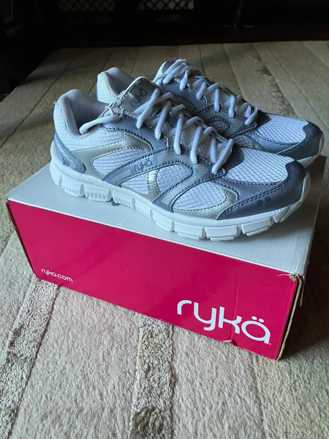 443Ryka Harmony SMT training shoes in white, silver and blue! These are a women's size 7.5 M. They feature memory foam for extra comfort during your workouts. New never worn, with the original box! Cash and pick up only.