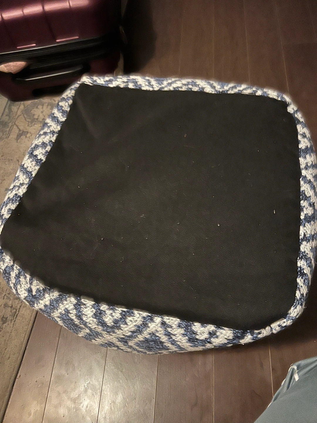 Blue and white patterned pouf ottoman with a black bottom. Great for extra seating or as a footrest. Never used so it’s in very good condition.