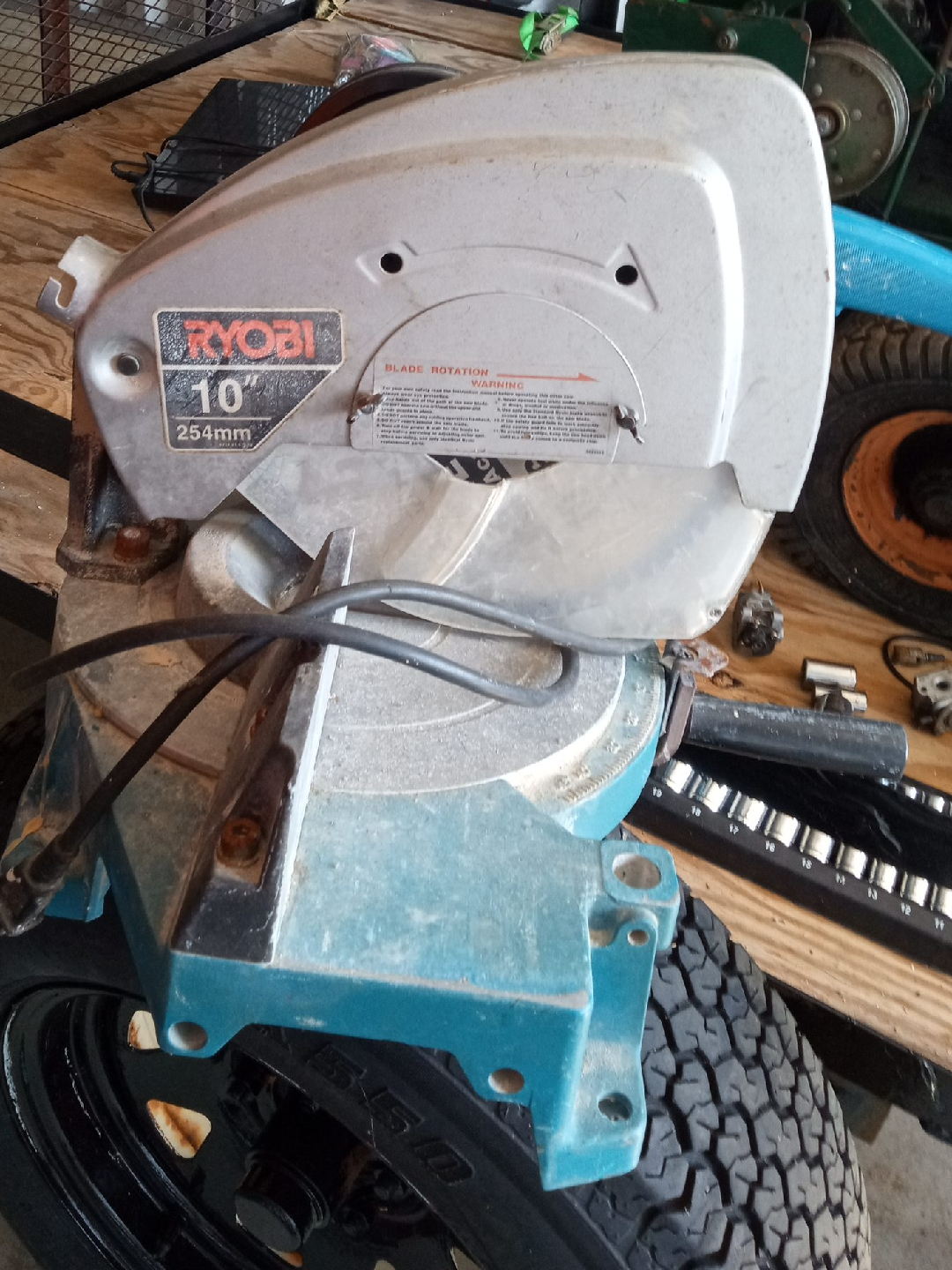 Selling a Ryobi miter saw with a 10-inch (254mm) blade. It's in used condition, but still works great for cutting wood and other materials. Perfect for DIY projects or professional use!