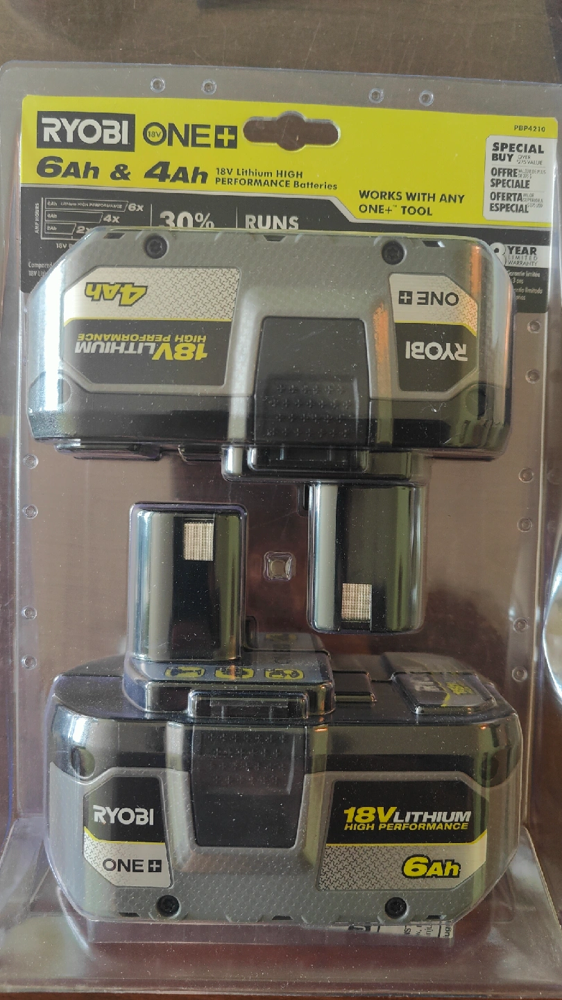 I have a new set of Ryobi ONE+ 18V Lithium High Performance Batteries, including both a 6Ah and a 4Ah battery. They work with any ONE+ tool. The packaging is included.
