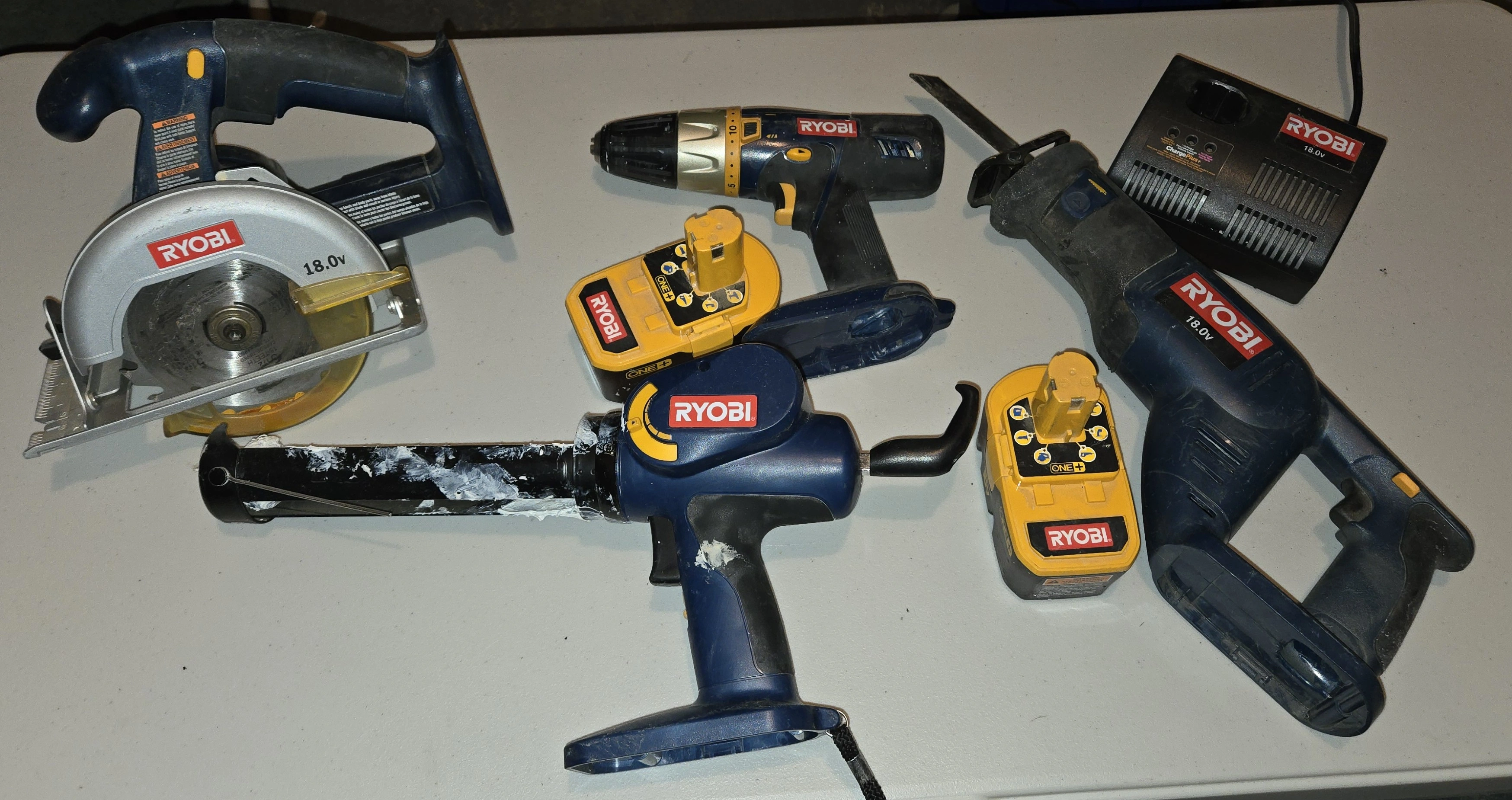 10Winter cleaning and getting rid of a bulk Ryobi tool set. Used but all tools fully functional! Includes: Ryobi 18V battery charger, 2 18v batteries, 18v circular saw, 18v drill, 18v reciprocating saw and 18v caulk gun.