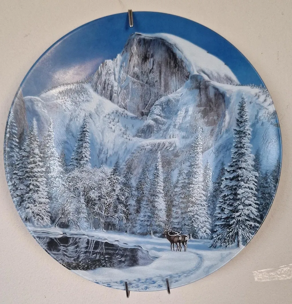 This decorative plate features a beautiful winter landscape with snow-covered mountains and pine trees. A serene pond reflects the scenery, and a pair of deer stand near the water's edge. It's a lovely piece to add to any collection!