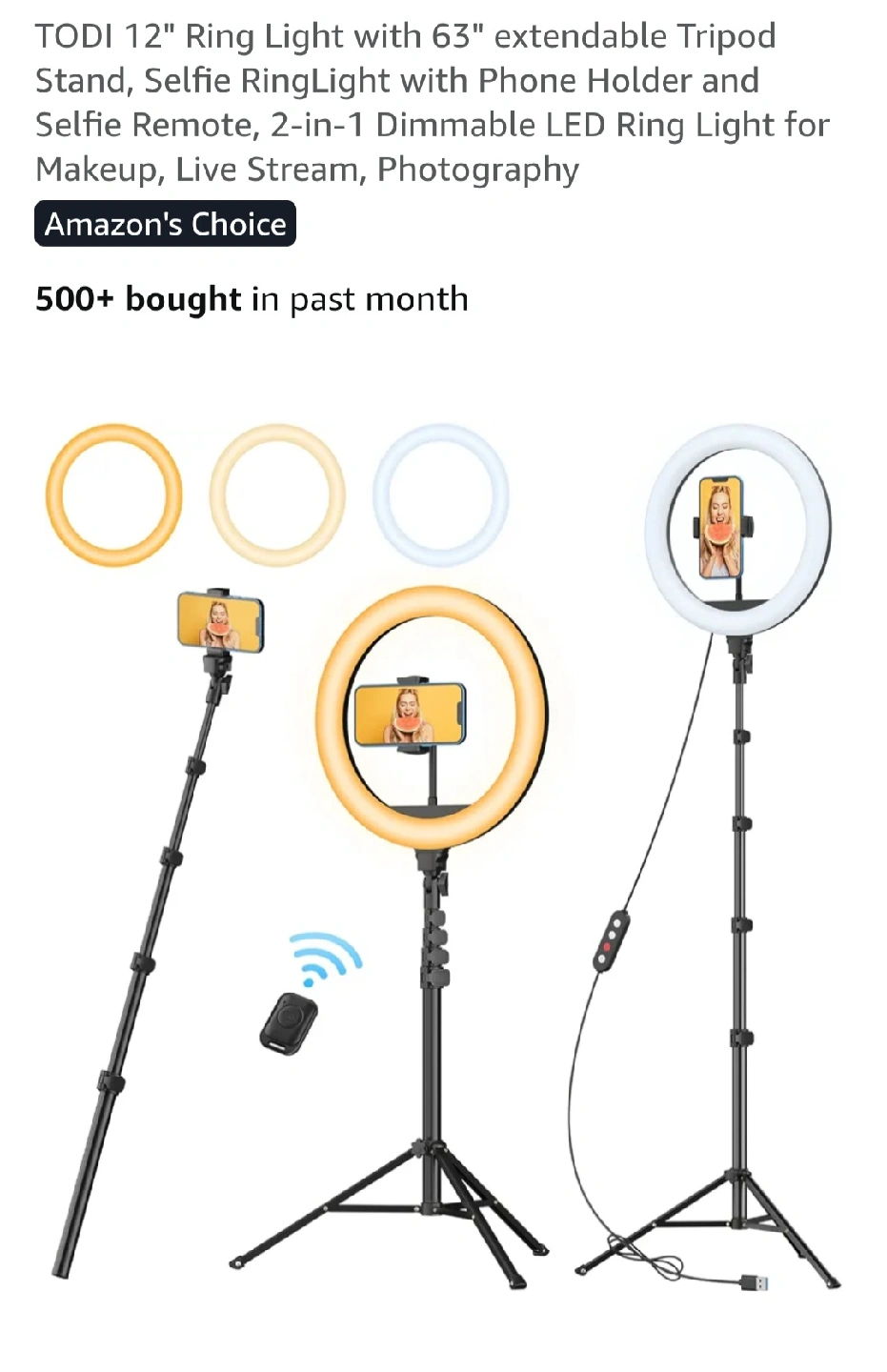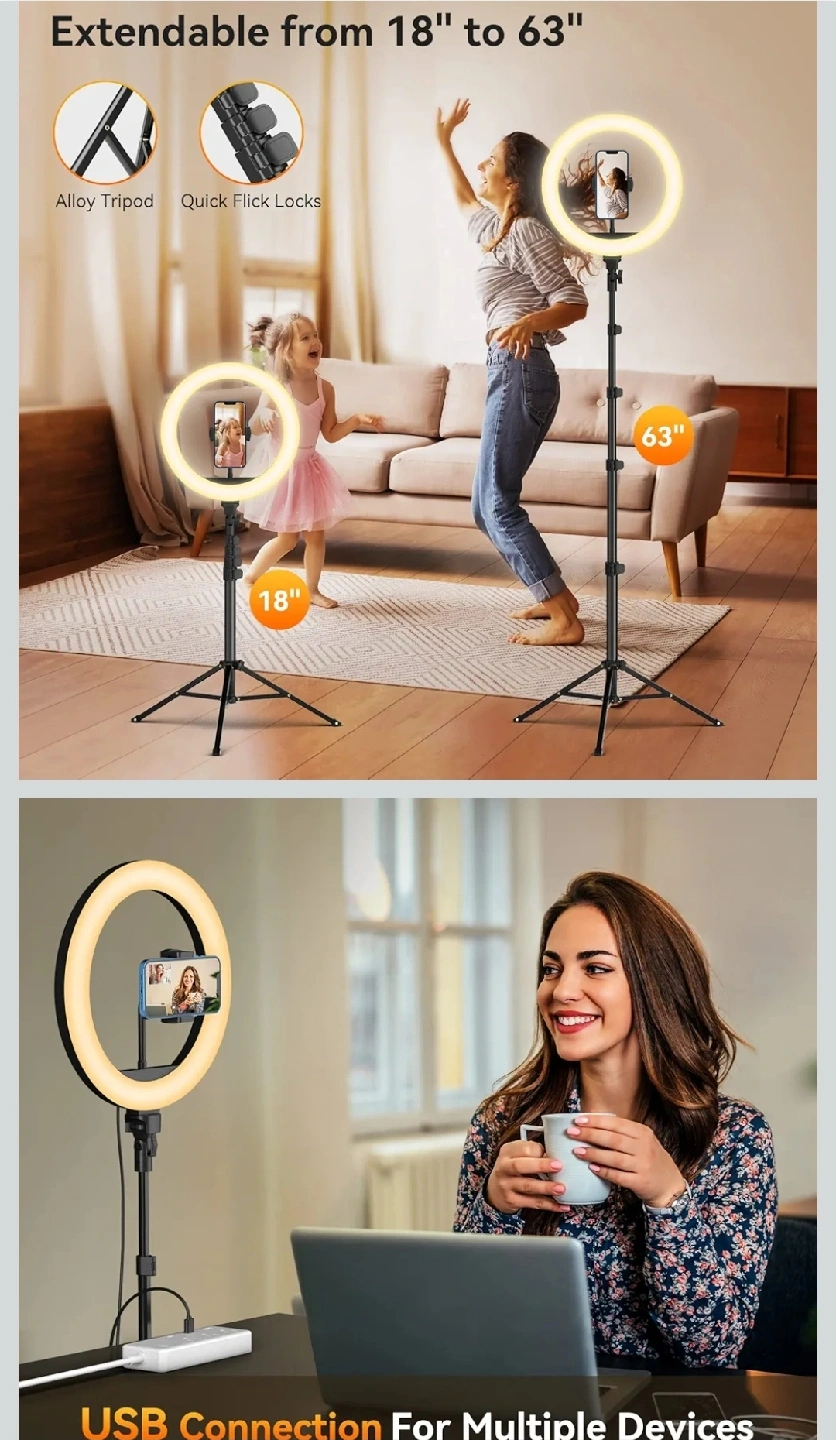 I'm selling a 12" ring light, complete with a 63" extendable tripod stand. It also comes with a selfie remote and a phone holder. This 2-in-1 dimmable LED ring light is perfect for makeup, live streaming, and photography. It's extendable from 18" to 63" and features an alloy tripod with quick flick locks. It also has a USB connection for multiple devices