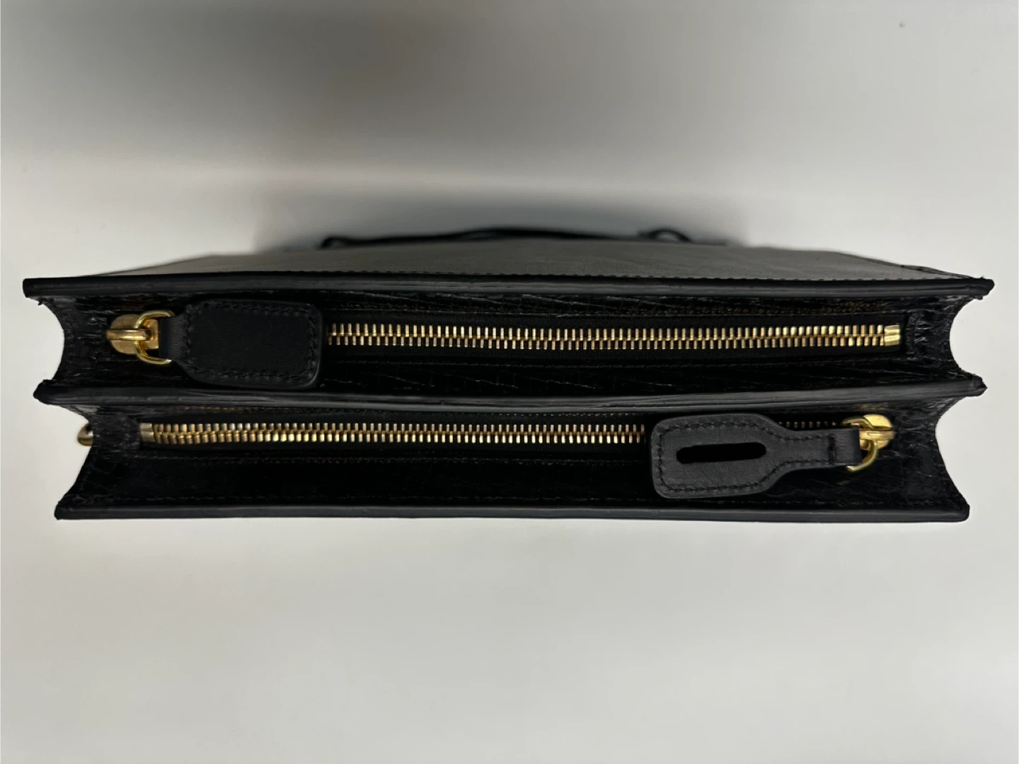 This stylish clutch features a black calf leather exterior with a distinctive snakeskin embossed panel to slide your hand thru for carrying the clutch. It's designed with two zippered compartments for organization. Gold-tone hardware adds a touch of elegance. Crossbody strap included.
