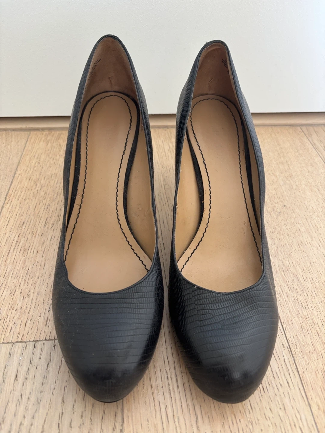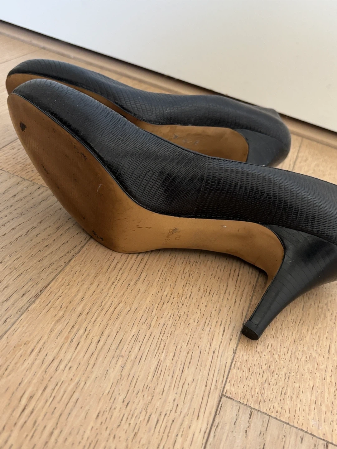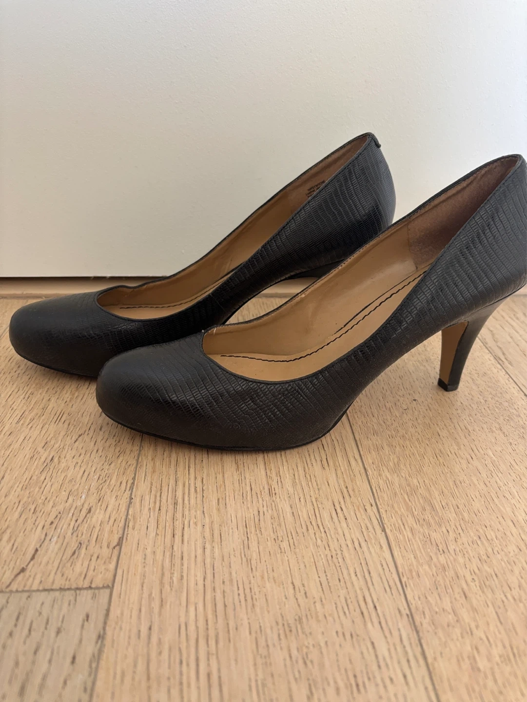Classic black embossed leather heels from Nine West. Features a comfortable balance man-made sole and a leather upper. Size 10M.